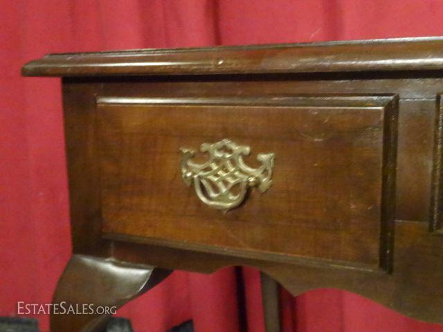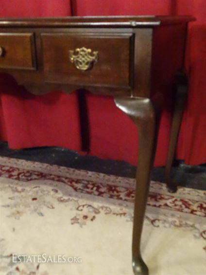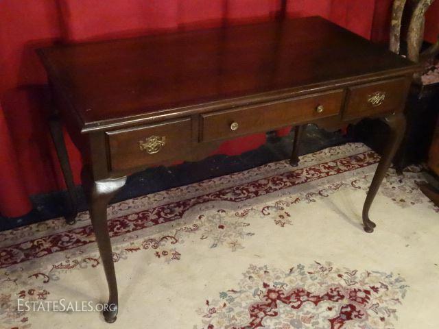 LOT 136A: QUEEN ANNE STYLE DESK, 3 DRAWERS WITH BRASS PULLS, VERY GOOD GENTLY USED VINTAGE CONDITION APPROX 46" X 28" X 30, SKU148