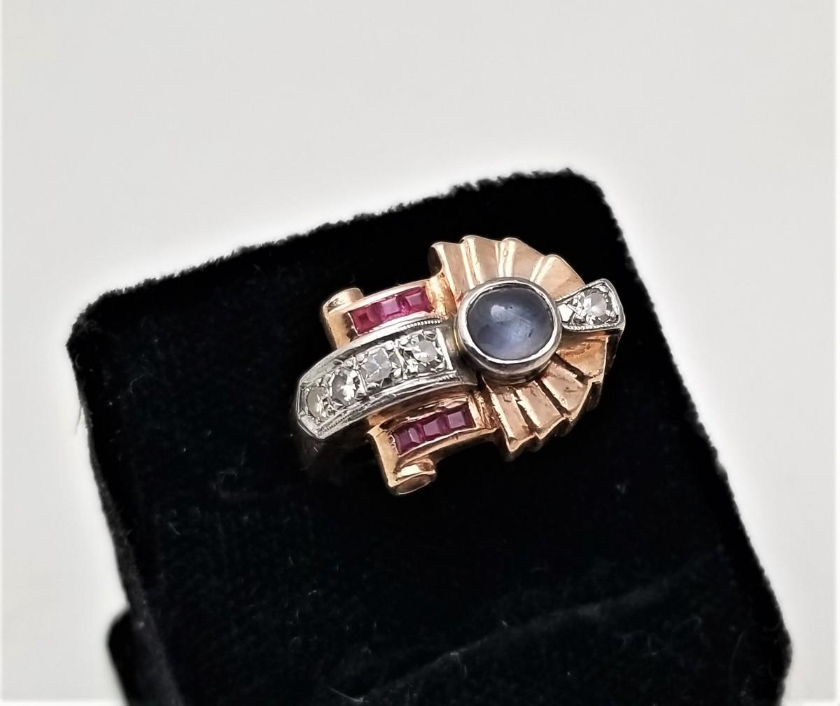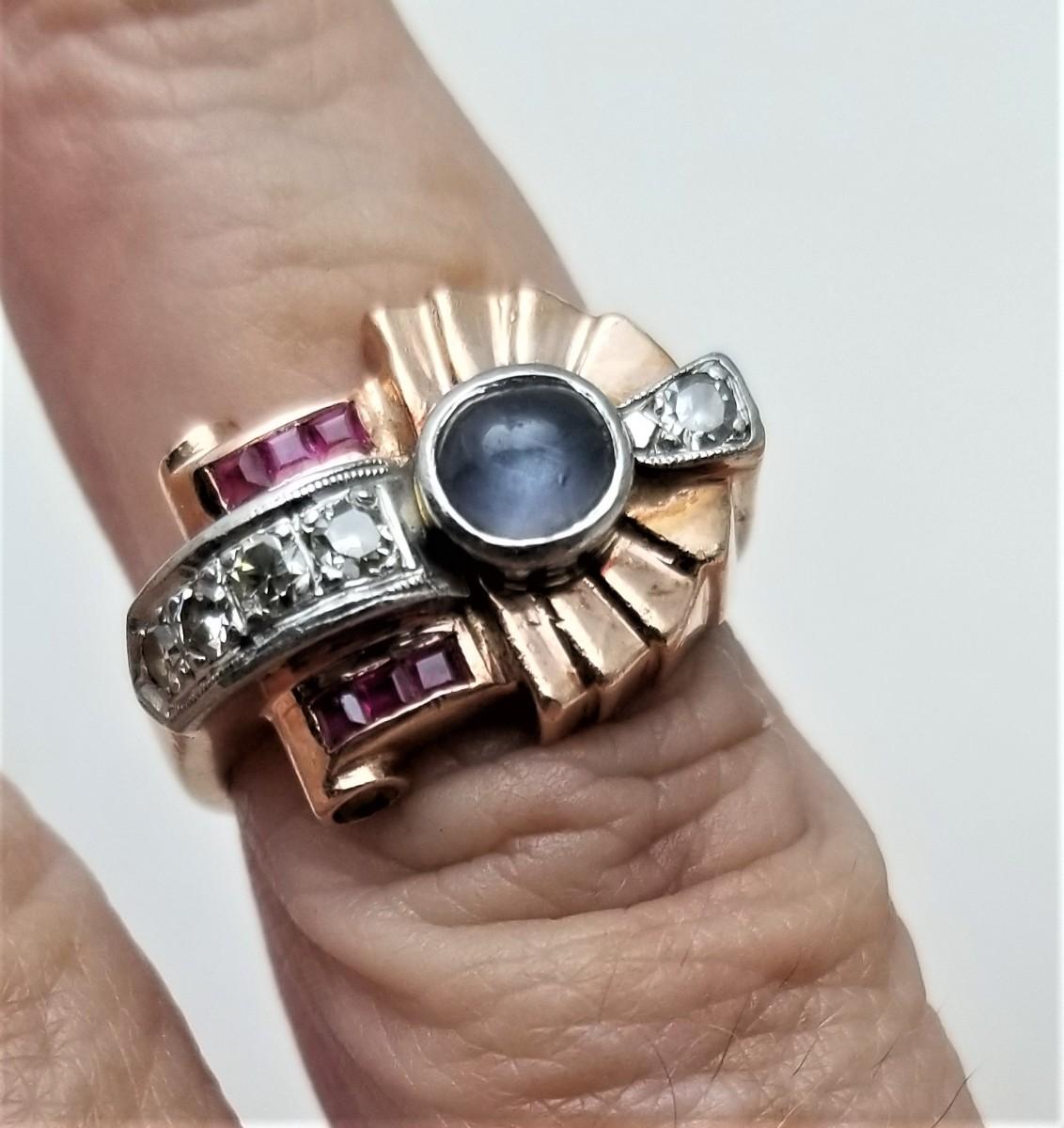 Antique Art deco ring - 14kt rose gold - set with a moonstone and 5 twinkly diamonds that bring the total carat weight to a little over a half carat. Not sure if the small rubies are real or costume. Ring is size 6.5 - excellent condition - has a great look. The scrap value of the gold in this ring is $225.00.
