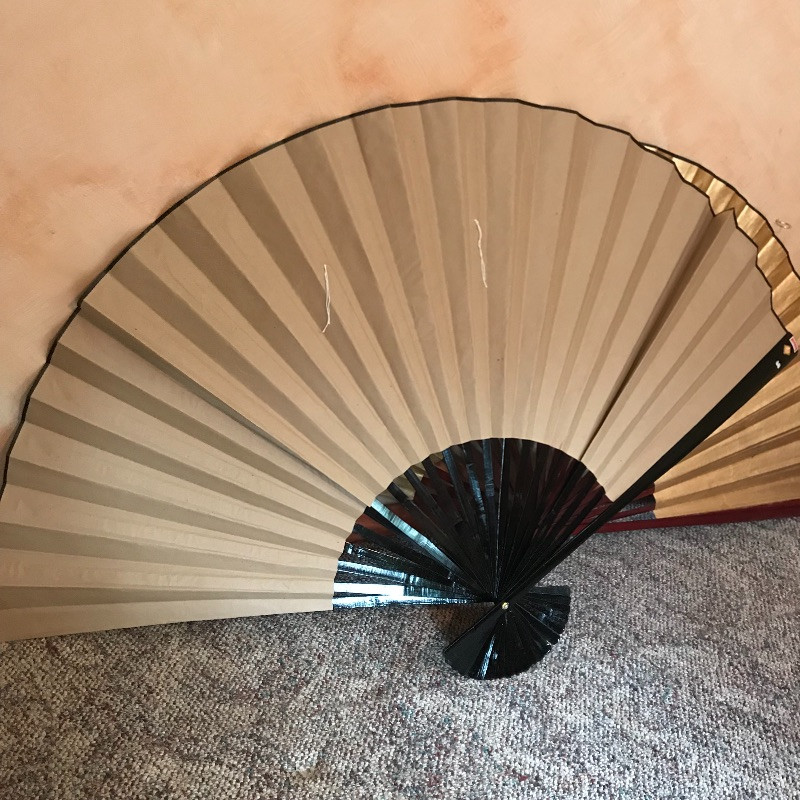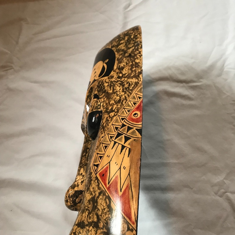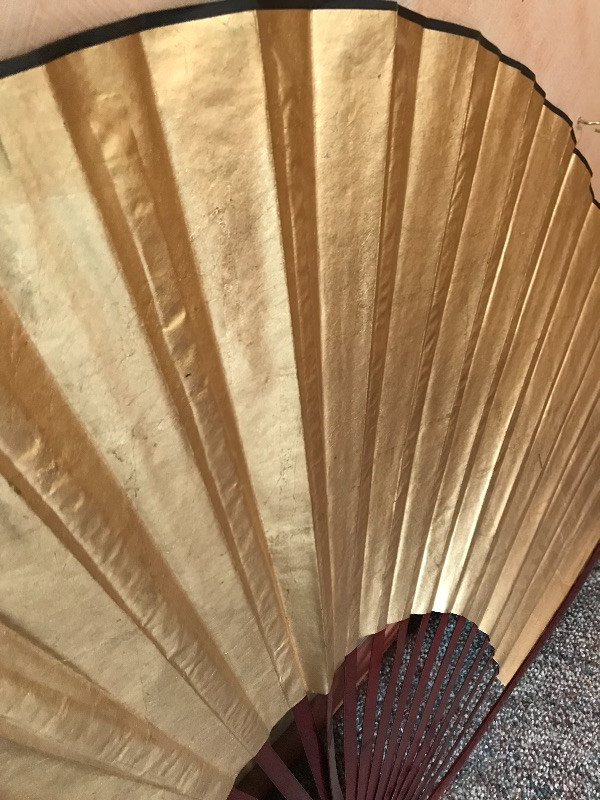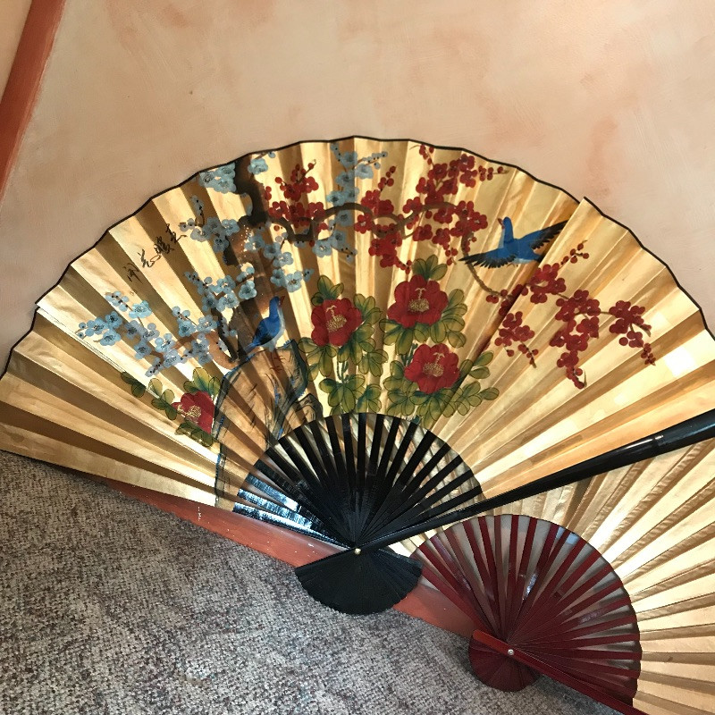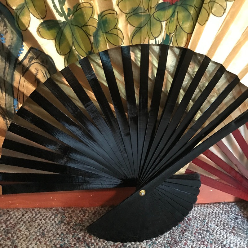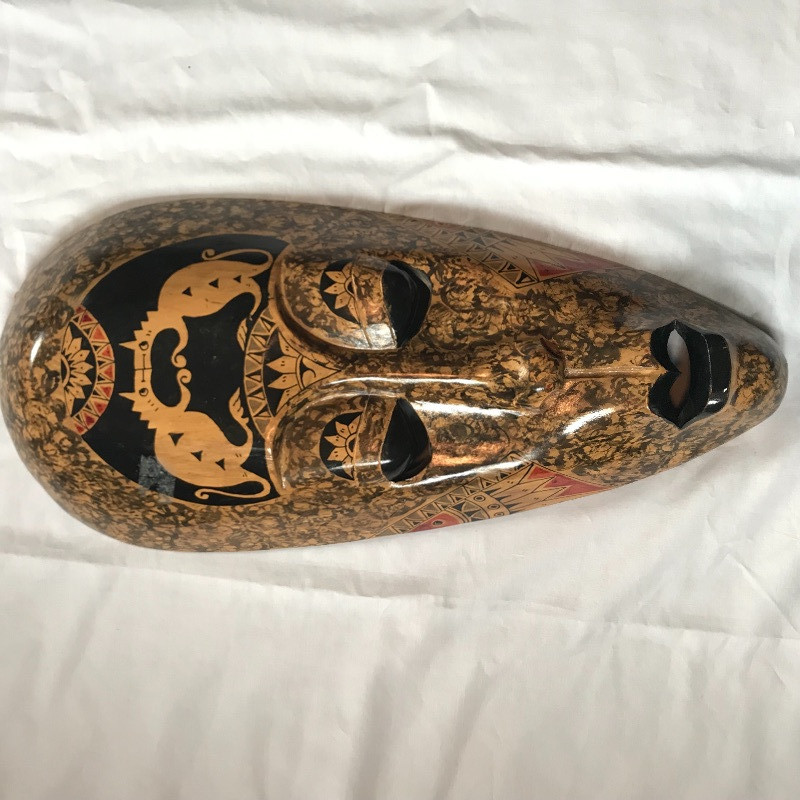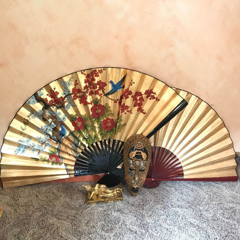 Two lovely Asian wall fans appear to be fashioned from paper and bamboo. One has a lovely painted scene while the other is simply gold elegance. Both fans measure approximately 62” x 34” and have strings attached to the backside for hanging. Fans are accompanied by a laying gold colored statuette, presumably made of plaster and a carved and painted wooden mask. The mask has a small blemish that appears to be from a price tag. Piece measures 9” x 19.75” and also has a fashioned string for hanging. See photos. Local pick up only.