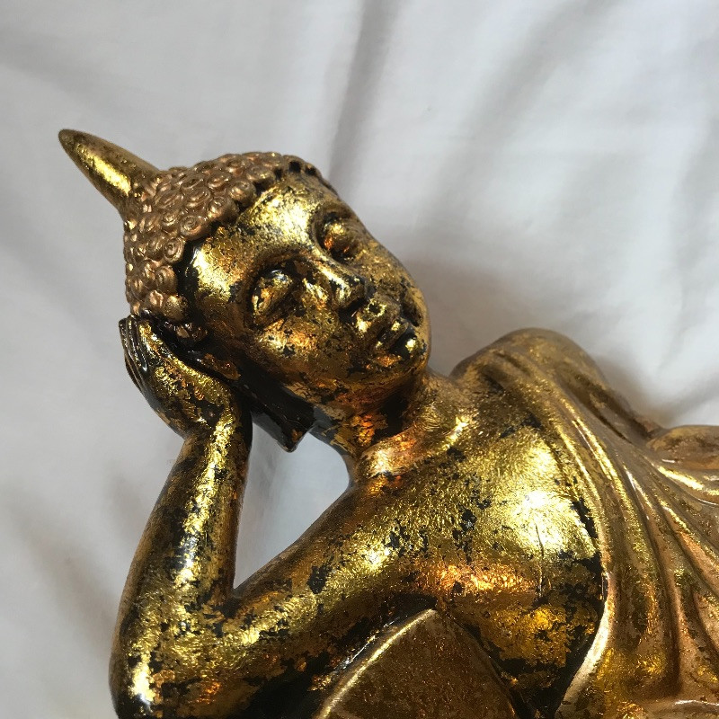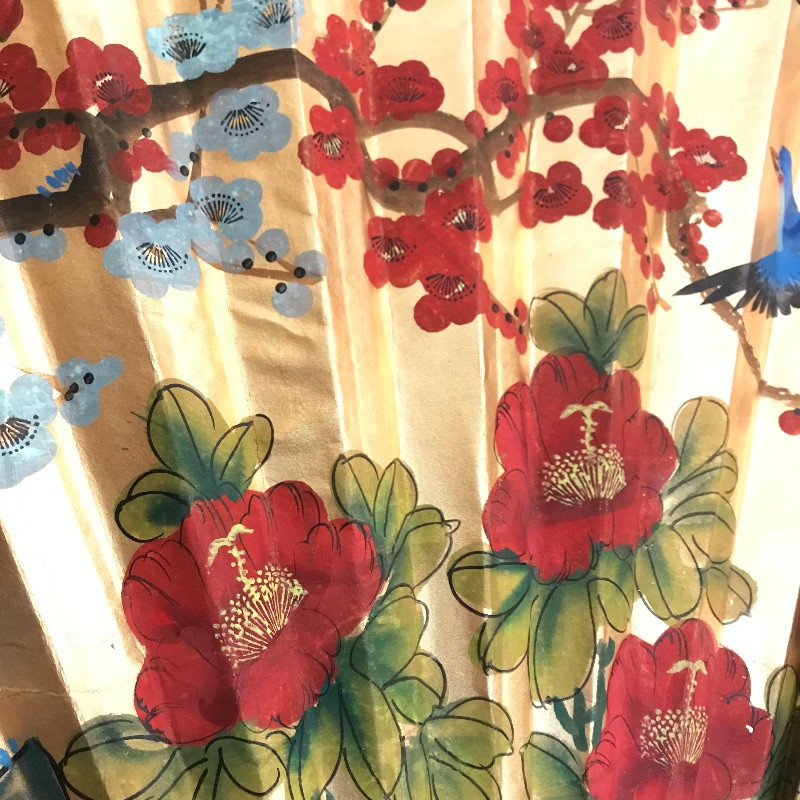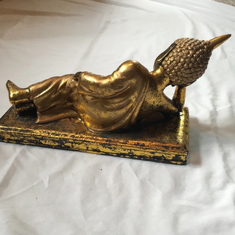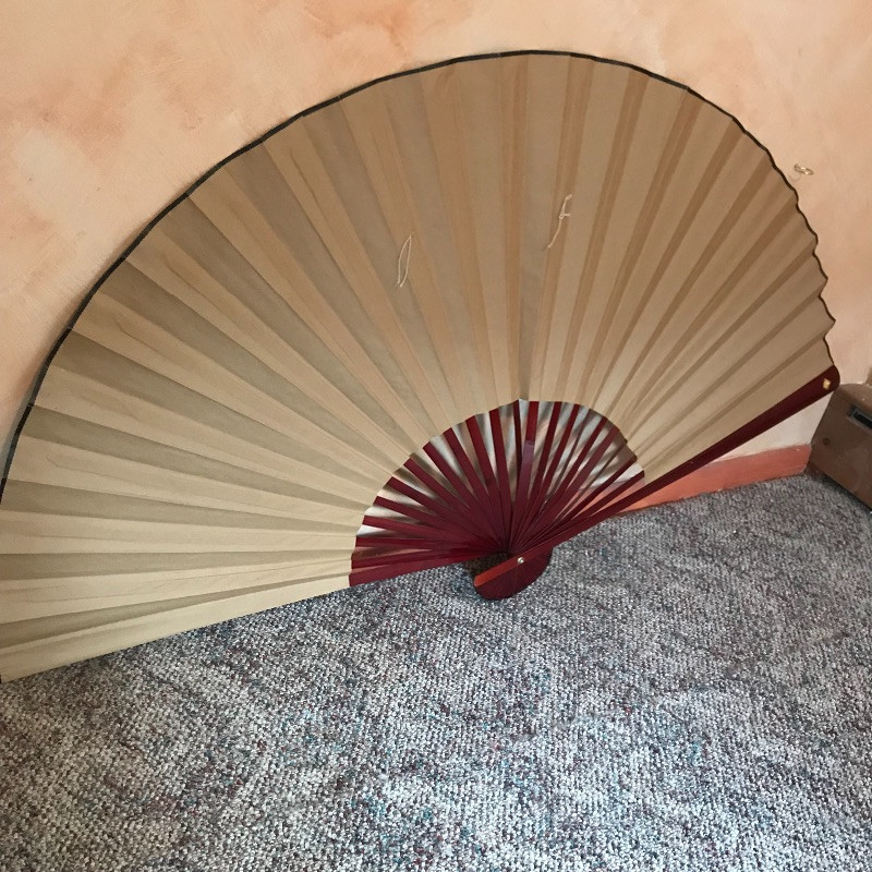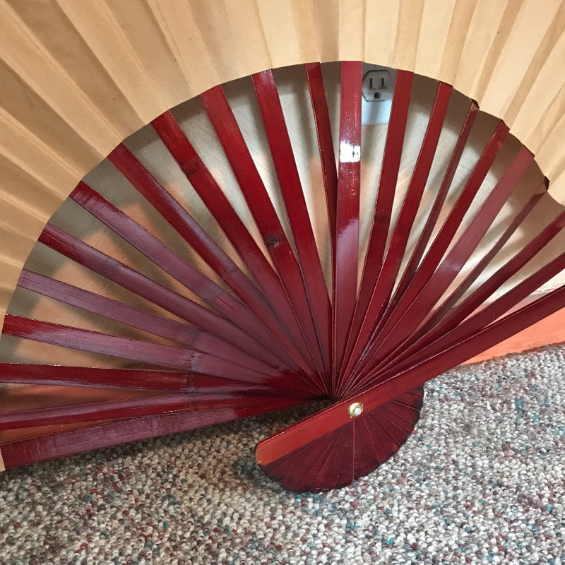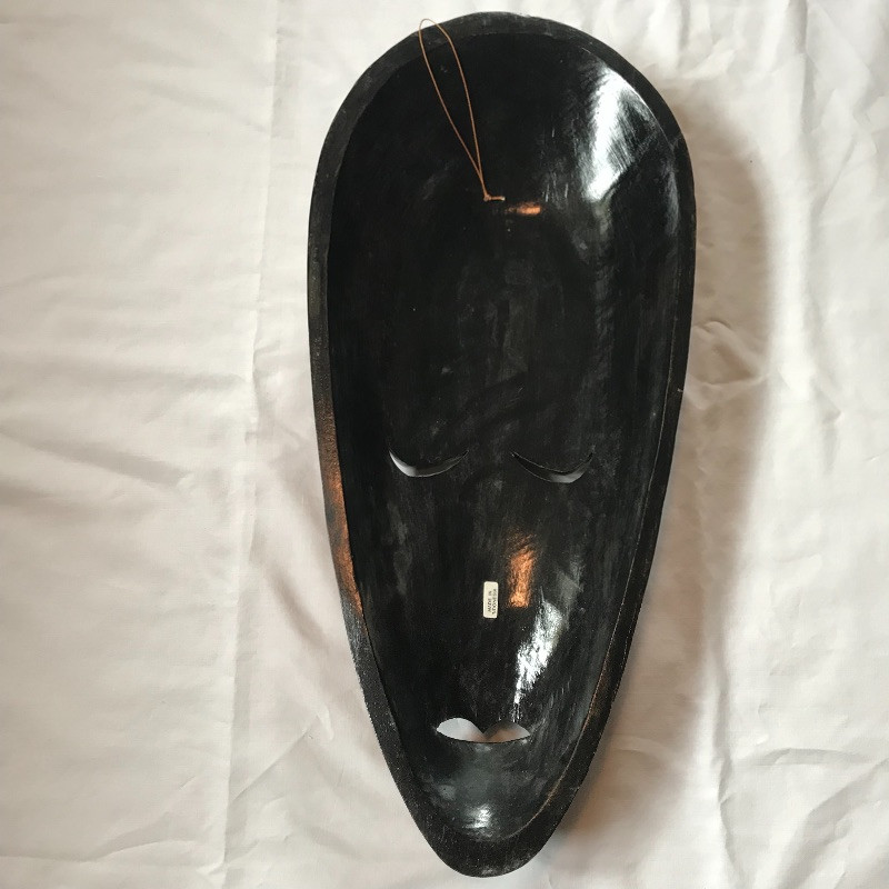 Two lovely Asian wall fans appear to be fashioned from paper and bamboo. One has a lovely painted scene while the other is simply gold elegance. Both fans measure approximately 62” x 34” and have strings attached to the backside for hanging. Fans are accompanied by a laying gold colored statuette, presumably made of plaster and a carved and painted wooden mask. The mask has a small blemish that appears to be from a price tag. Piece measures 9” x 19.75” and also has a fashioned string for hanging. See photos. Local pick up only.