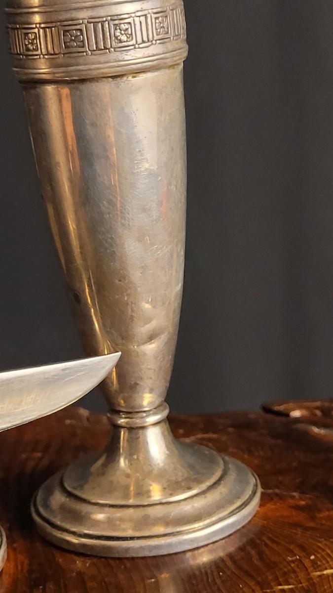 Beautiful set that is about 5" Tall. Weighted w/ cement. Both show small dings to be expected with age and use - the largest examples are shown with pointer.