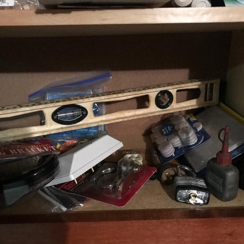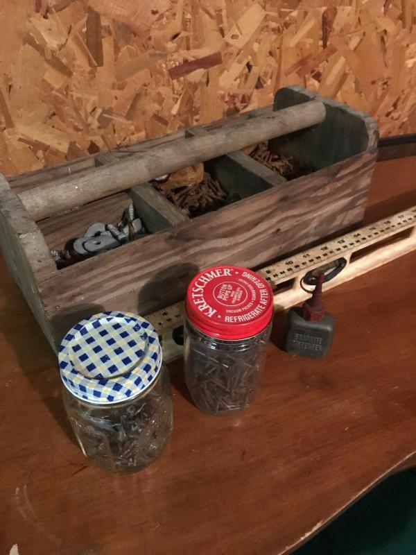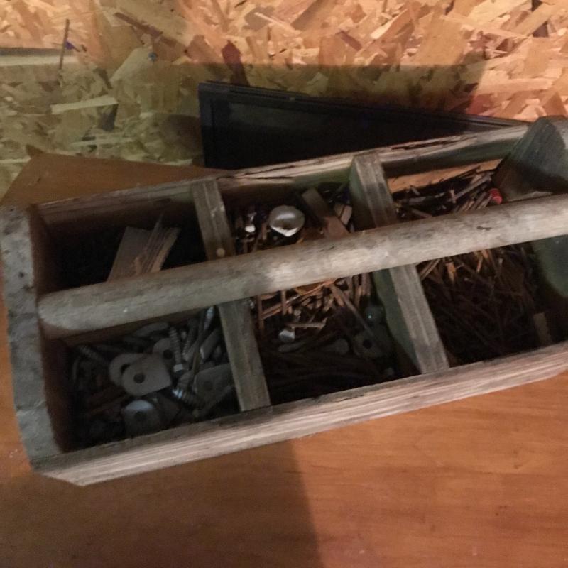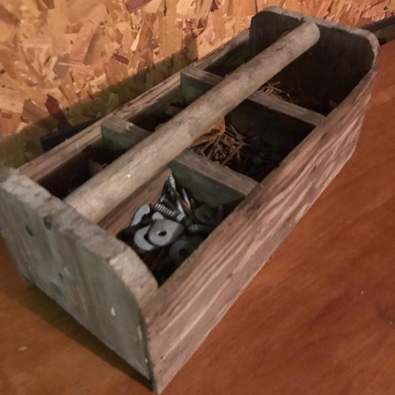 Lot includes antique wooden tool caddy and many miscellaneous household tools. See pics. No shipping