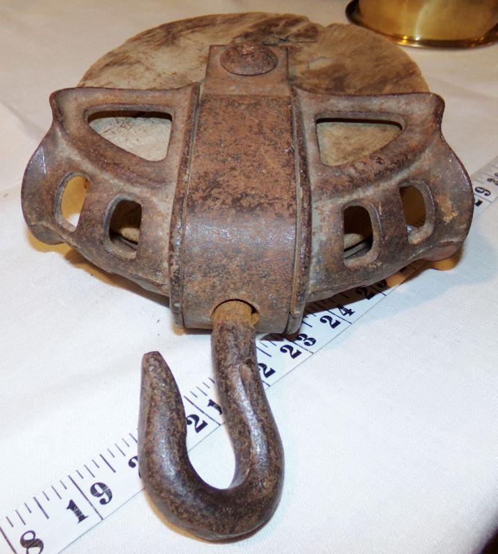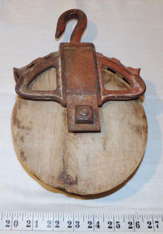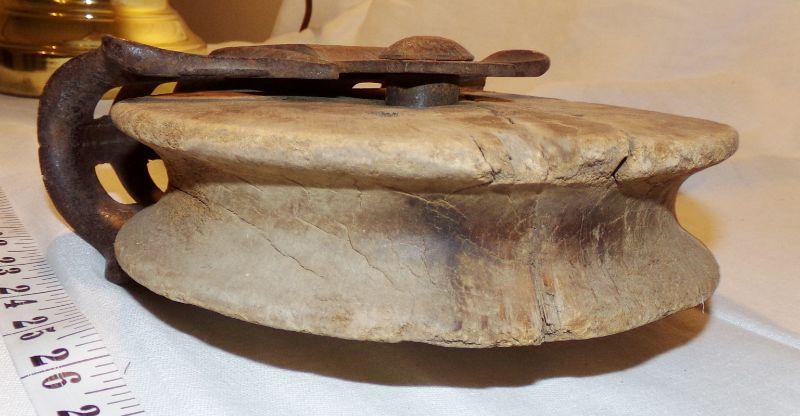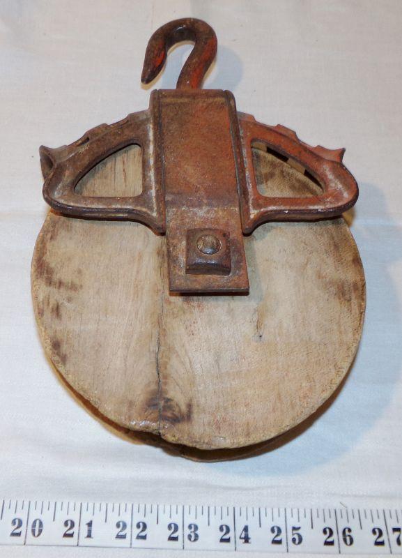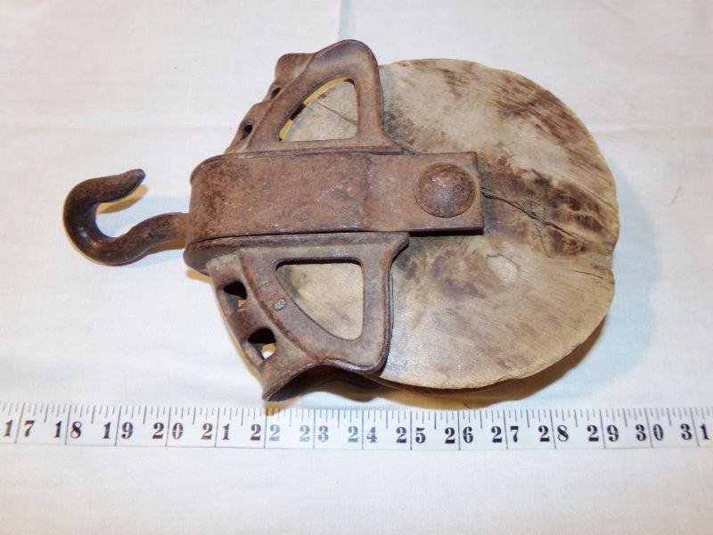 IRON AND WOOD ANTIQUE PULLEY. WOOD IS CRACKED ON ONE SIDE (SEE PIC)