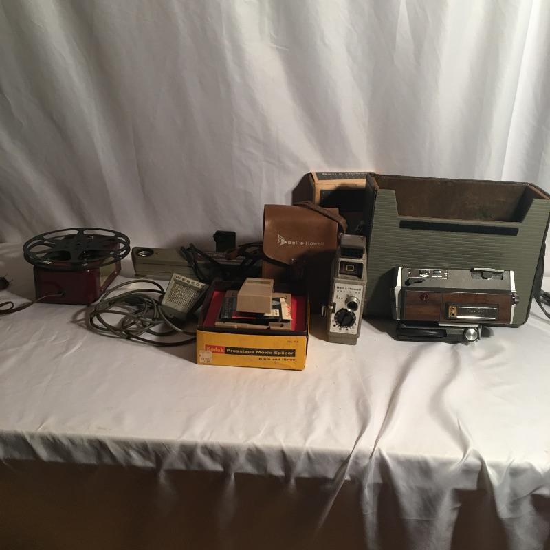 A nice find for the vintage camera buff that includes Bell and Howell cameras model #s 442 and 19 with cases and light, Bell and Howell Light for indoor movies, Kodak movie splicer, Lafayette Bull tape eraser and a Webcor handheld microphone. All items were not tested as most run on batteries.