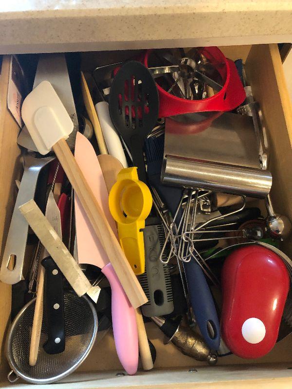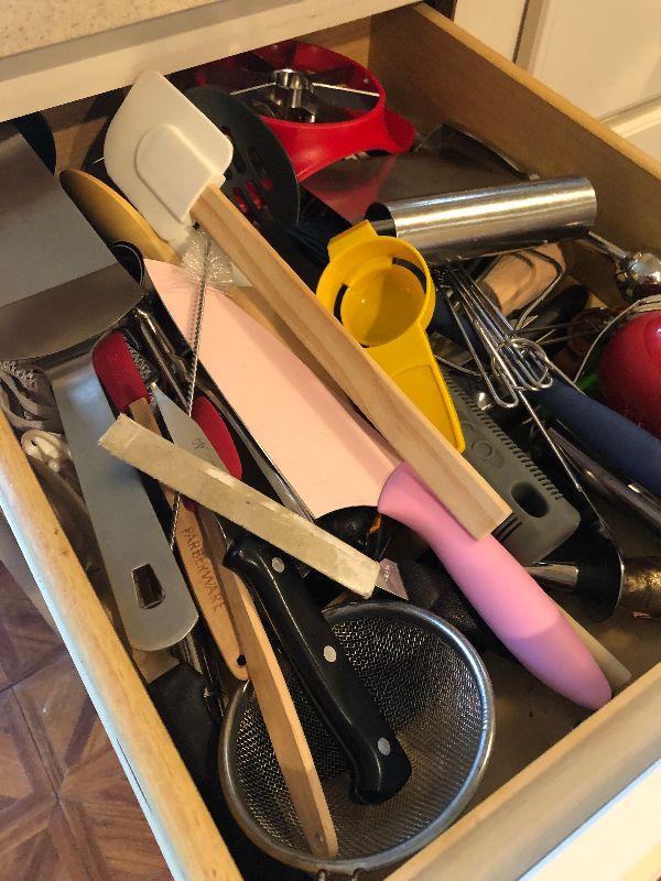 Contents of Kitchen Drawer including Knives, Spatula, Can Opener and More.