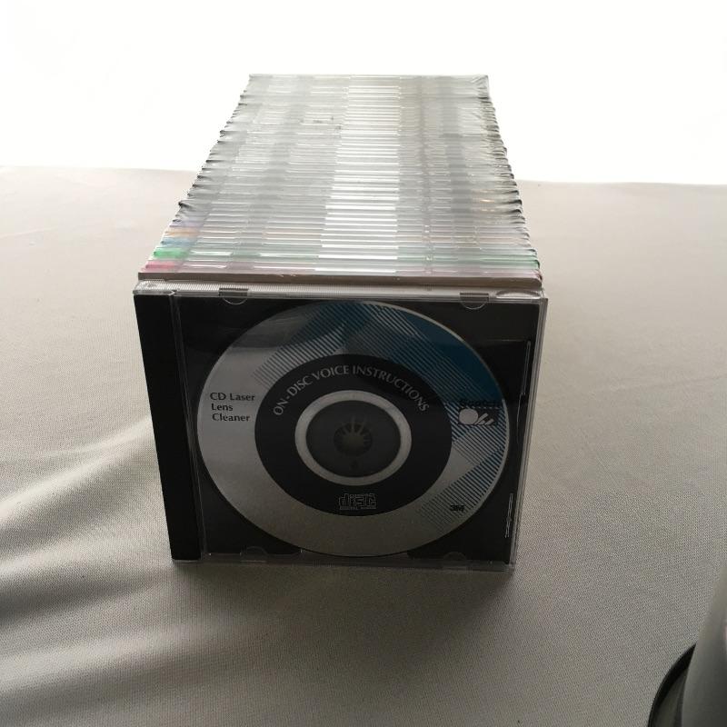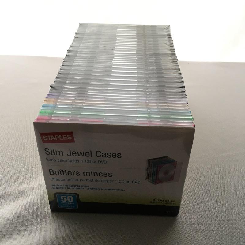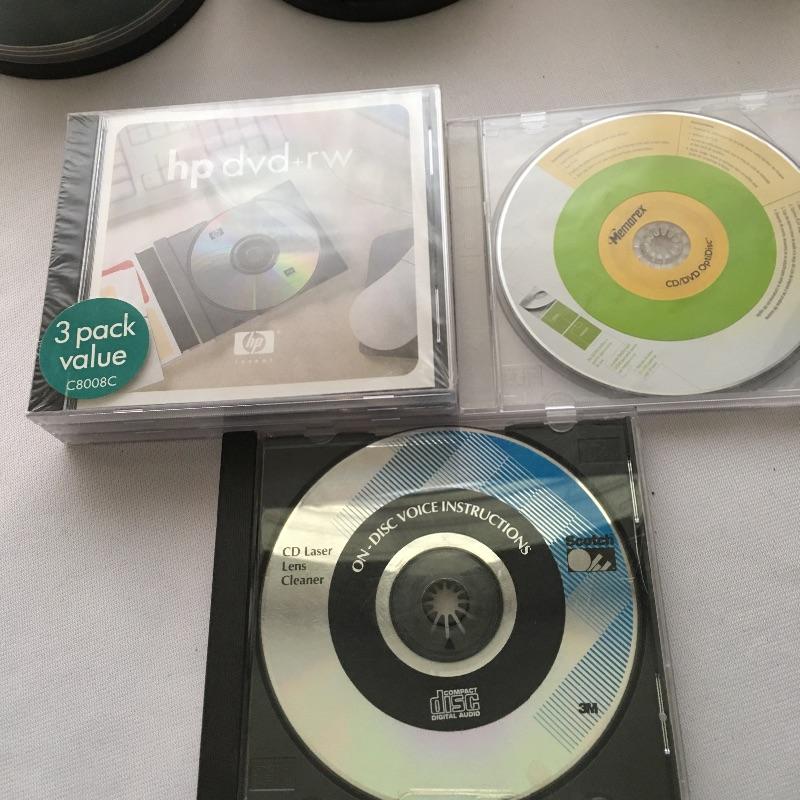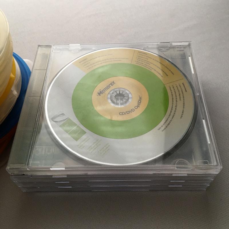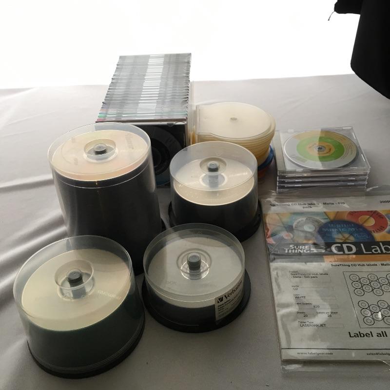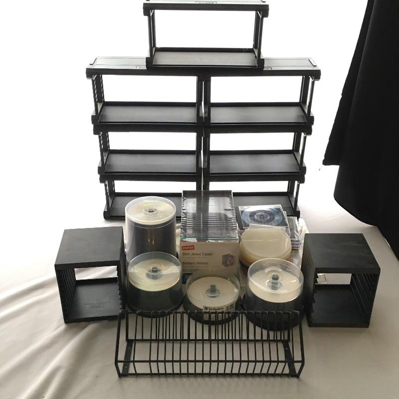 Blank DVDs and racks. Lot includes writeable DVDs, CDs, jewel cases and racks to store DVD and CDs.