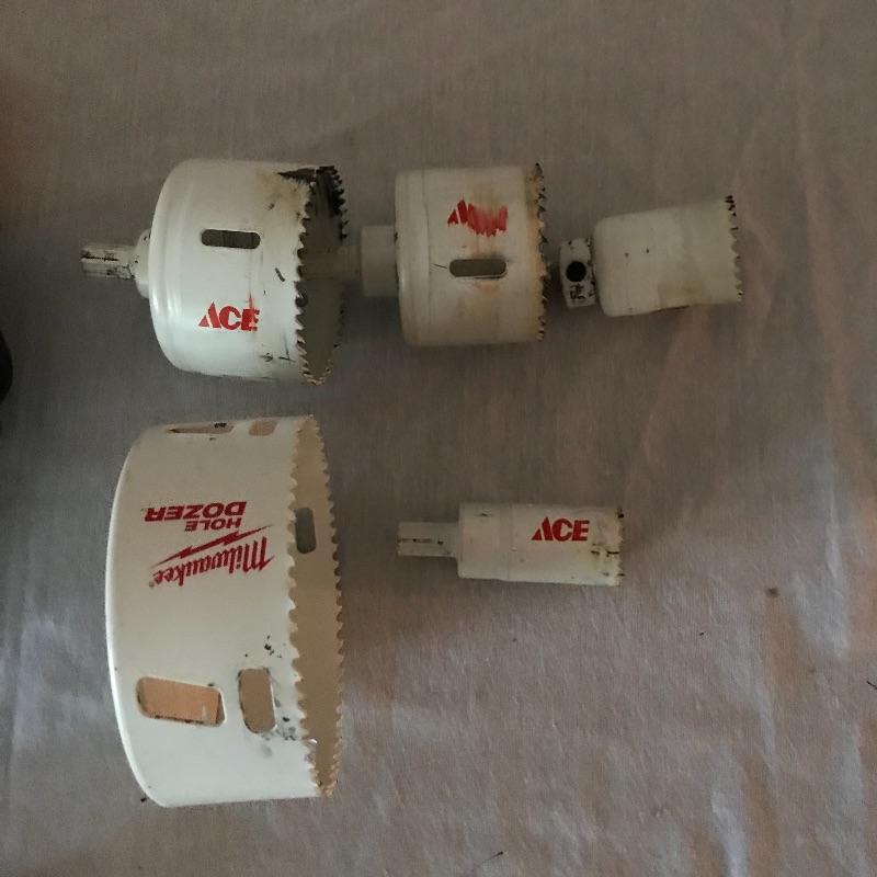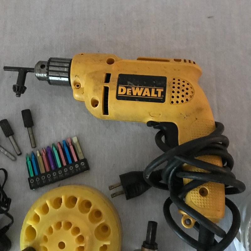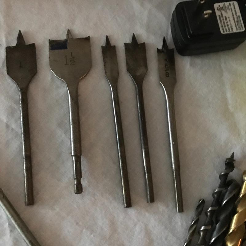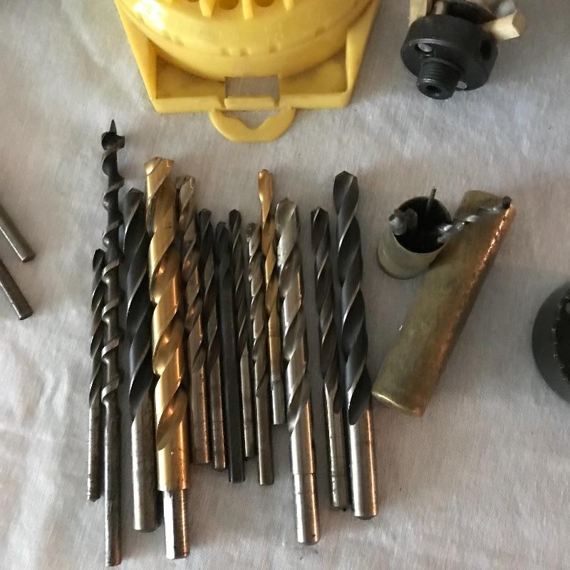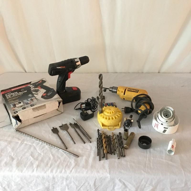 Two working drills for all your needs along with all size bits including paddle bits and a collection of hole saws. The cordless drill is a Drillmaster and the electric drill is a Dewalt. Local pick up only.