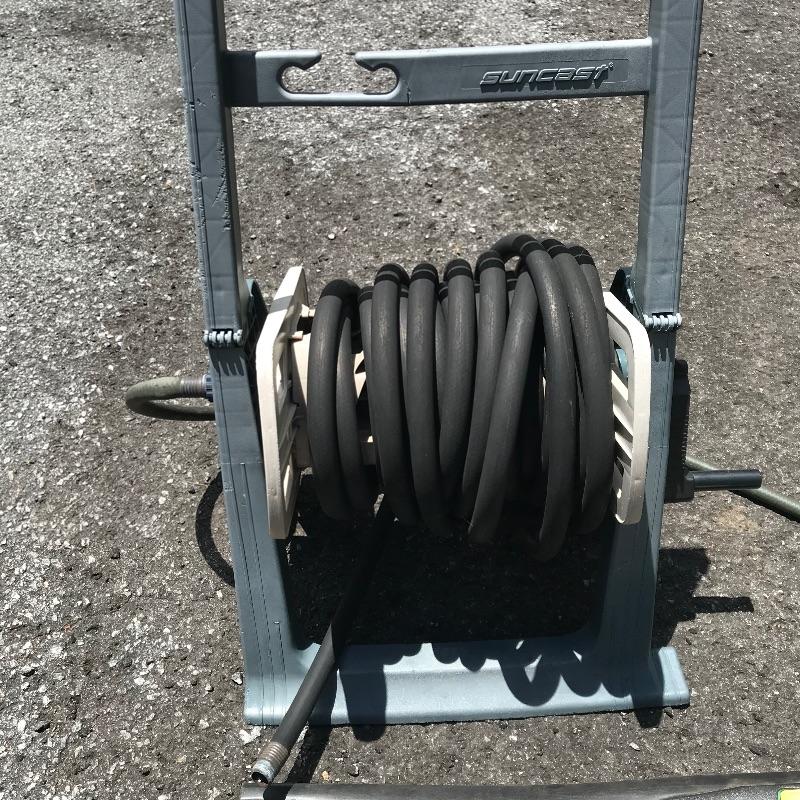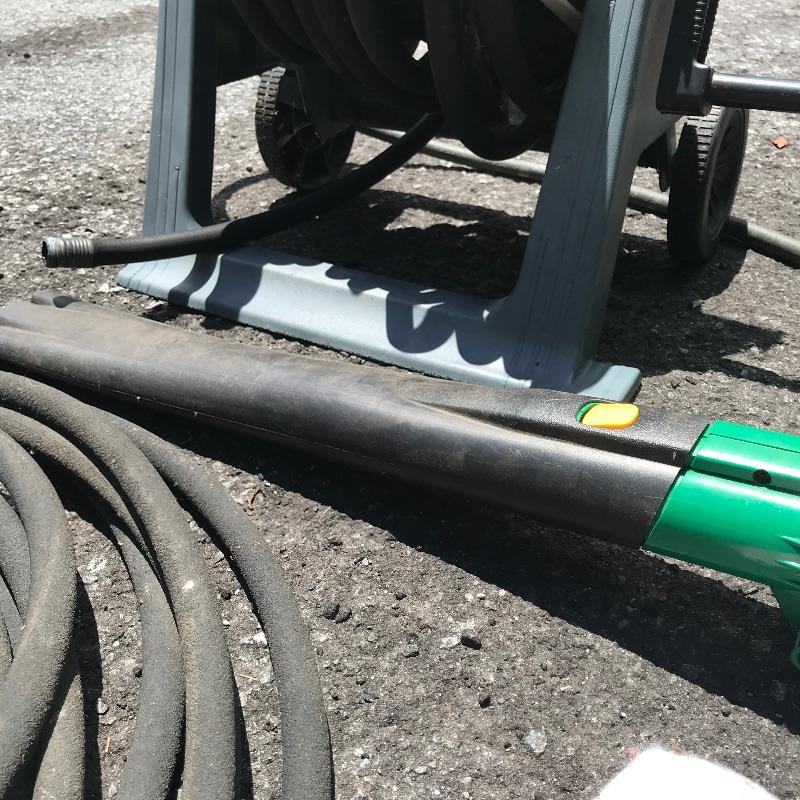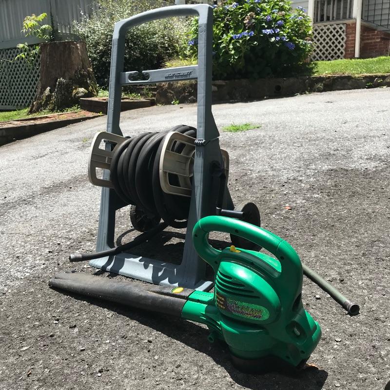We’re here to help from spring through fall! E-Max Super Electric Blower/Vac with accessories and bag included. Blower turned on when tested. Lot also comes with a Suncast hose cart and two black hoses. The solo hose appears to be non-kink. See photos. Local pick up only.