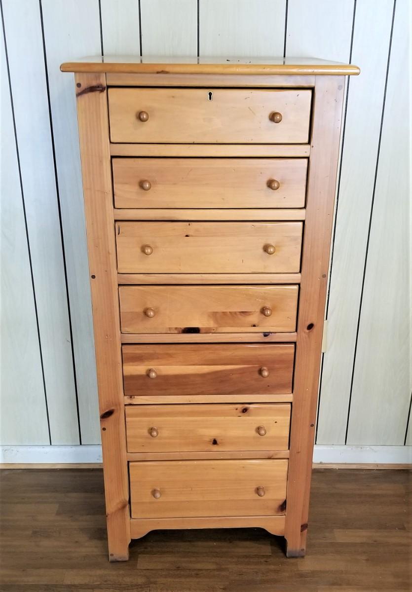 Ethan Allen 7 Drawer solid pine lingerie chest. Good used condition. Please see all photos. 24" across, 17.75" deep, 51.5 tall.
