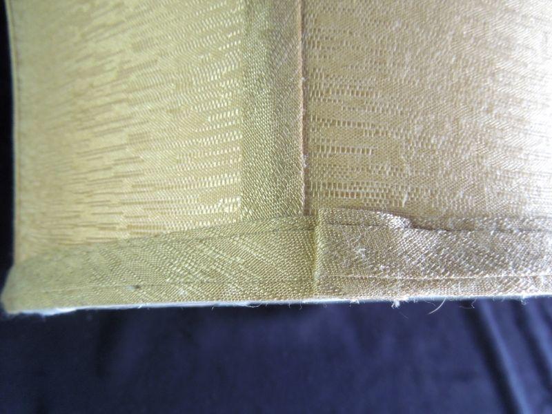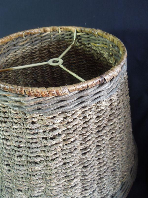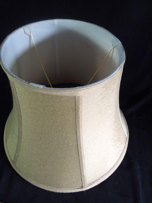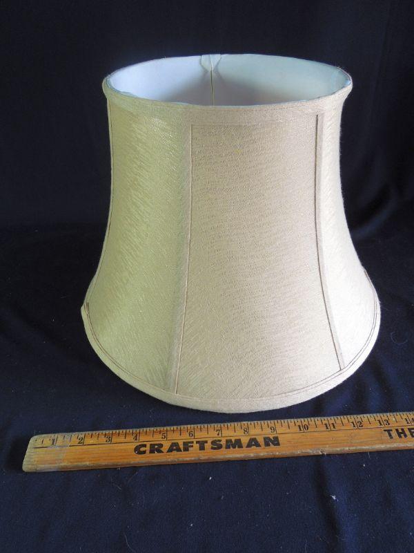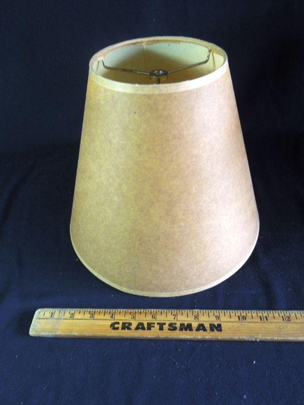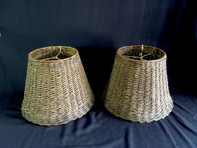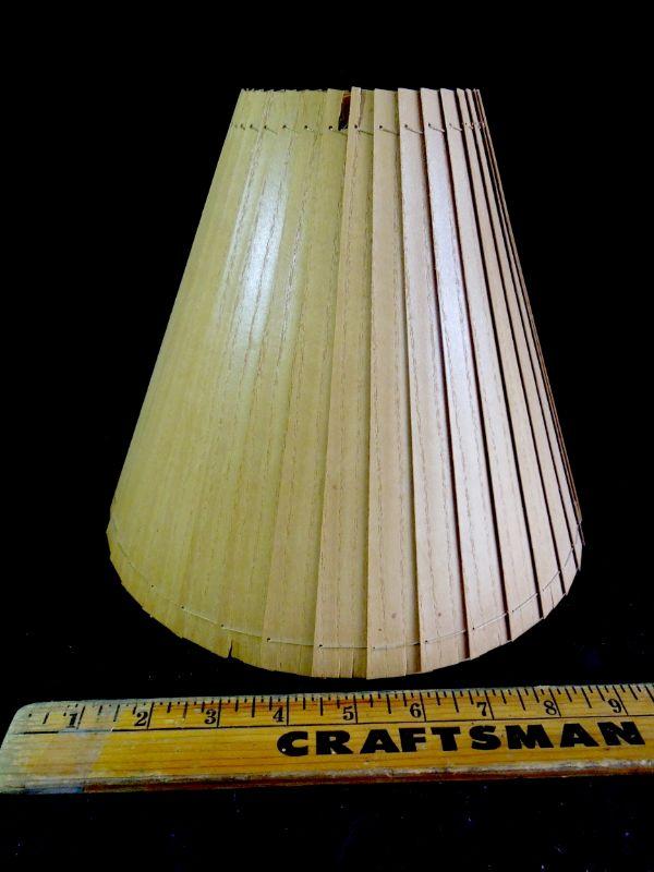Two matching woven jute and reed 9" H x 12" W shades with no damage (only one has bracket); an elegant gold silk, fully lined 11"H x 15" W tailored shade (no damage); a parchment or handmade paper 10" H x 12" W shade in very good condition and a oriental style wood slat 8.5" H x 10.5" W shade with broken sections.