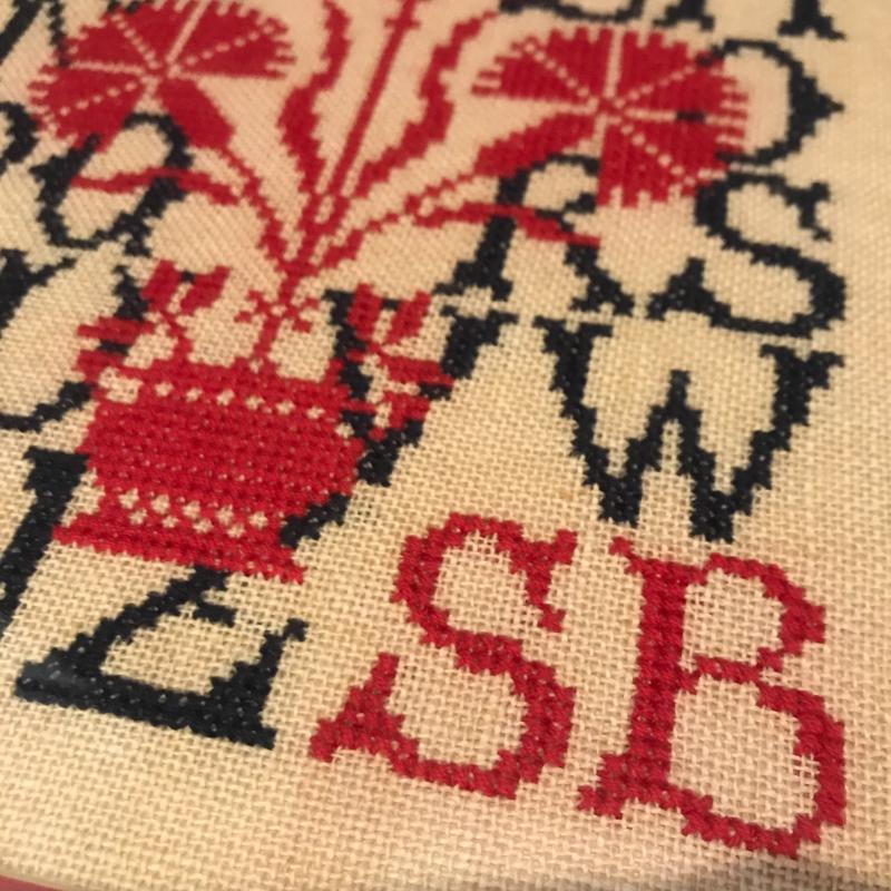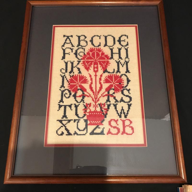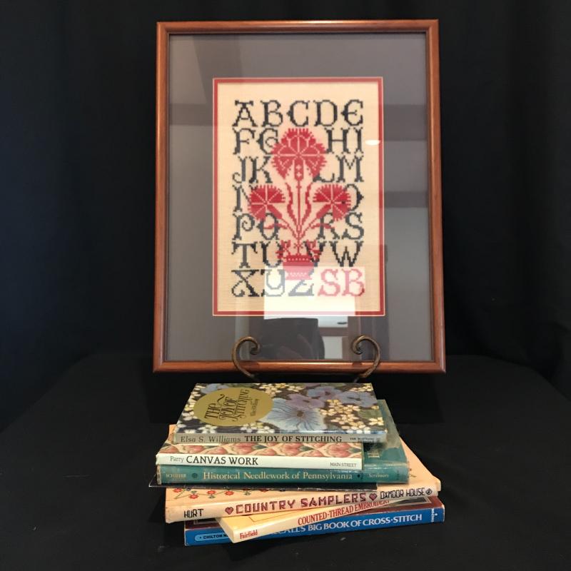 Beautiful hand made framed cross-stitch alphabet to admire. Measures 21”l x 17”w. Lot includes Books on Cross-stitch and embroidery