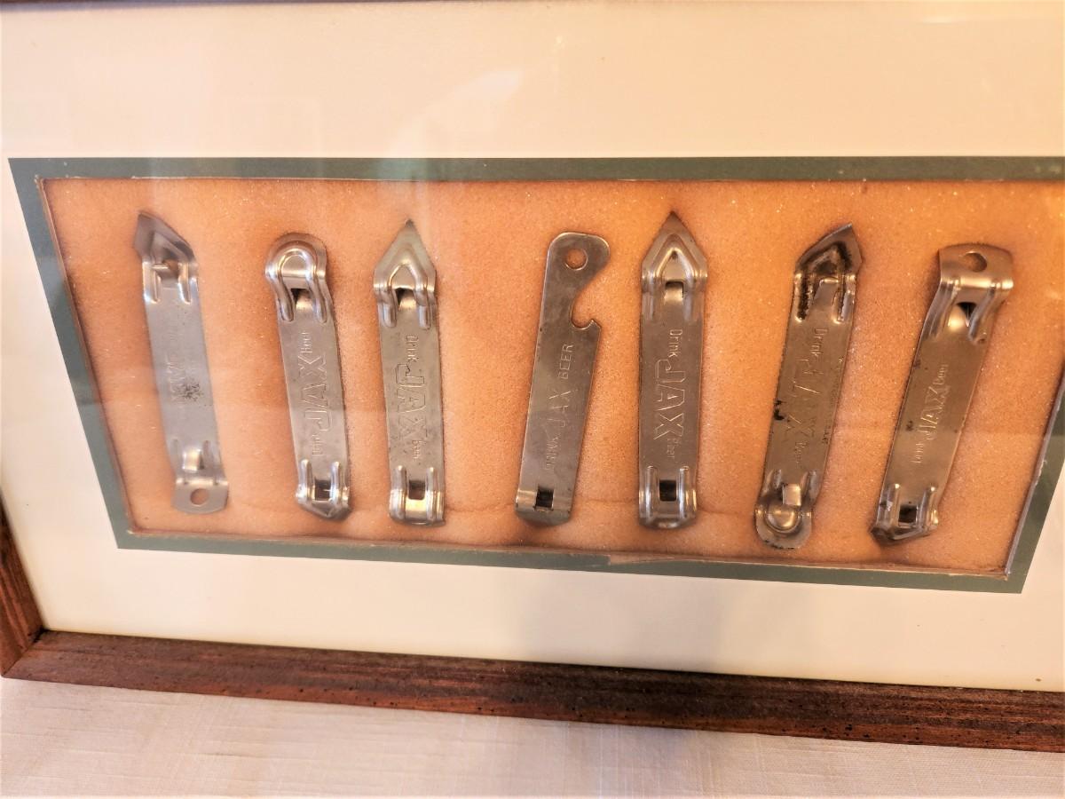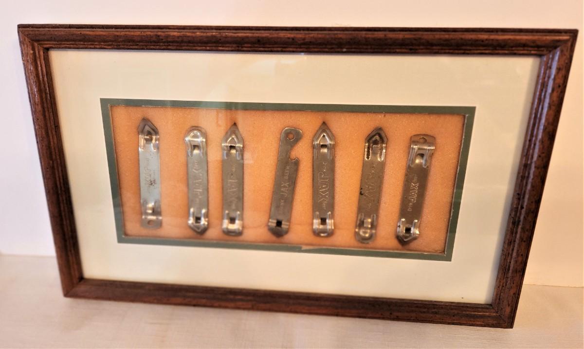 Framed group of 7 vintage JAX BEER bottle openers - measures 17" x 10". All in vintage condition.