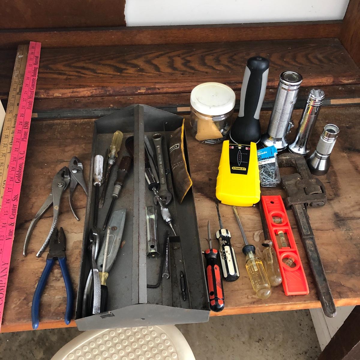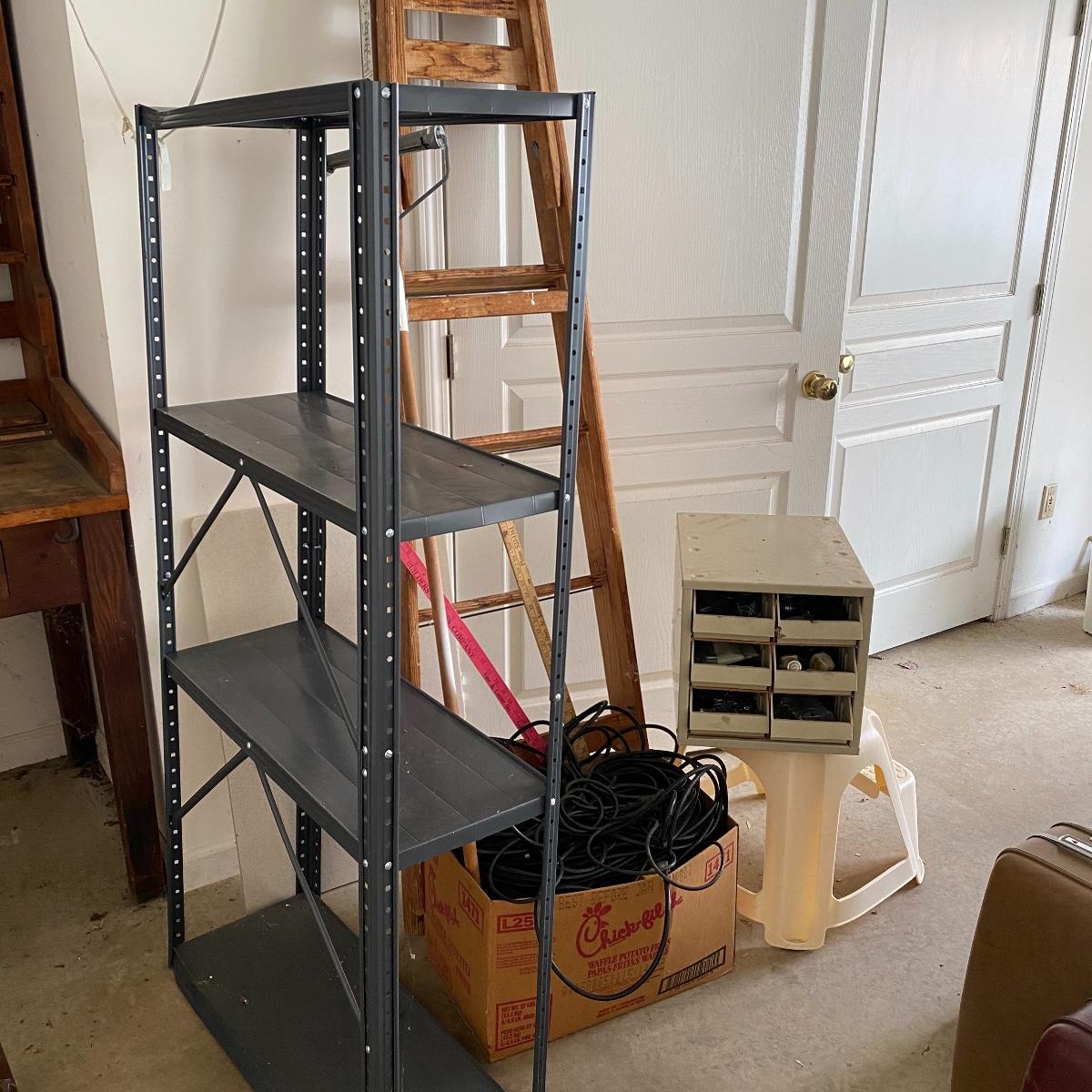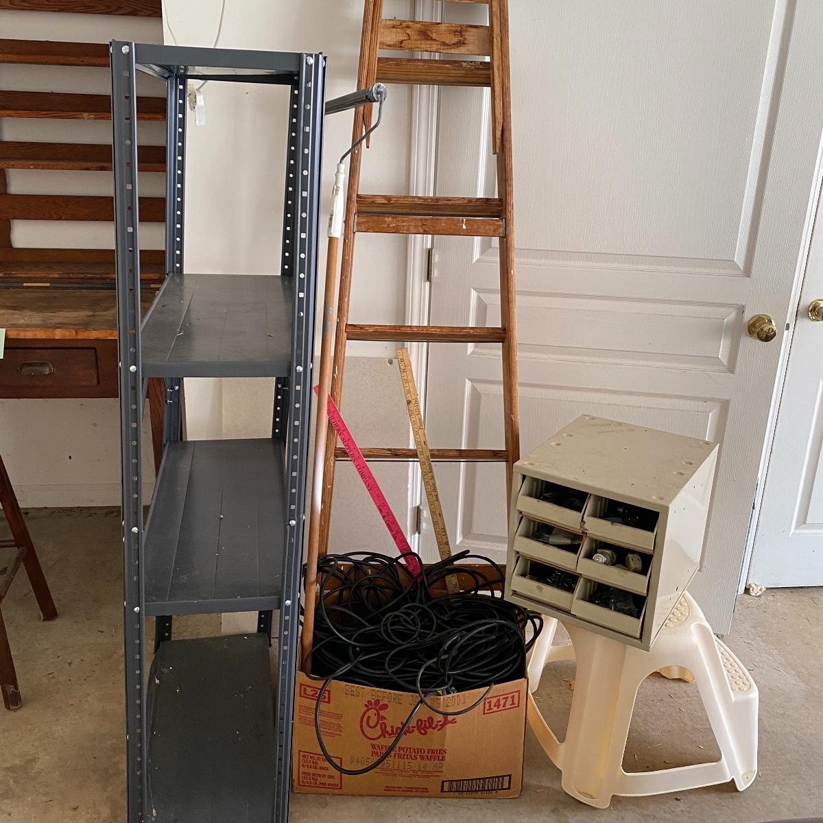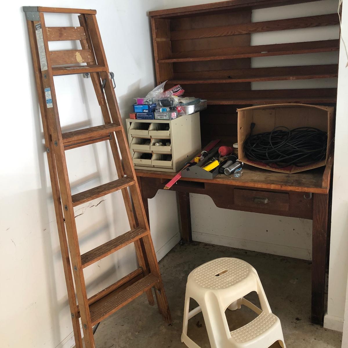 Get your home repair tools and hardware in one fell swoop. Lot includes Sears wooden six foot ladder, extension cords, metal shelf, screwdrivers, pliers, step stool and more. Wooden work Bench not included but available in lot 139.