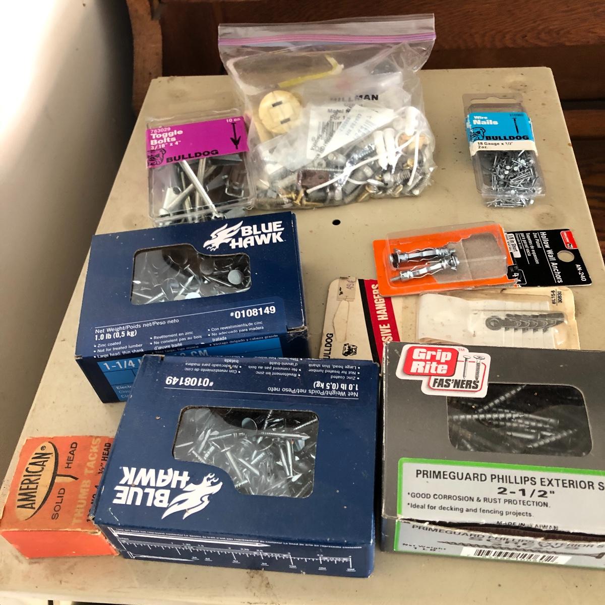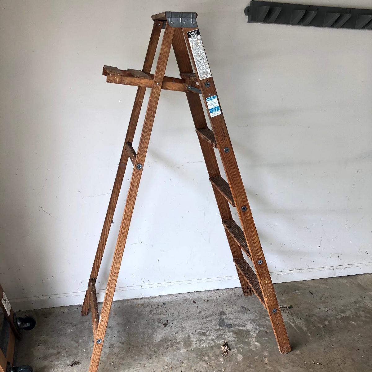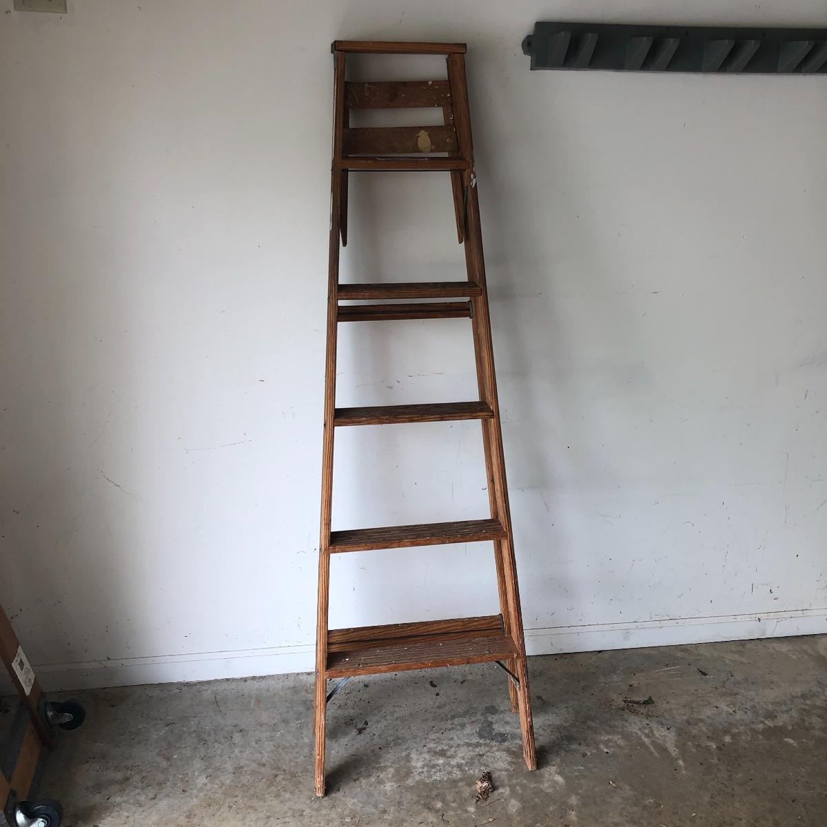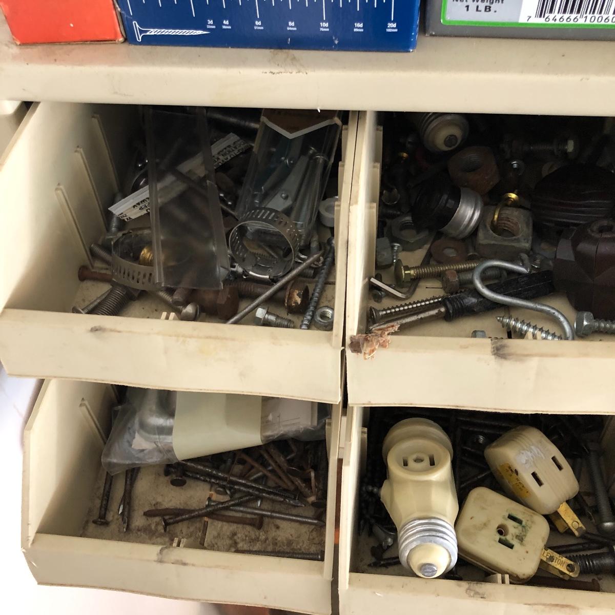 Get your home repair tools and hardware in one fell swoop. Lot includes Sears wooden six foot ladder, extension cords, metal shelf, screwdrivers, pliers, step stool and more. Wooden work Bench not included but available in lot 139.