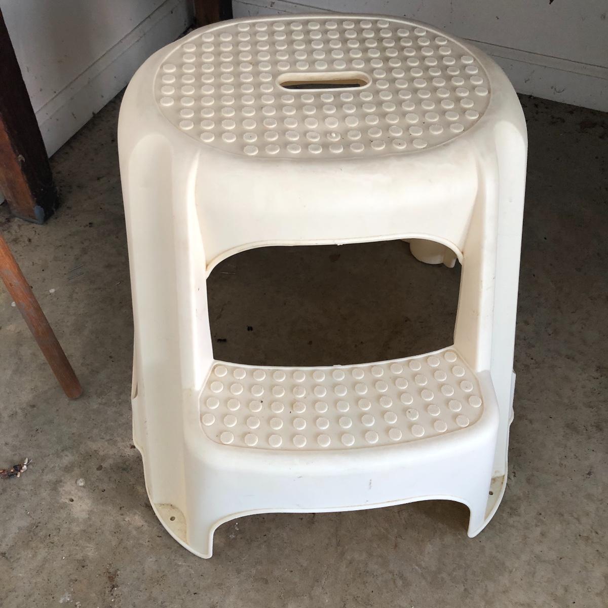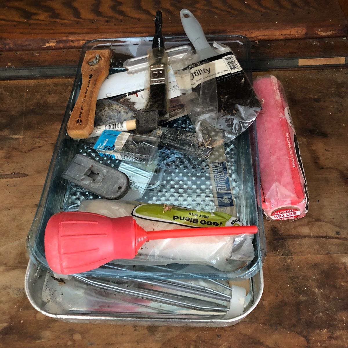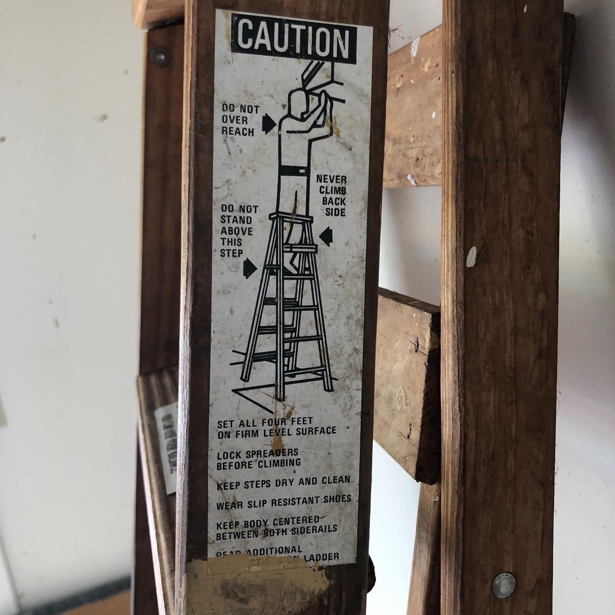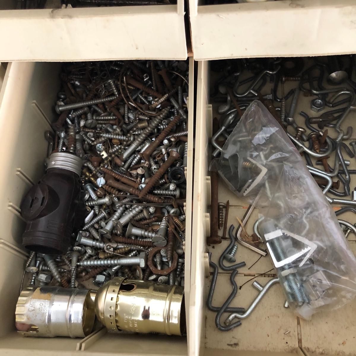 Get your home repair tools and hardware in one fell swoop. Lot includes Sears wooden six foot ladder, extension cords, metal shelf, screwdrivers, pliers, step stool and more. Wooden work Bench not included but available in lot 139.