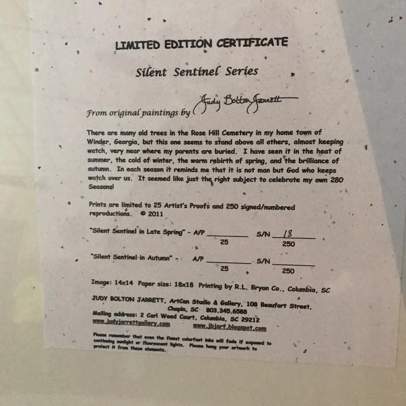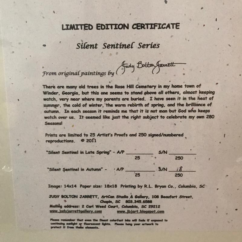 Two limited edition Judy Bolton Jarrett Silent Sentinel Series. Both are number 18 of 250. 18” square. No shipping available. Local pickup only in Maggie Valley, NC.