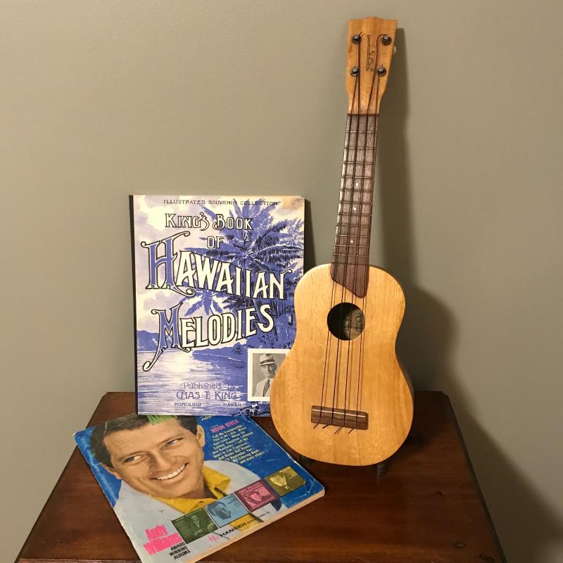 Gorgeous Kamaka Ukulele with two music books- one Hawaiian Melodies, copyright 1948 and the other is a collection of mid-century hits by Andy Williams. The ukulele’s condition is unconfirmed, but appears to be in great shape. Shipping available or local pick up in Arden, NC.