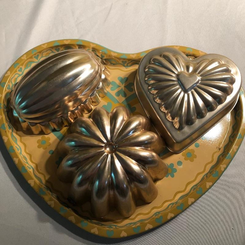 This lot includes an adorable set of jello molds of several different shapes and sizes. It includes oval-shaped, heart-shaped, flower-shaped, circular-shaped, and Bundt-shaped molds. It also comes along with a heart-shaped tray with flower designs, and an old-fashioned Betty Crocker cookbook (©️1965). Shipping available.