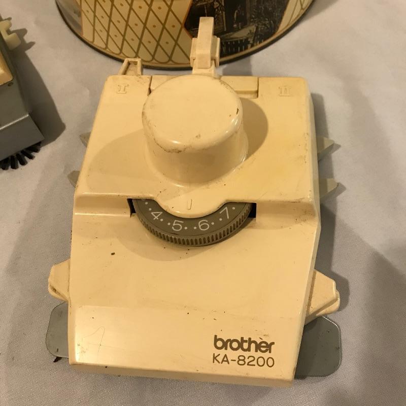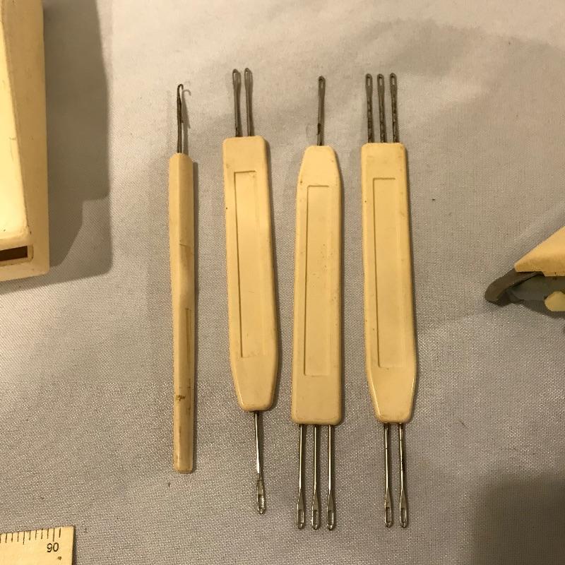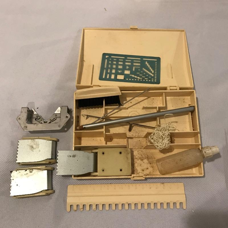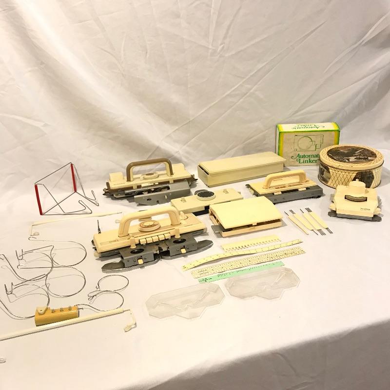 While we have your attention with a few huge lots of yarn, let’s complete those jobs with a collection of linking machines. Lot features Automatic Linker model SC-3, Singer Memo-Matic 700, Brother KH-910, KA-8200 and two others with unknown brand names. Lot also includes many accessories and tools you can view in images. Shipping available.