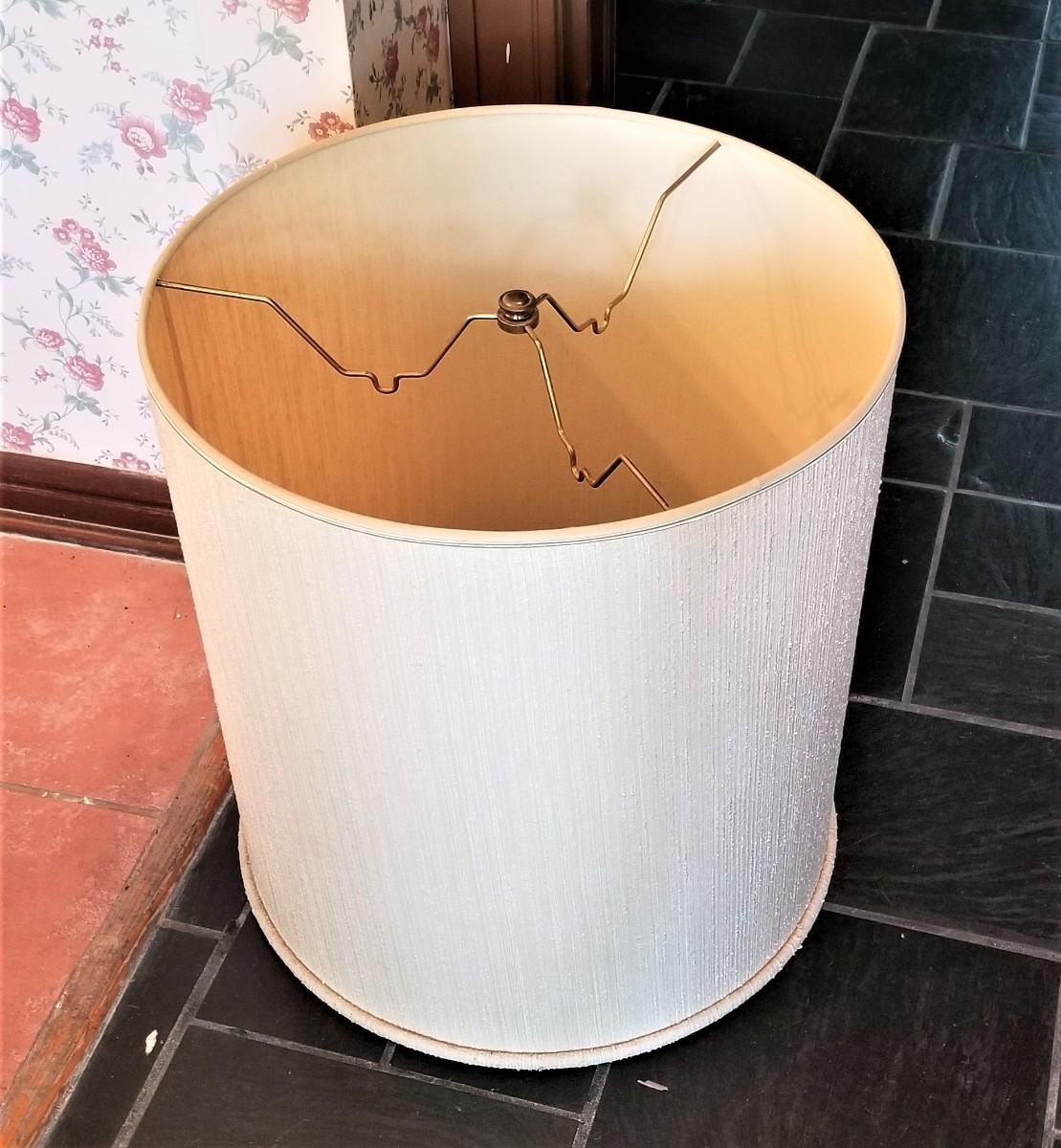 Brass and Ceramic large and heavy Mid-Century Table lamp - Torchiere style or with fabric shade (included). Lamp works - switch on cord. Good condition. 37" tall. Shade is 19" tall. No maker noted.