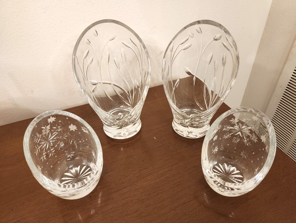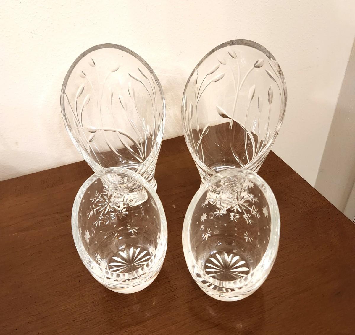Nice lot of 4 Nova Scotia (Canadian) Crystal Candle Votives - marked - 2 floral (7" tall), 2 snowflake (4.5" tall). All in good condition.