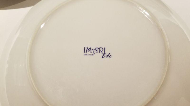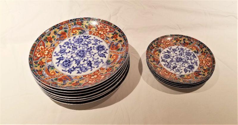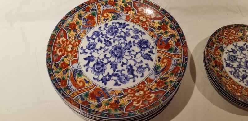 Contemporary dinnerware by "Imari - Edo." 7 dinner plates and 4 salad plates. Good condition. Dinner plates measure 10.5 inches across, salad plates measure 7 3/4 inches across.