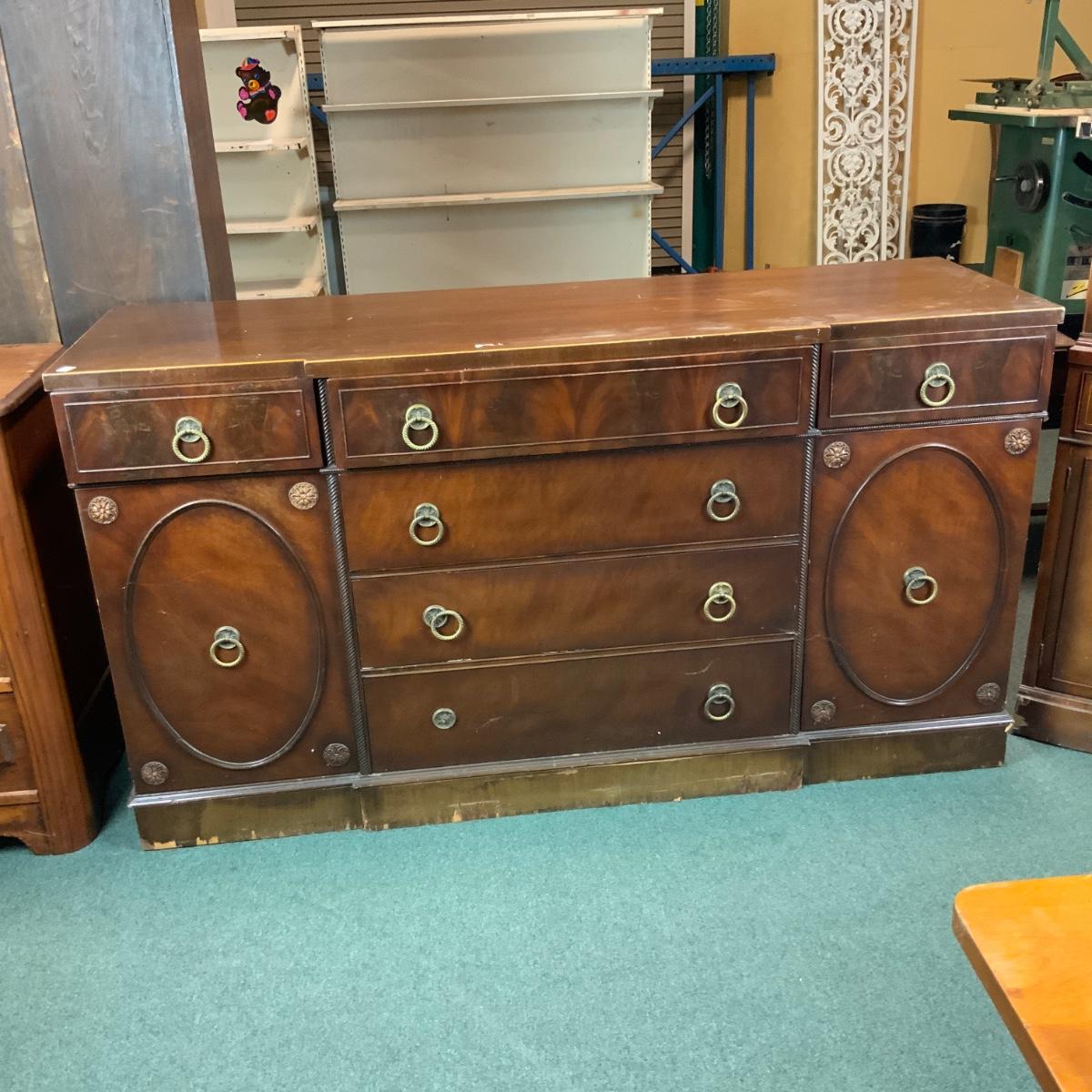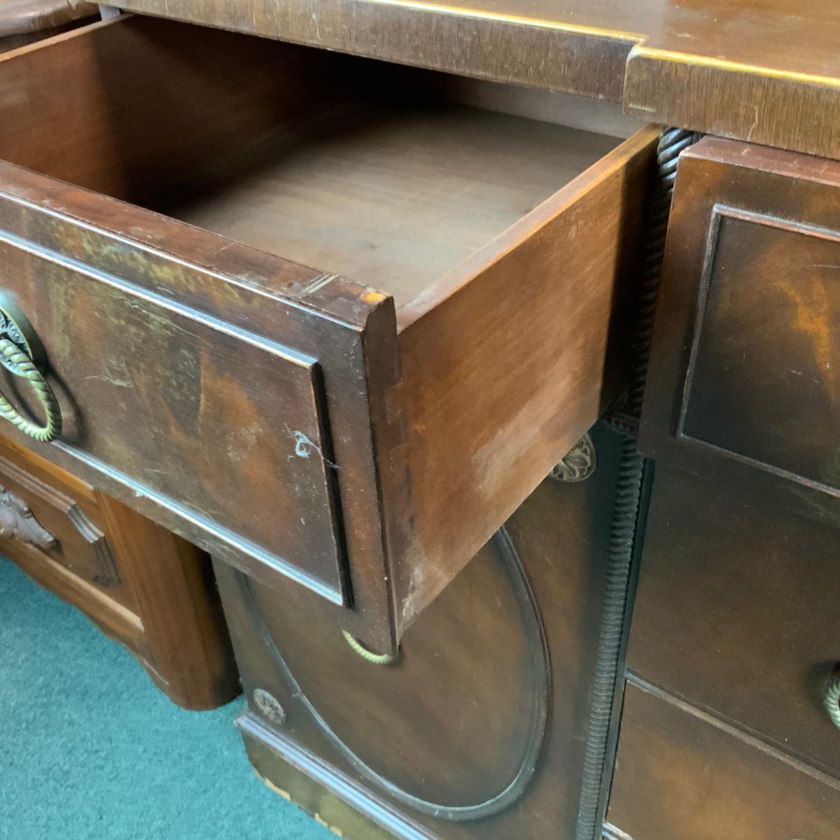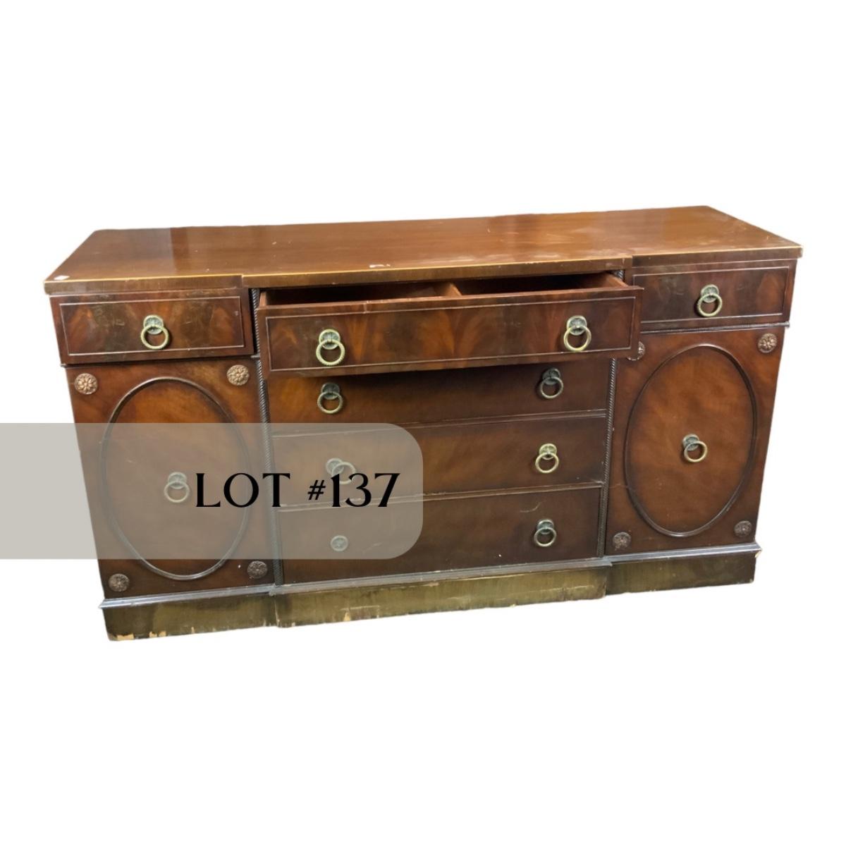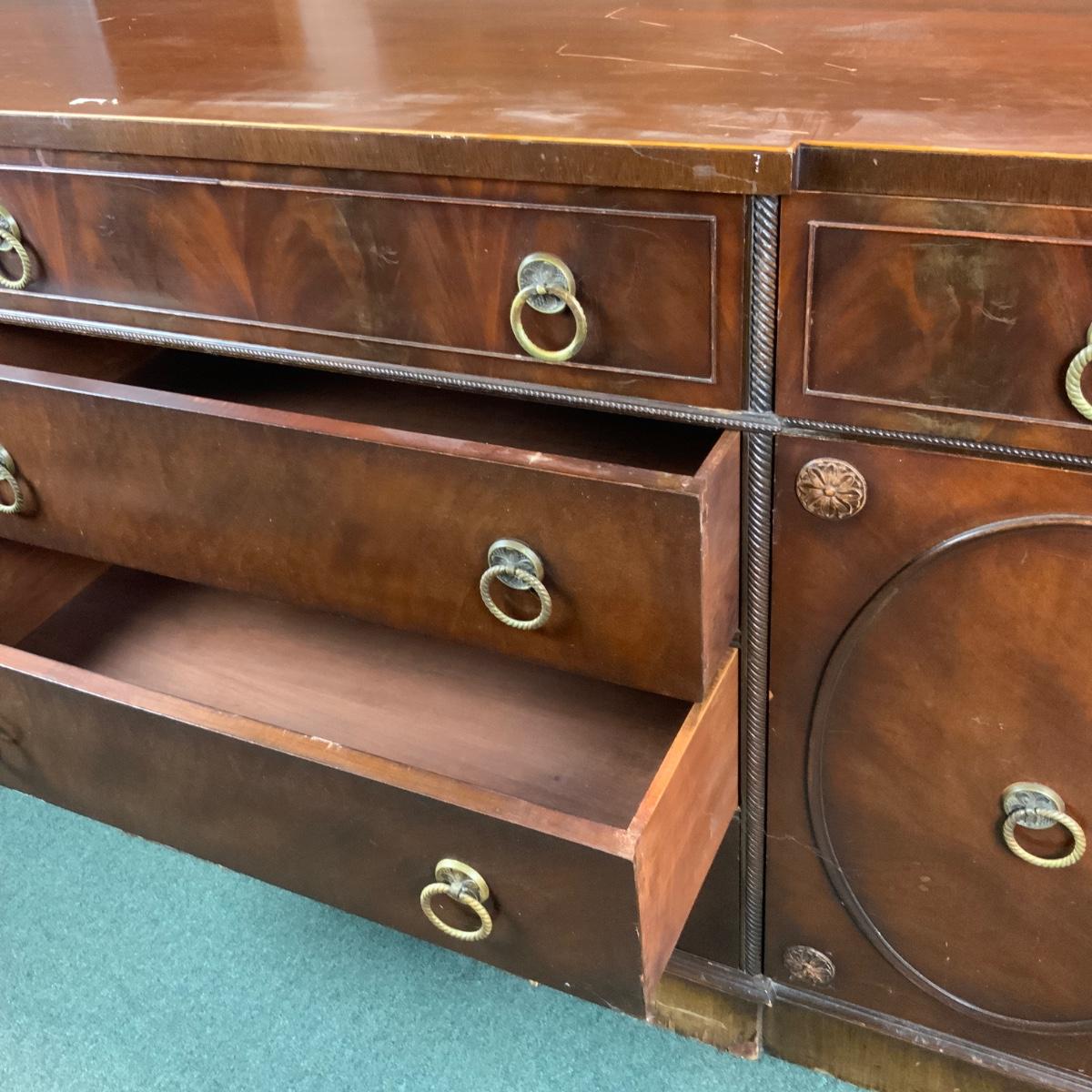 Mahogany Buffet. Think of all the extra plates and candlesticks you could store in here! //::\\ Please see photos for details and condition. No attempt has been made to hide any imperfections. All items listed in this auction are warehouse items, and need to be cleaned. A majority of the items need restoration as well. All items are sold AS IS and WITHOUT GUARANTEE. If you are uncertain about an item, DO NOT BID. Due to the nature of this online auction in-person inspection is HIGHLY recommended. All Sales are FINAL. Pick Up Times are FIRM. Please confirm with your own schedule that you can pick up in the scheduled times listed in the Terms and Conditions. Any questions please message the auctioneer. DO NOT Contact The Harp Gallery.