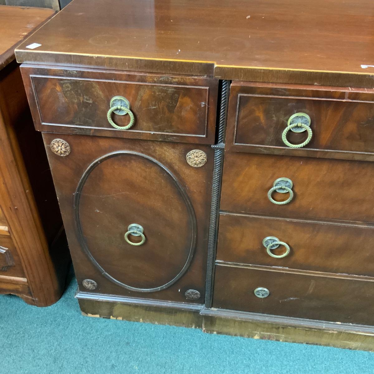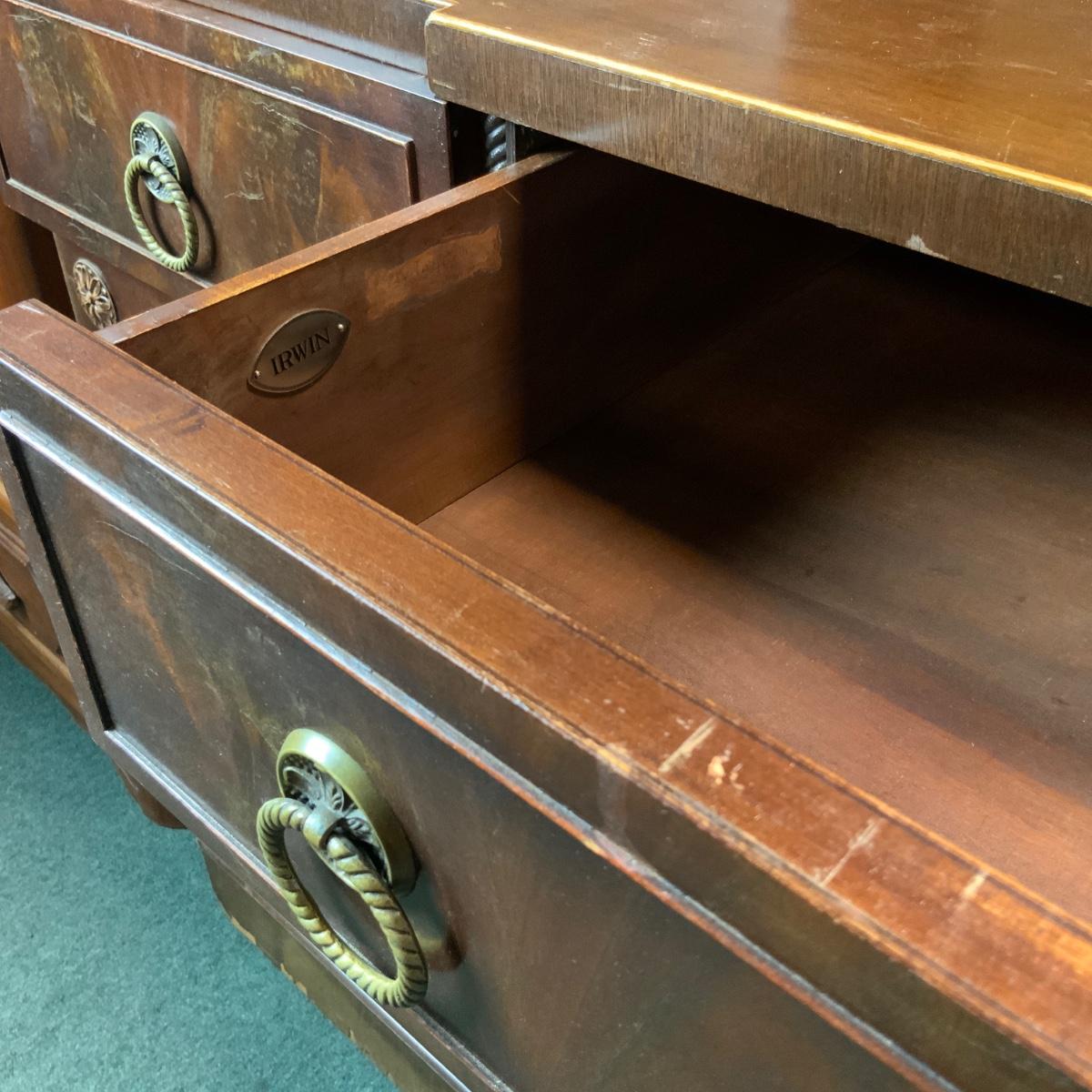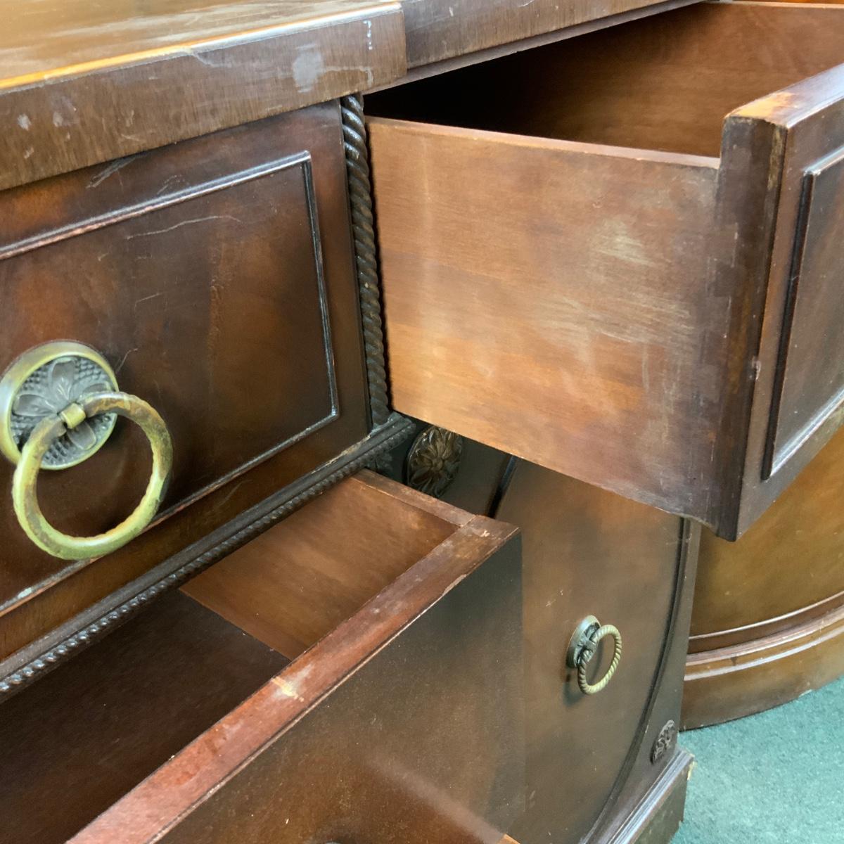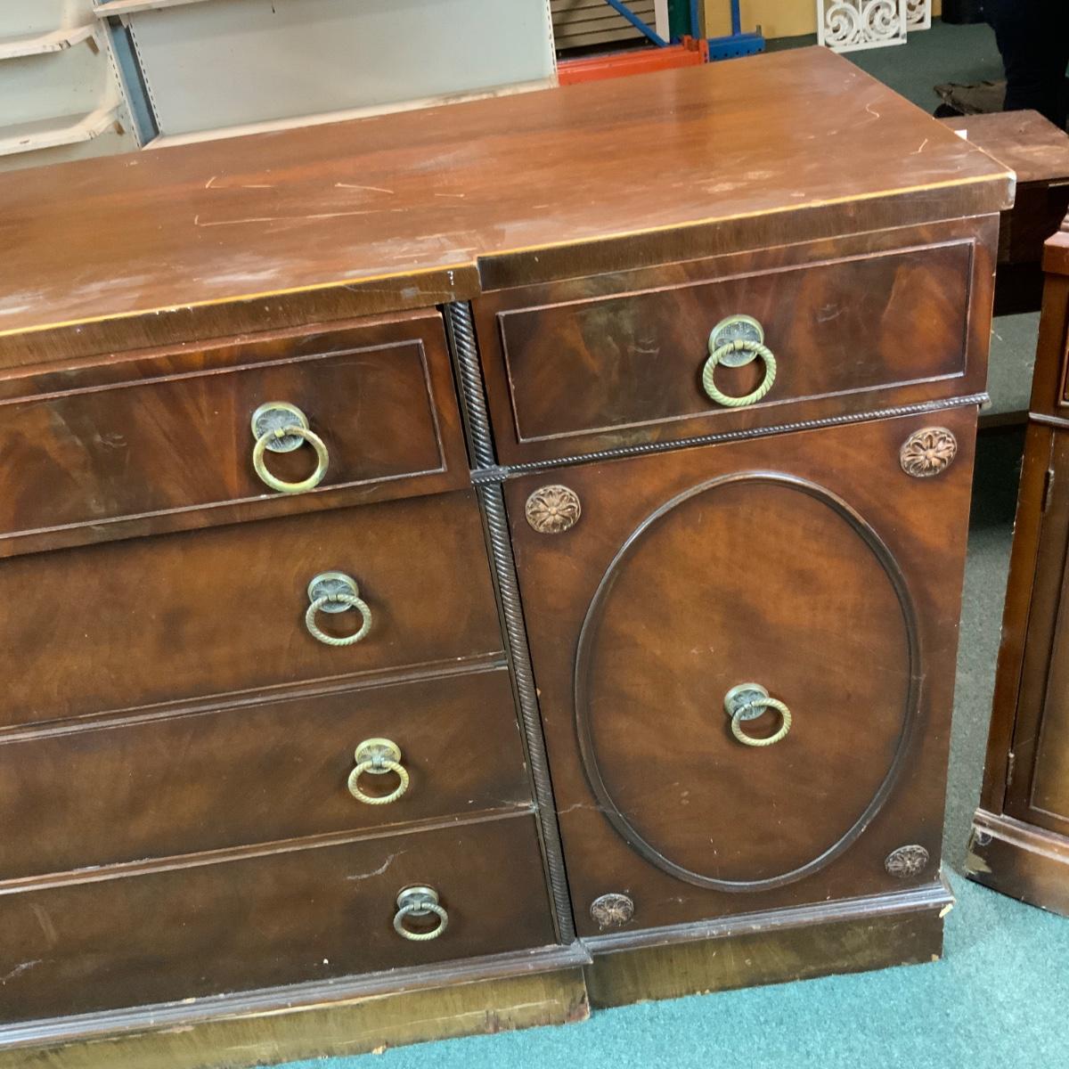 Mahogany Buffet. Think of all the extra plates and candlesticks you could store in here! //::\\ Please see photos for details and condition. No attempt has been made to hide any imperfections. All items listed in this auction are warehouse items, and need to be cleaned. A majority of the items need restoration as well. All items are sold AS IS and WITHOUT GUARANTEE. If you are uncertain about an item, DO NOT BID. Due to the nature of this online auction in-person inspection is HIGHLY recommended. All Sales are FINAL. Pick Up Times are FIRM. Please confirm with your own schedule that you can pick up in the scheduled times listed in the Terms and Conditions. Any questions please message the auctioneer. DO NOT Contact The Harp Gallery.