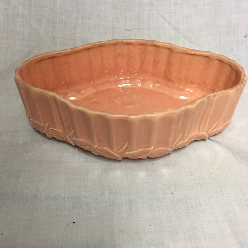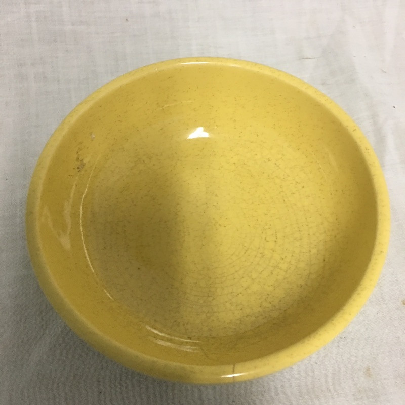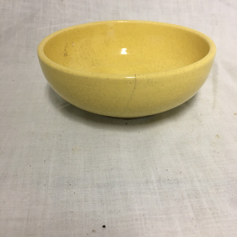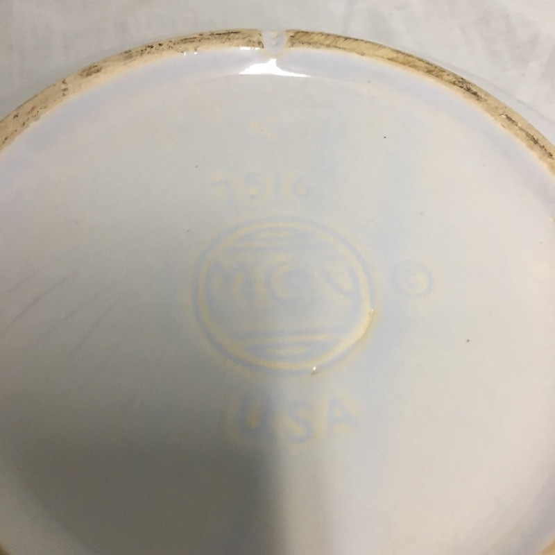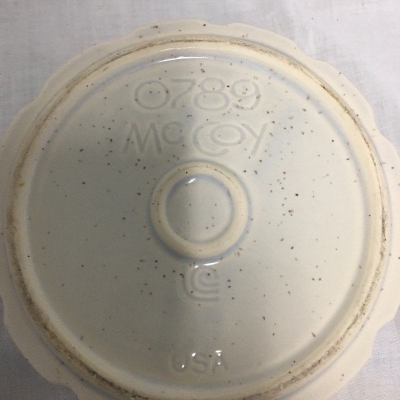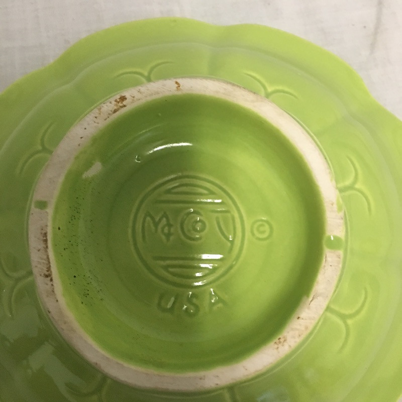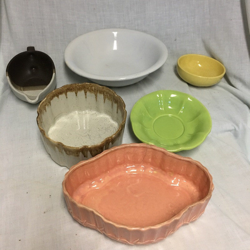 Six pieces of McCoy pottery in an array of colors. Included here are items numbered # 0789, 7128 and 7516. The others are not numbered. Two have cracks so look at images closely. Largest bowl measures 12”D x 3” tall.