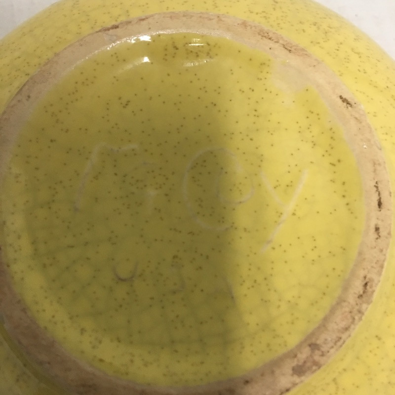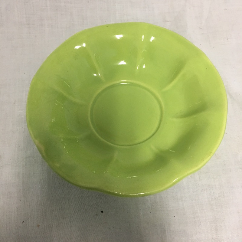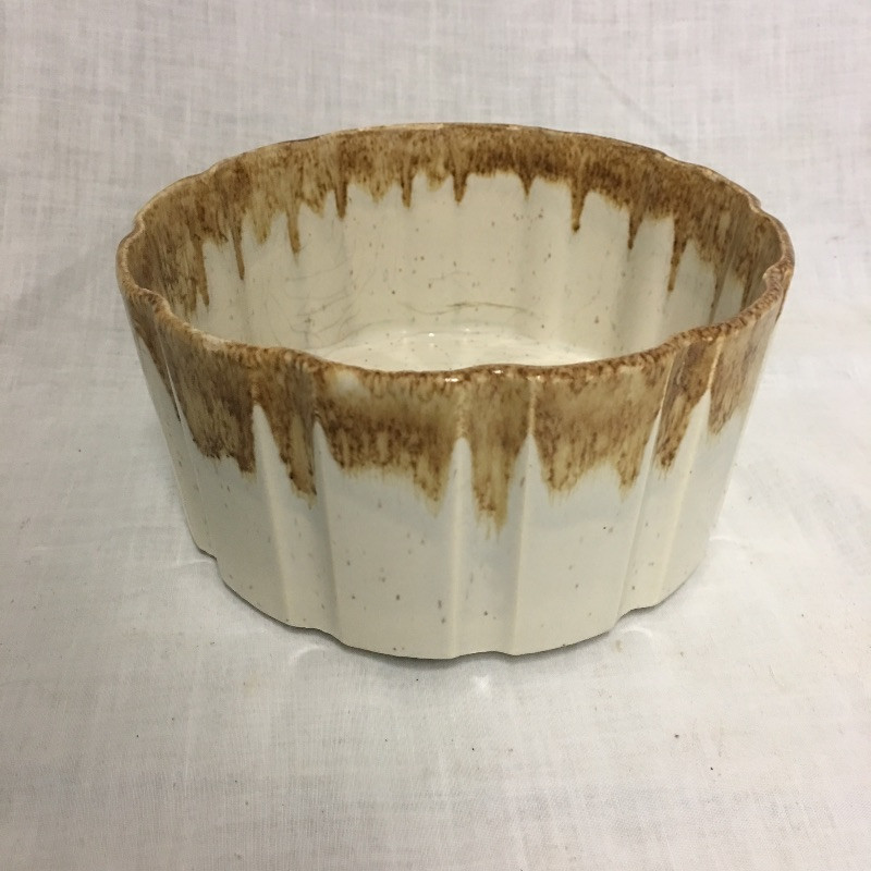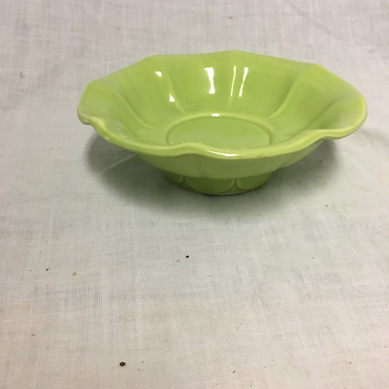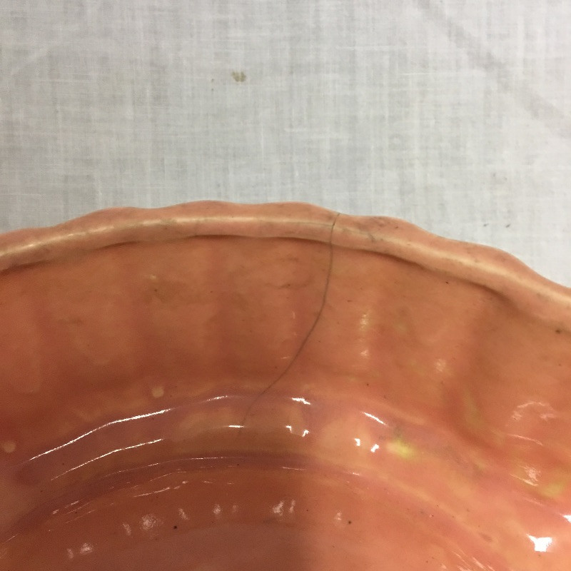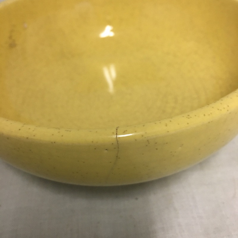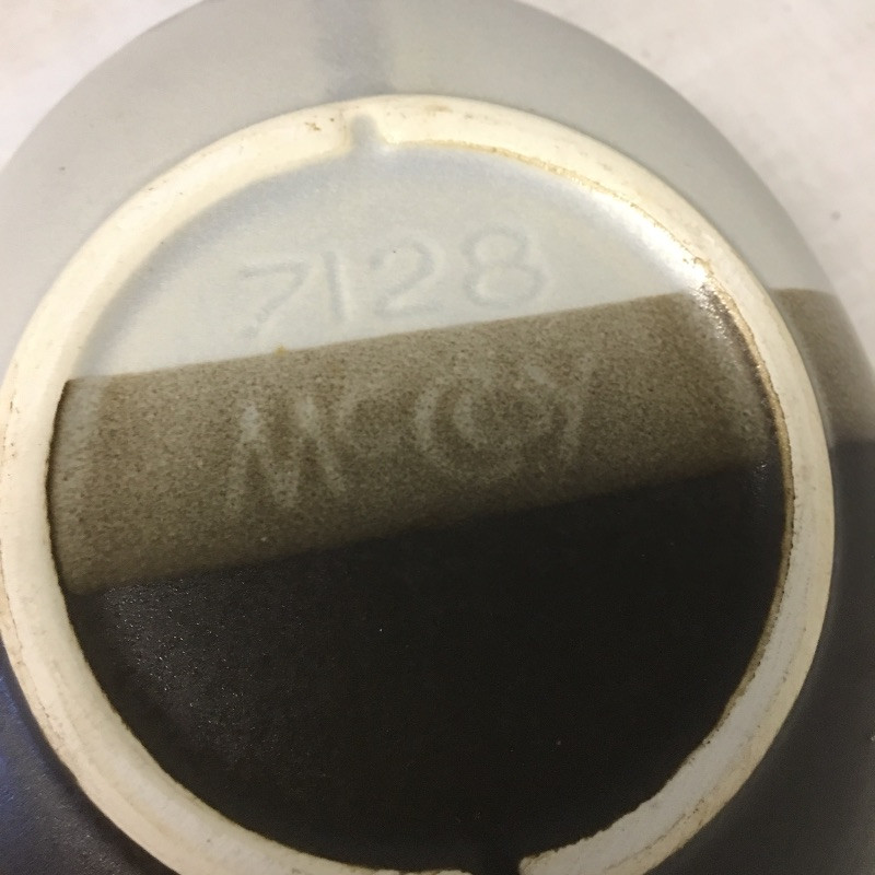 Six pieces of McCoy pottery in an array of colors. Included here are items numbered # 0789, 7128 and 7516. The others are not numbered. Two have cracks so look at images closely. Largest bowl measures 12”D x 3” tall.