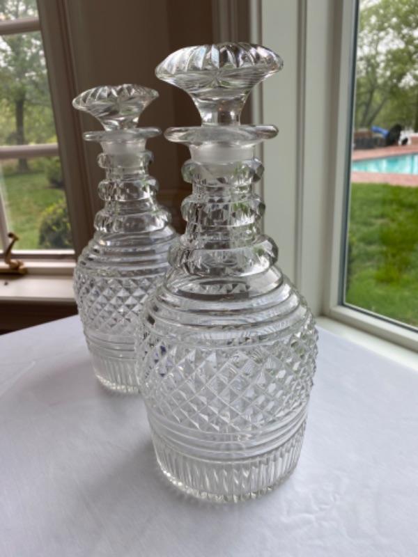 Pair of Antique Regency Style Irish Cut Glass Decanter 10.5” tall with stopper and approxiemately 4” round