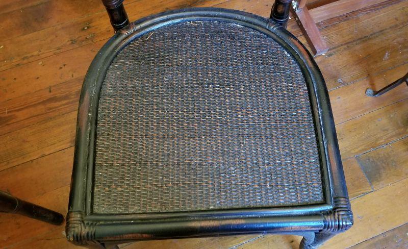 Matched pair of side chairs - rattan backs, Asian styling. Both used but in good condition. Solid. 38" tall, 22" across, 22" deep.