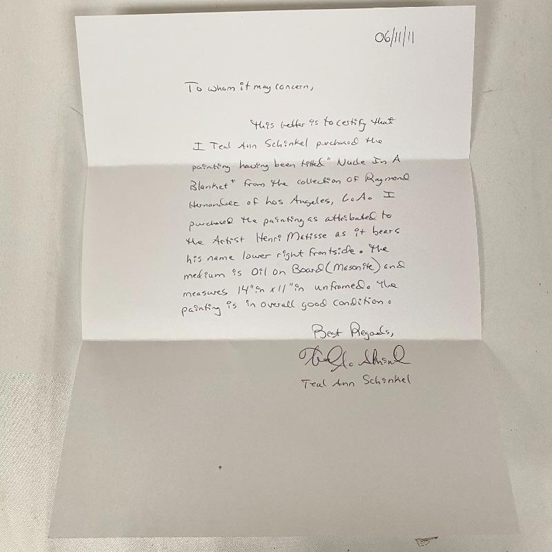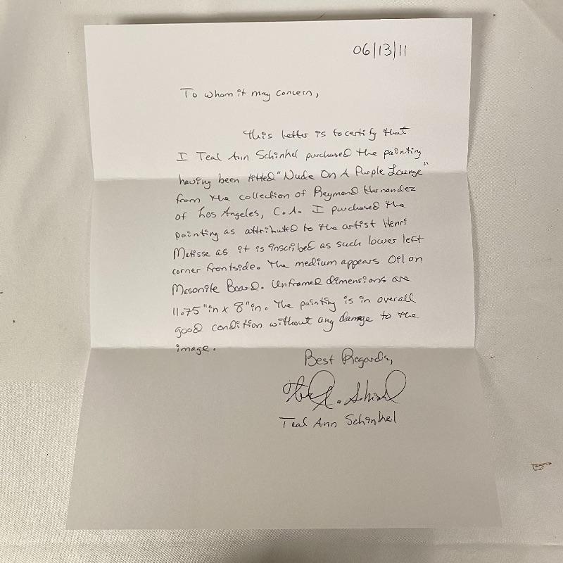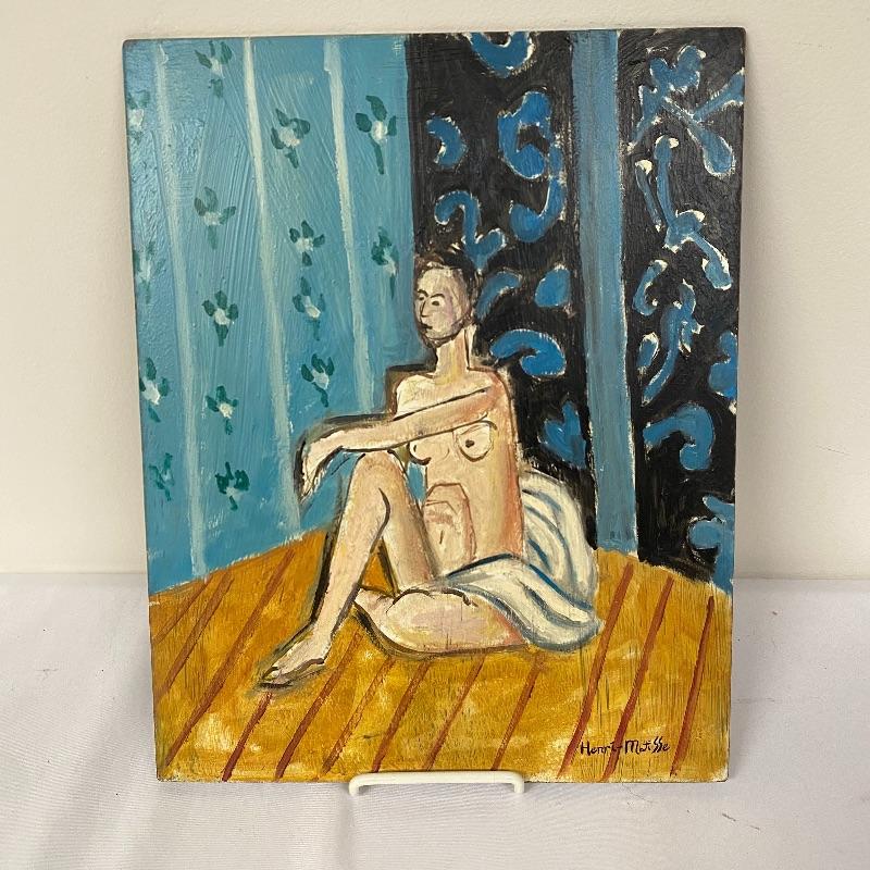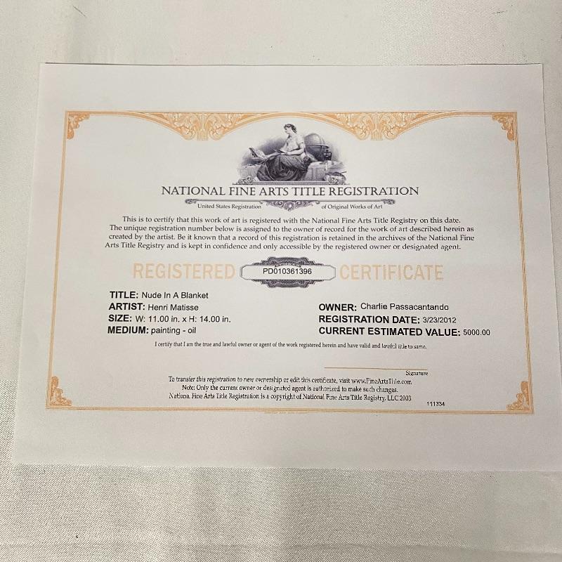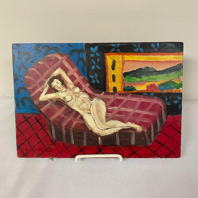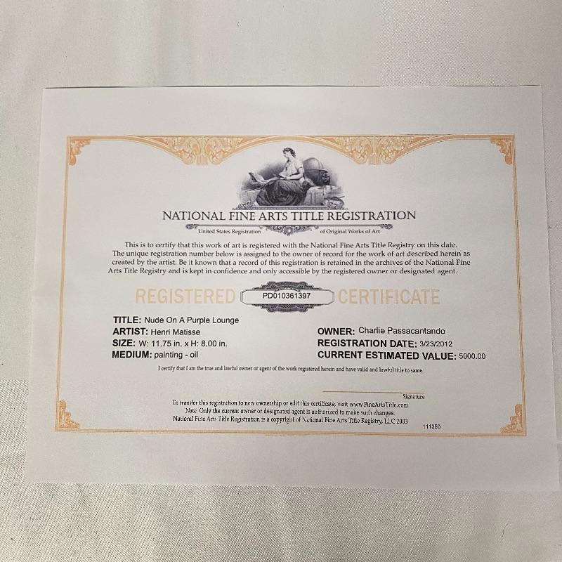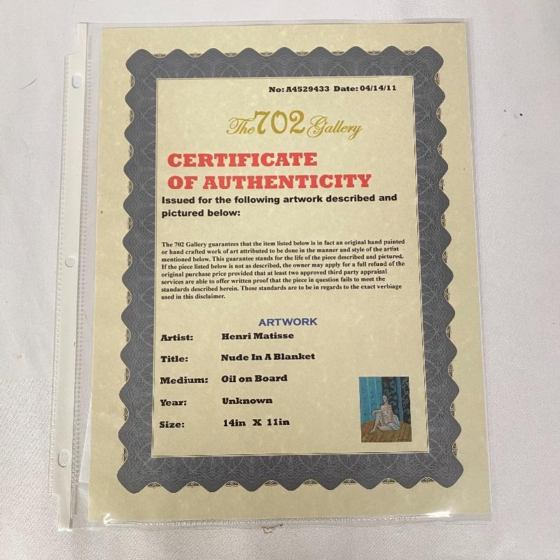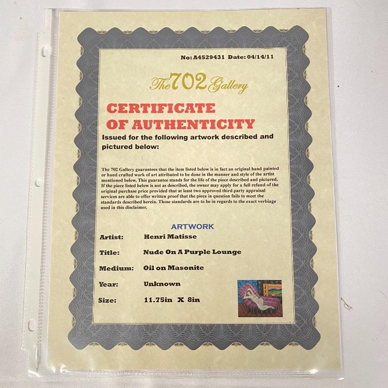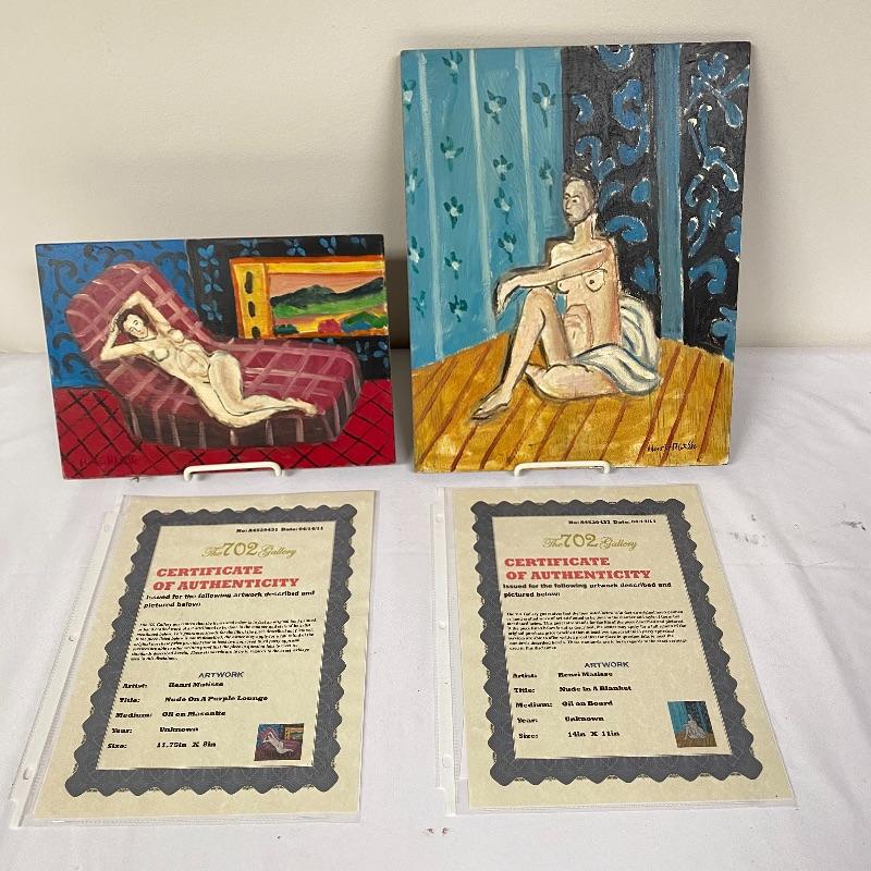 This lot includes two Matisse styled art pieces and their certificates of authenticity. The art piece labeled “Nude In a Blanket” is painted with oil on a board. It measures about 11in x 14in. The art piece labeled “Nude On a Purple Lounge” is painted with oil on a masonite. It measures about 11.5in x 8in. See photos for accompanying paperwork.