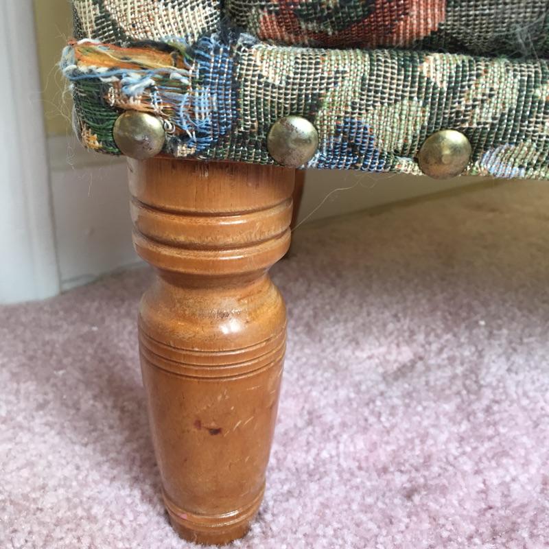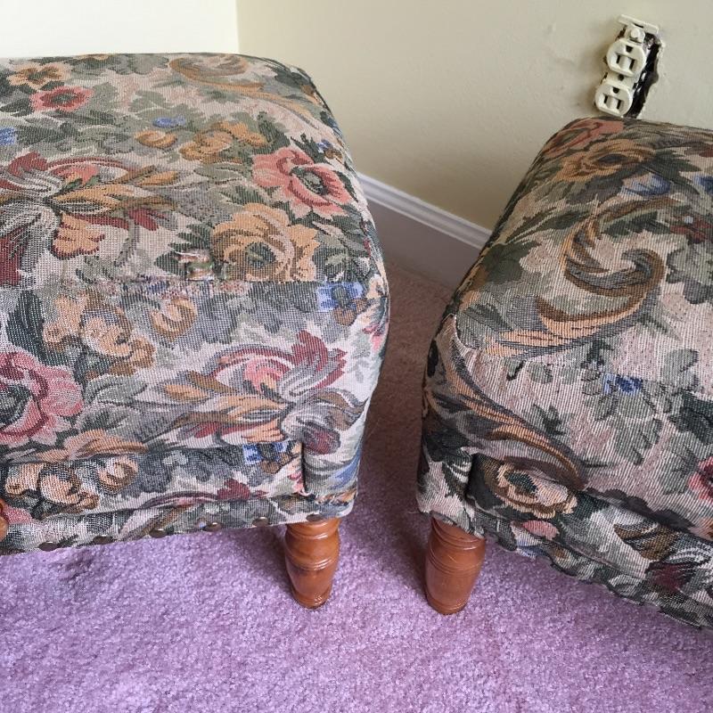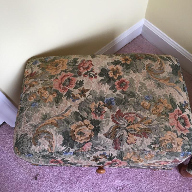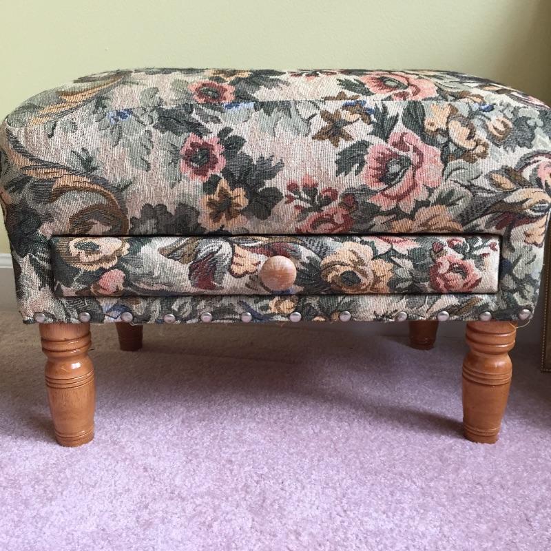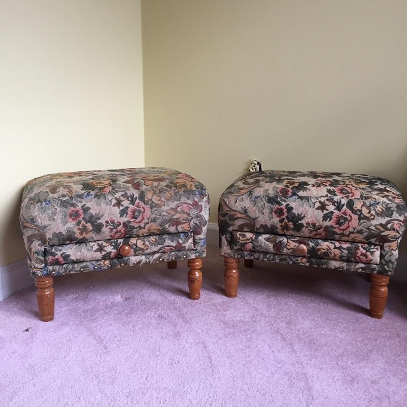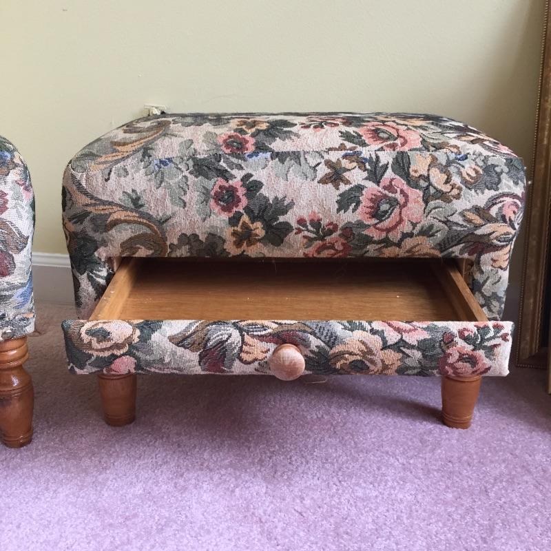 Add some timeless elegance to your space with these two matching footstools. Encased in beautiful floral tapestry both have a handy little drawer to store a book or something similarly sized. There is a slight fading on one of the stools that would go unnoticed unless they are side by side. Pieces measure 12W x 13H x 19”L.