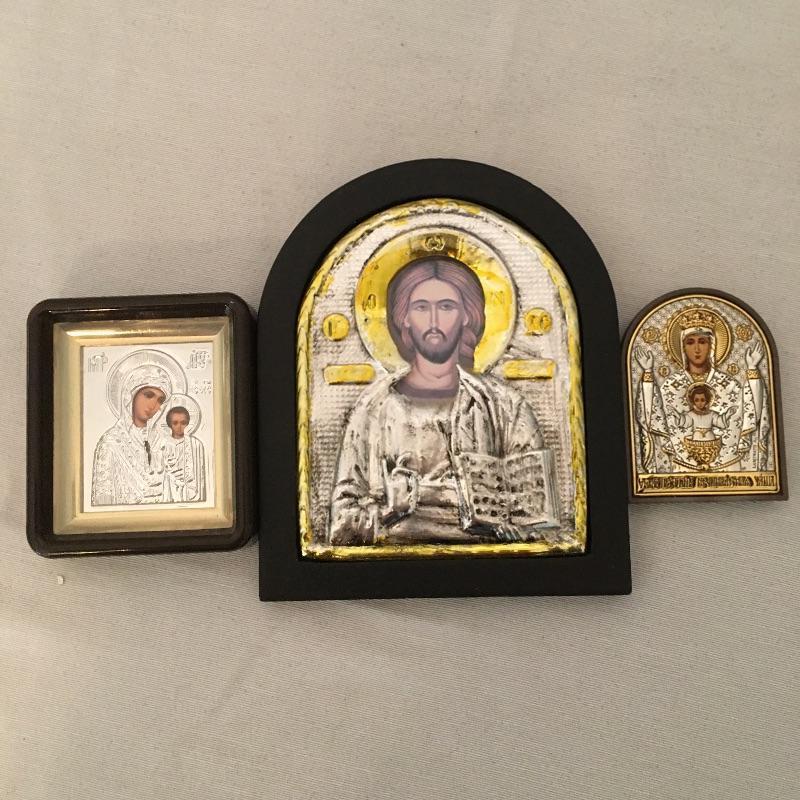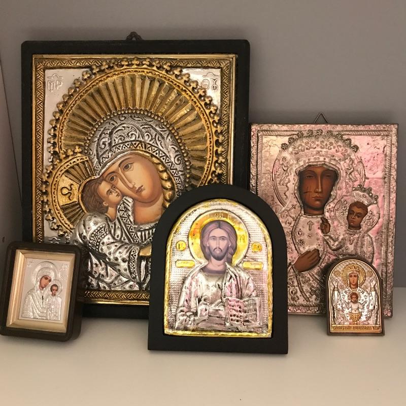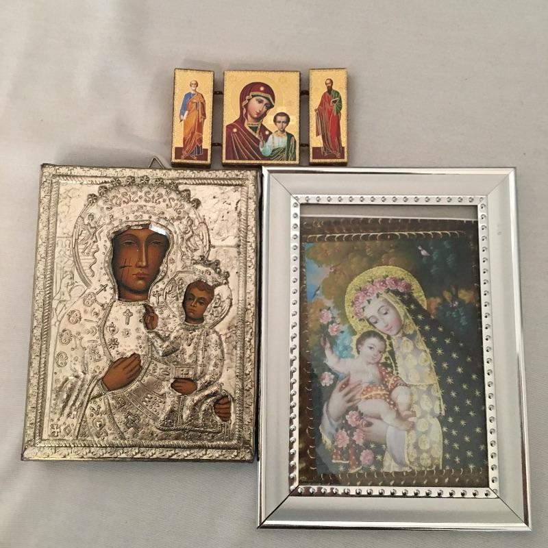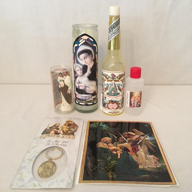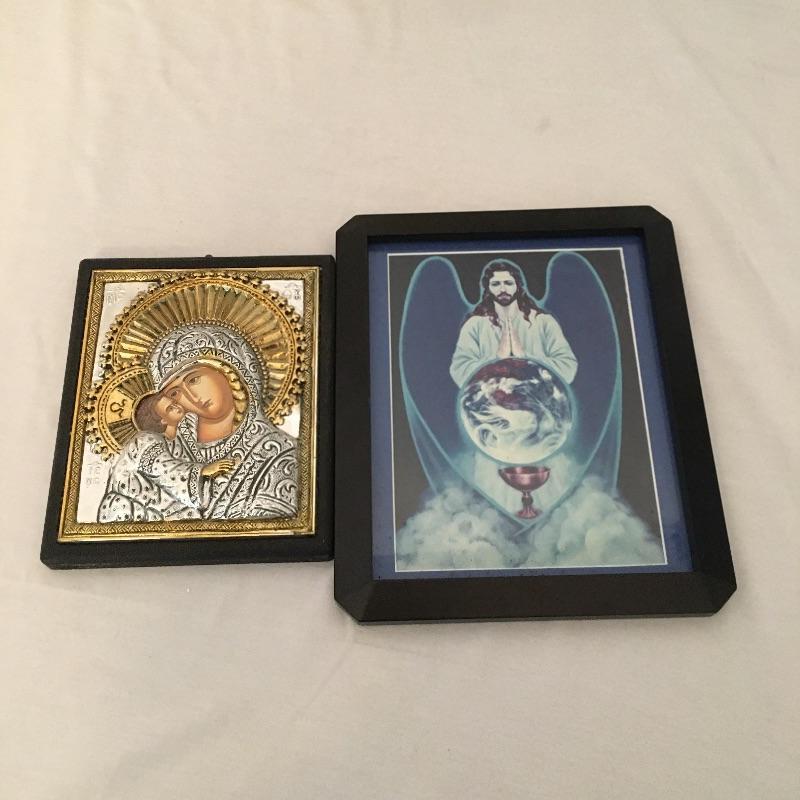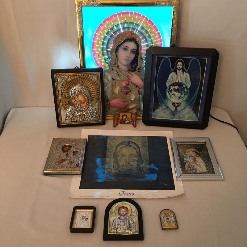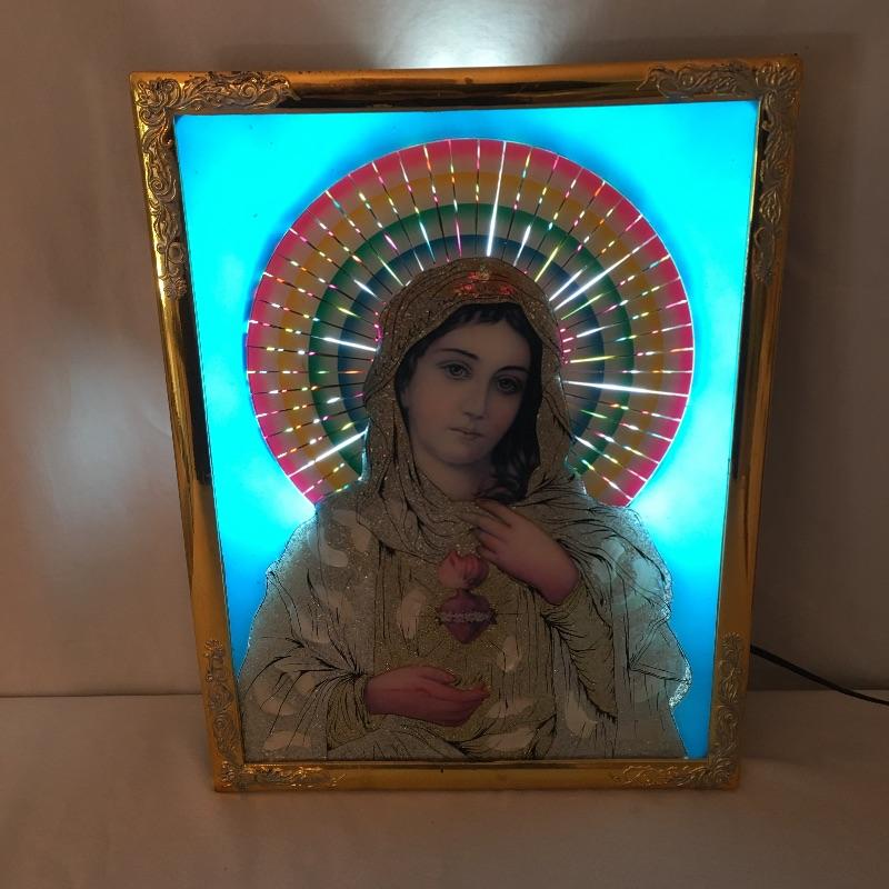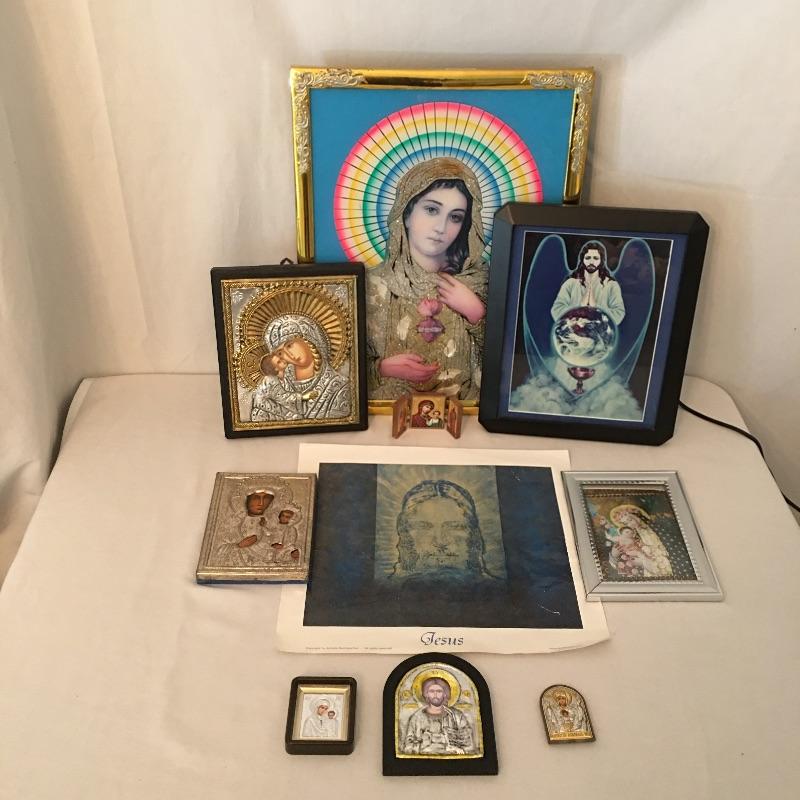 Nice collection of biblical people that includes a cool back-lit Virgin Mary that would make a great statement. Also includes several Mexican tin art pieces, some unframed art, Holy water, Florida water, prayer candle and more.Largest piece of artwork measures 13” x 16.75” and is the piece that lights up. Shipping available