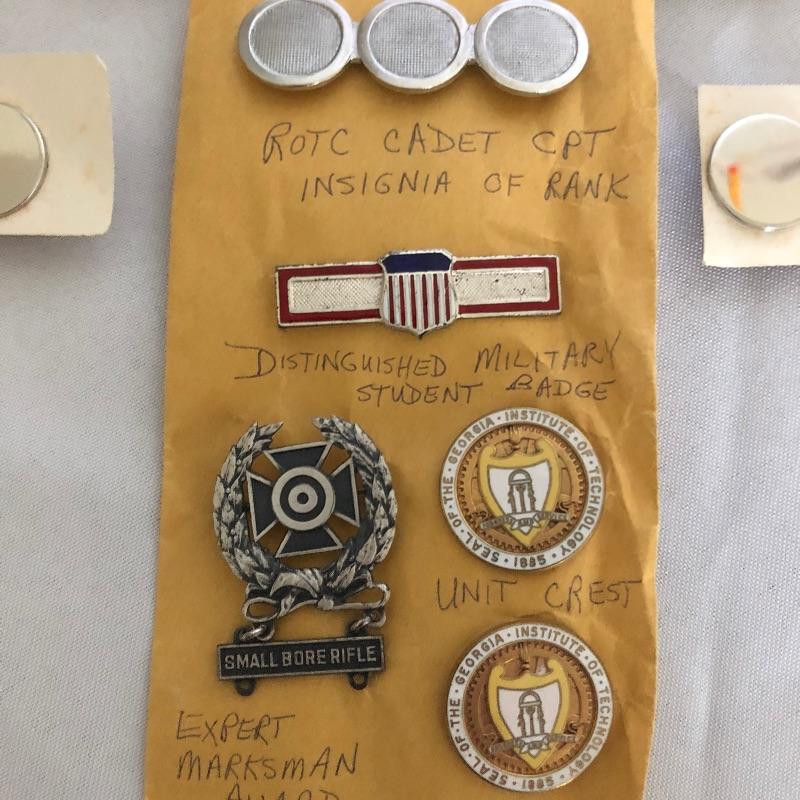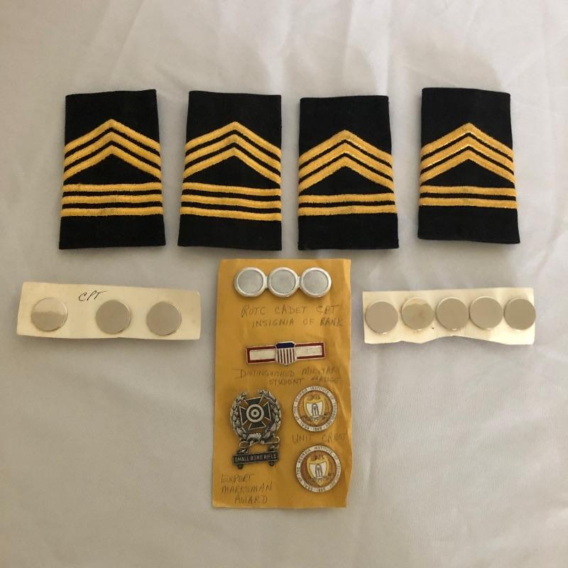 Some great badges here that includes ROTC Cadet insignia of rank, expert marksman, unit crest and more. Lot also includes epaulettes and more.