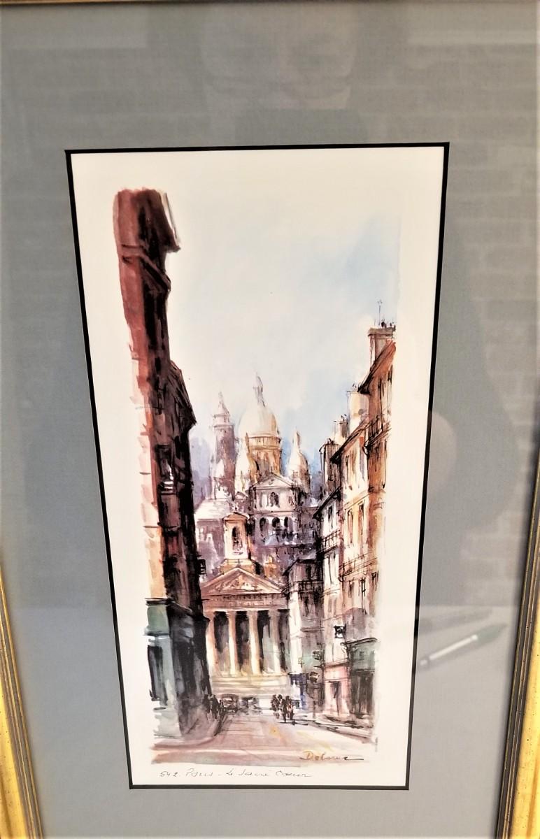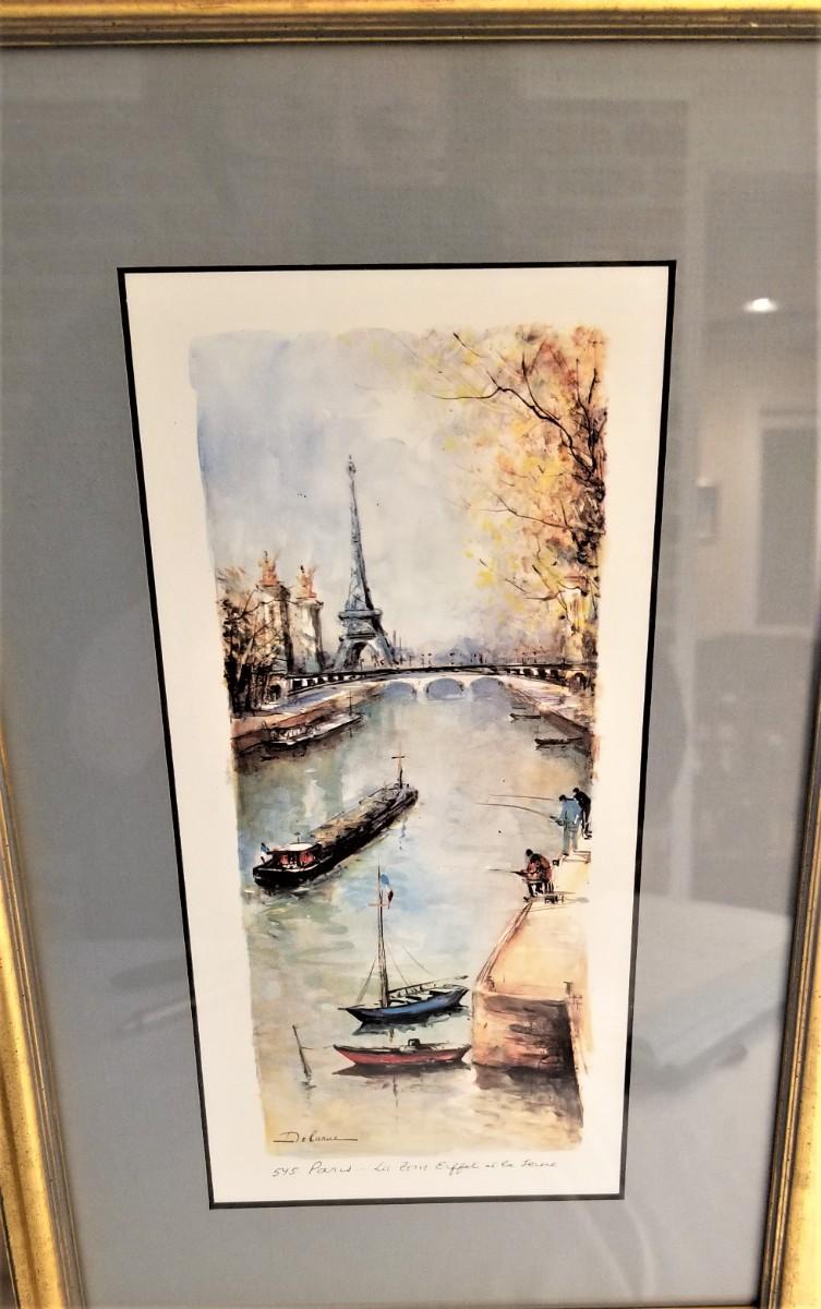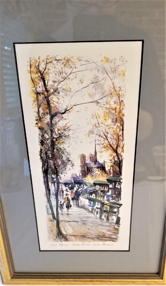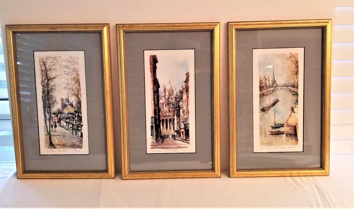 Three Parisian street scenes in frames - Eiffel Tower, Sacre Coeur, and Notre Dame. Good condition - each measures 9" x 14".