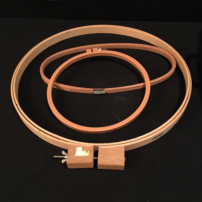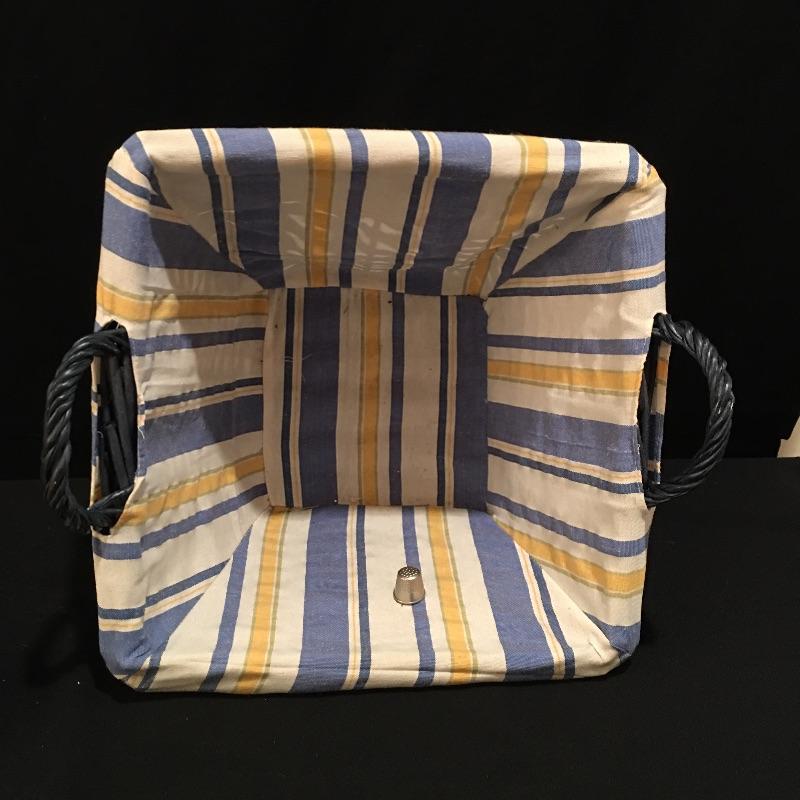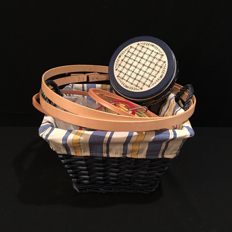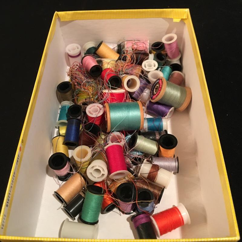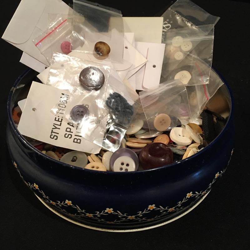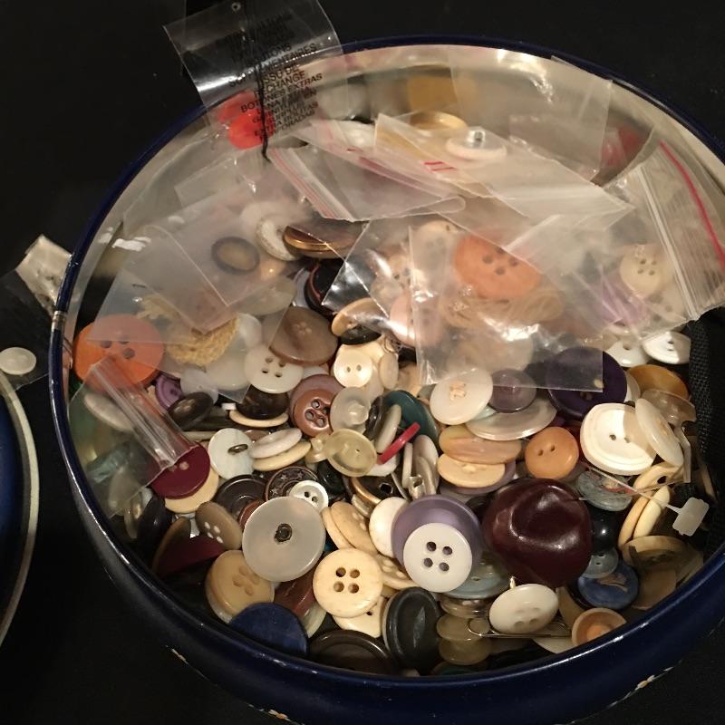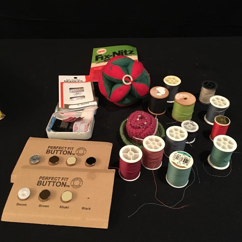 This practical lot includes woven basket with liner, box of buttons, thread, needles, pin cushions, embroidery hoops, yarn and more.