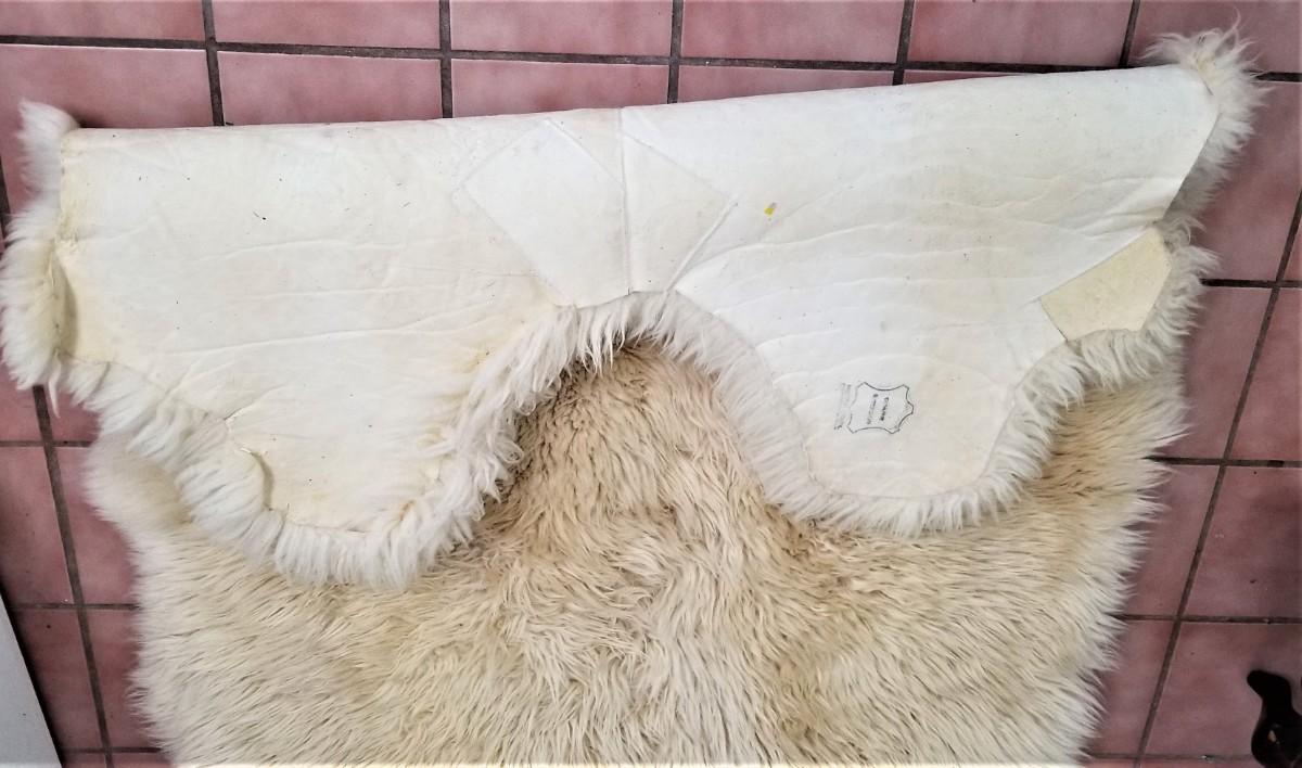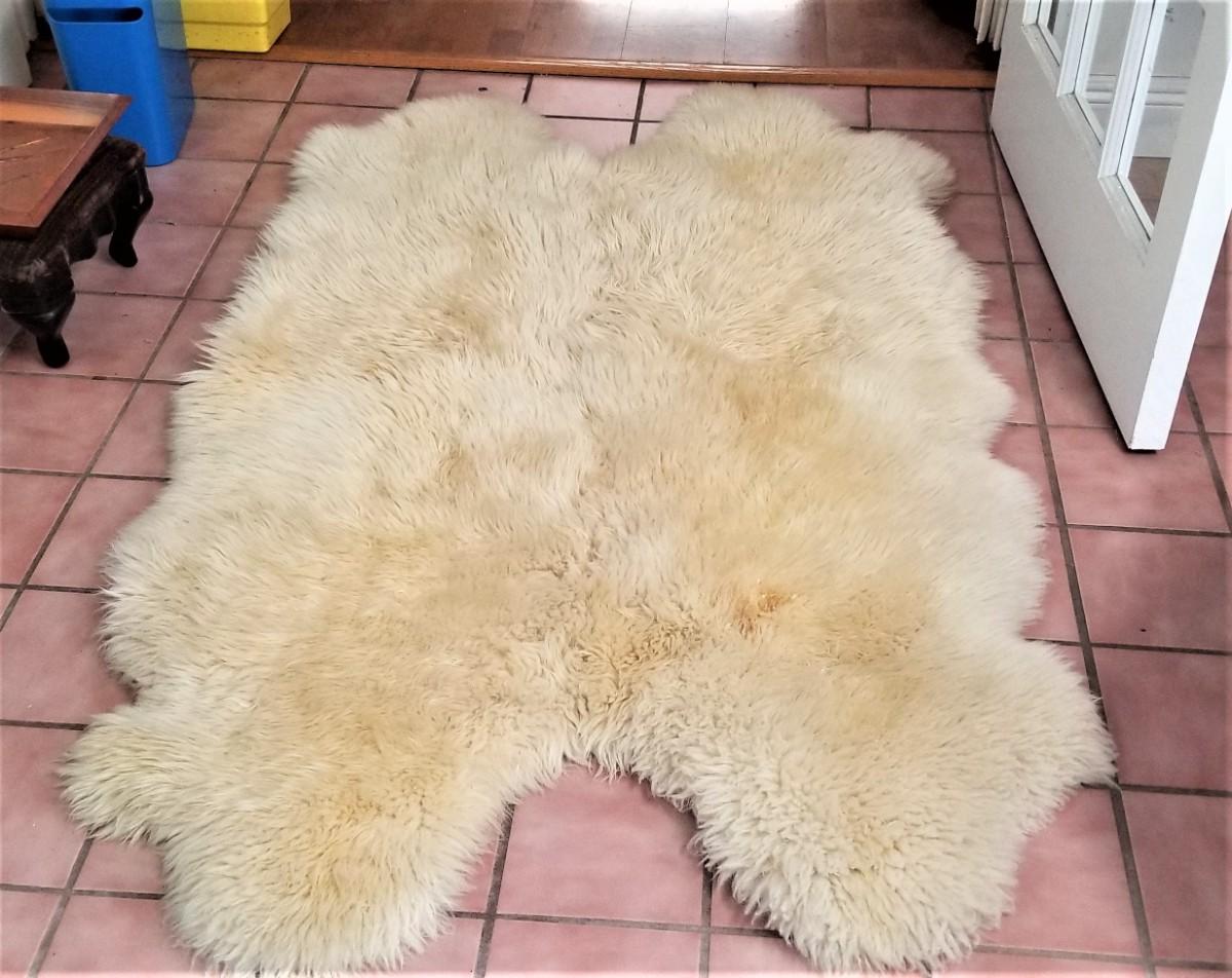 Stamped "Made in Brazil" - authentic sheep skin rug - suede back. Roughly 68" x 43".