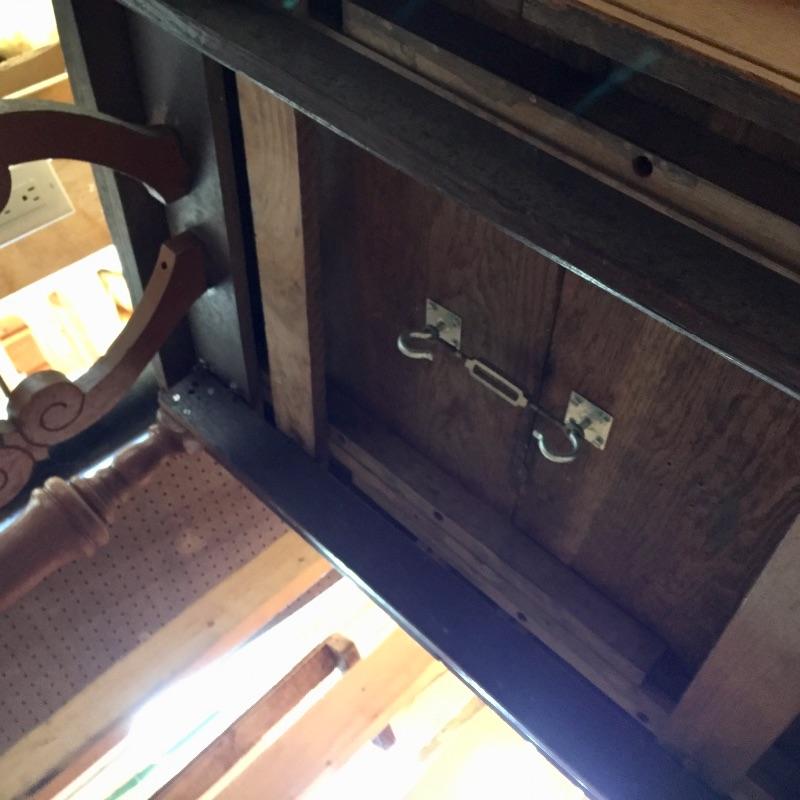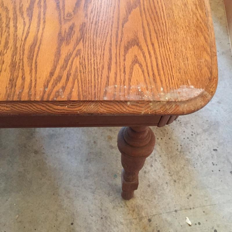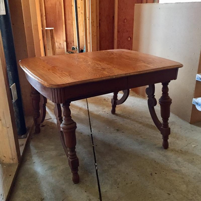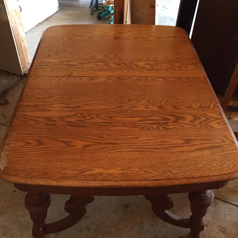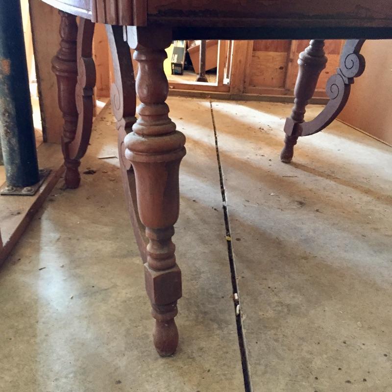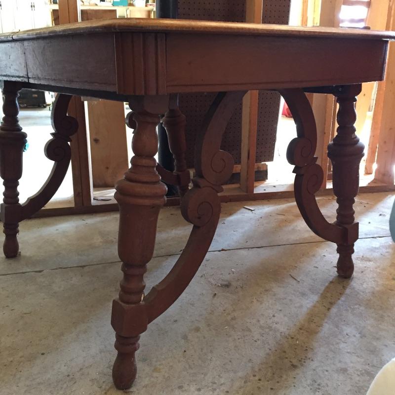 Built to last, this lovely oak table has ornate legs and is a very sturdy piece. The majority of the table is in very nice condition. The top of the table has some marks, see images.