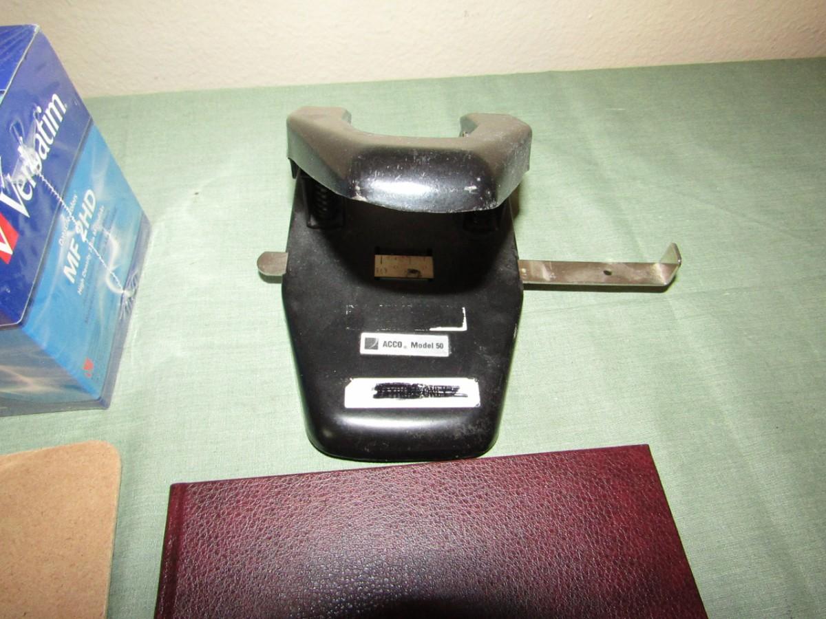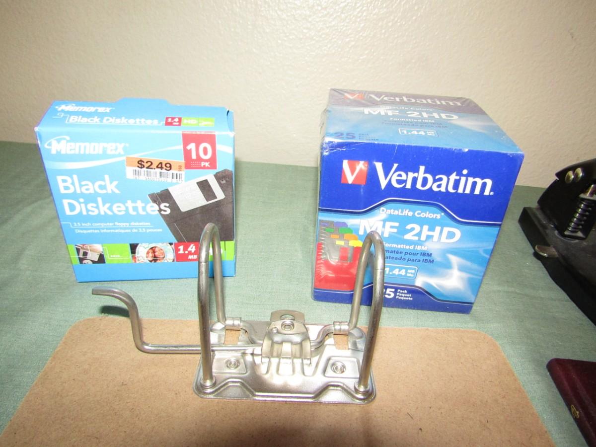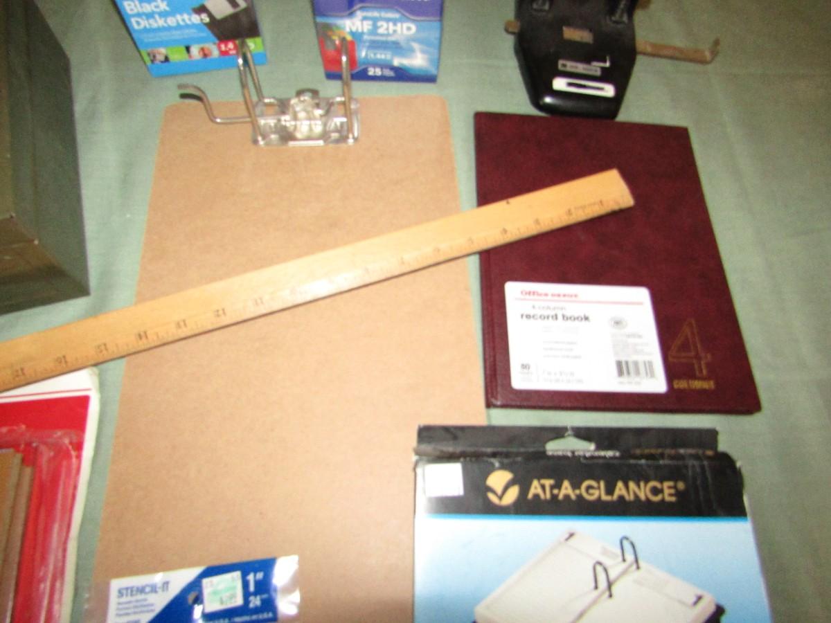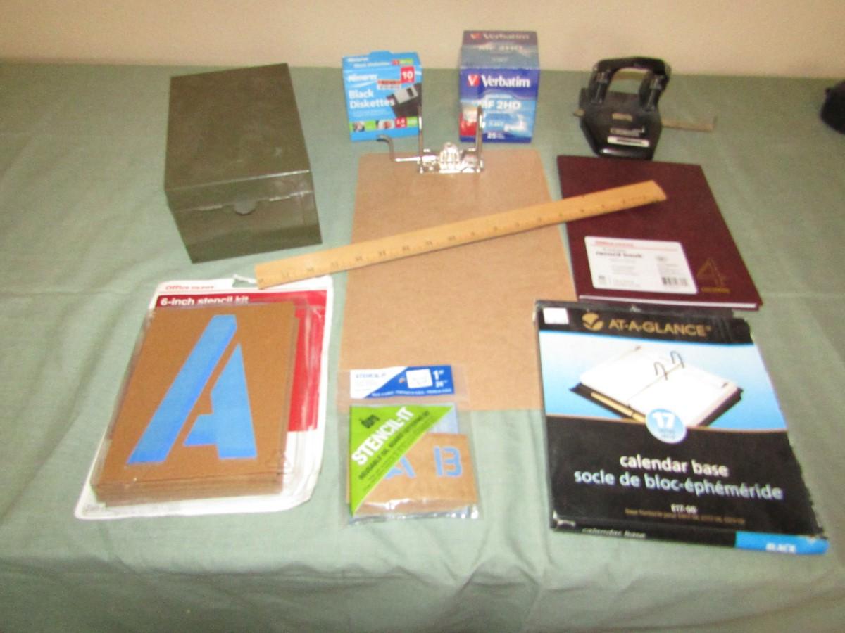 OFFICE SUPPLIES: STENCILS, 2 HOLE PUNCH, CALENDAR BASE, FLOPPY DISCS,
