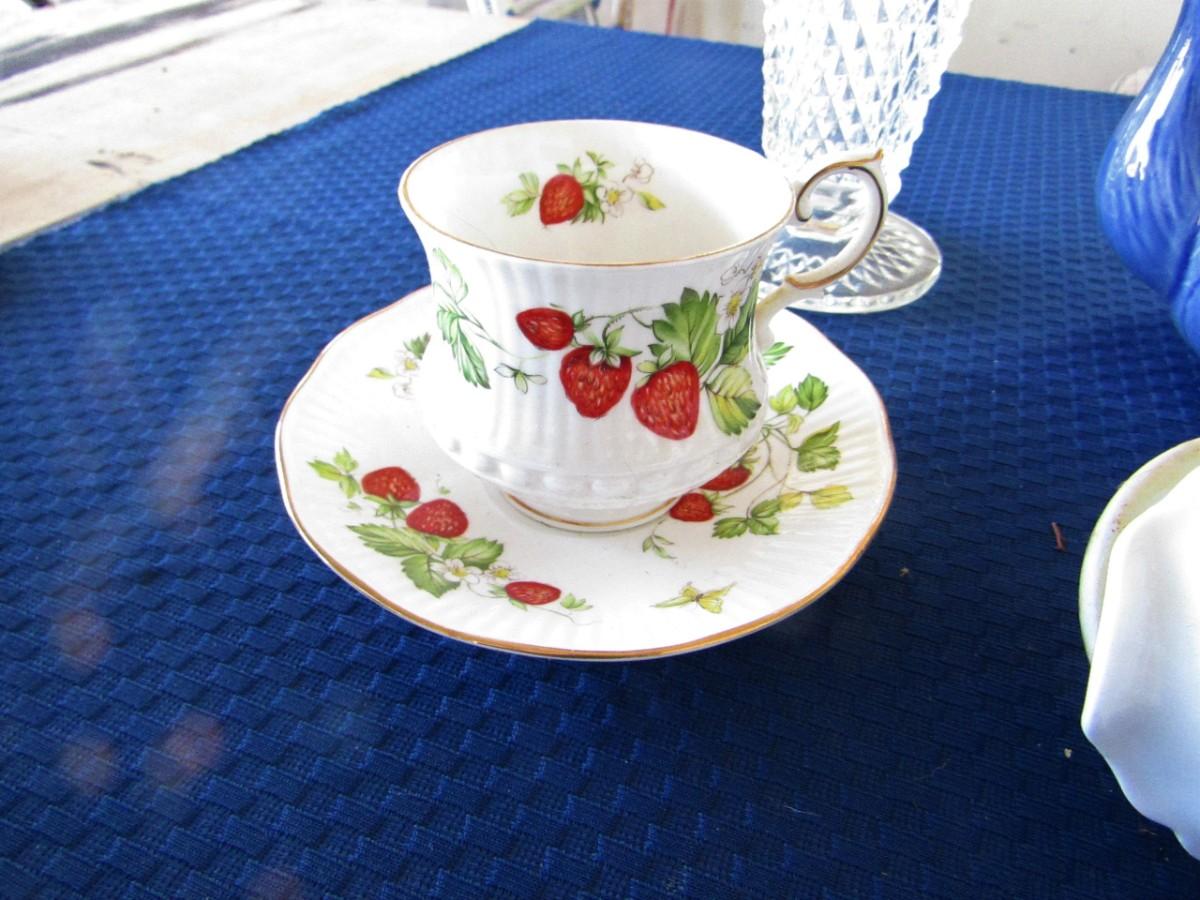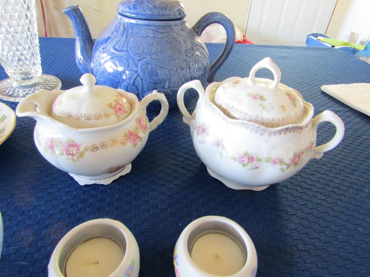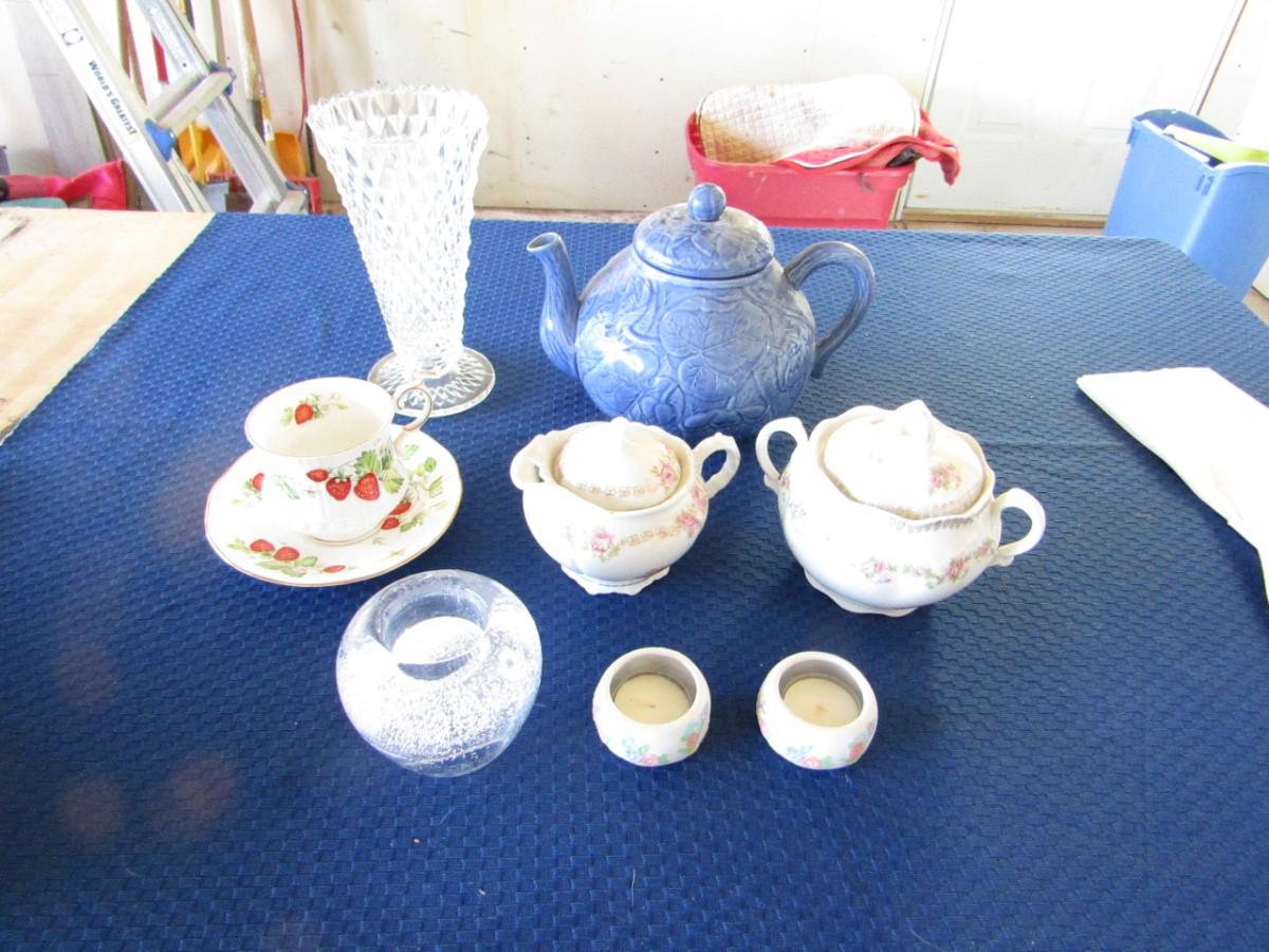 ROYAL AUSTRIA CREAMER AND SUGAR BOWL, QUEENS FINE BONE CHINA TEACUP MADE IN ENGLAND, "VIRGINIA STRAWBERRY" PRINT, CANDLES, TEAPOT, CRYSTAL VASE, & MORE
