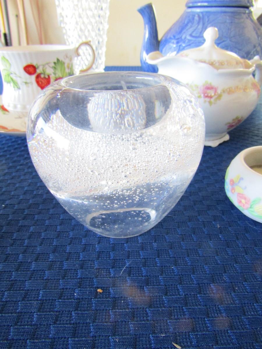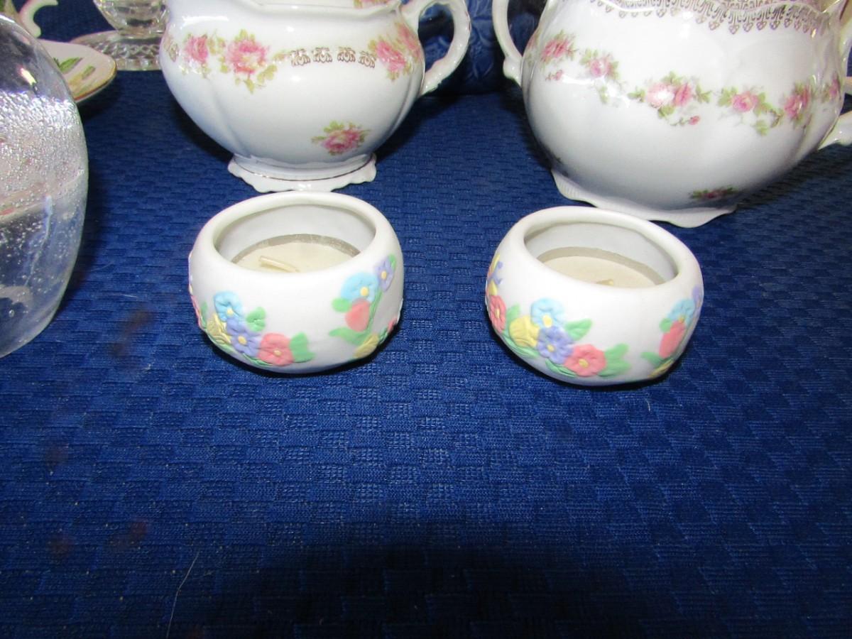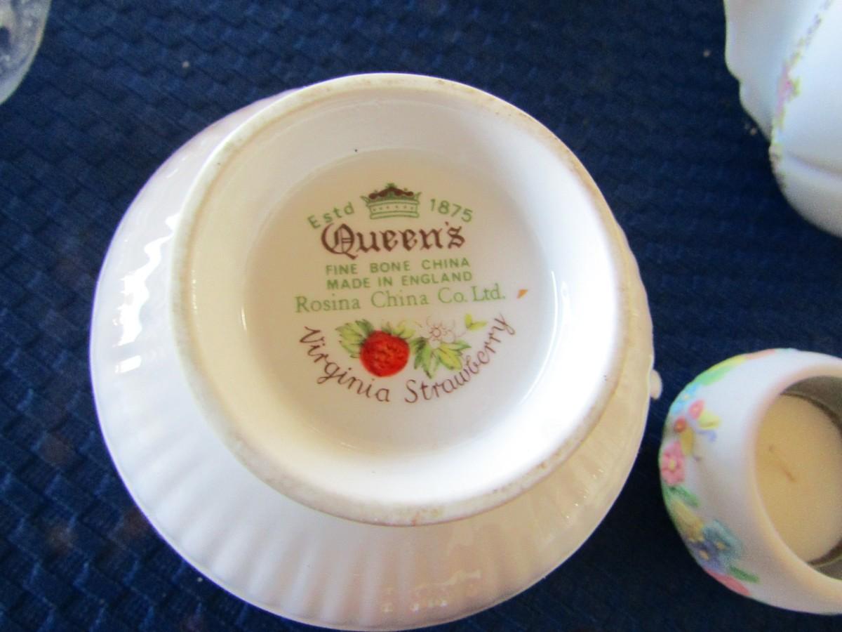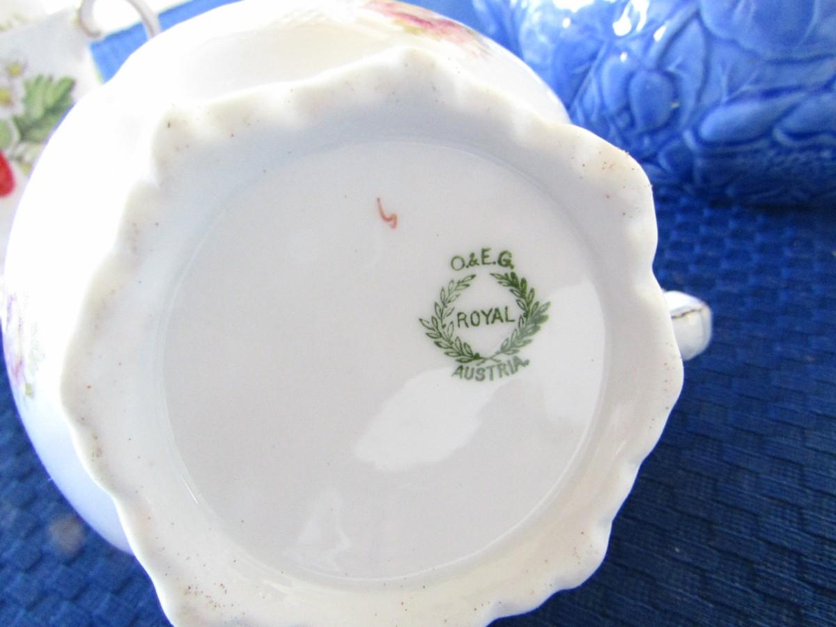 ROYAL AUSTRIA CREAMER AND SUGAR BOWL, QUEENS FINE BONE CHINA TEACUP MADE IN ENGLAND, "VIRGINIA STRAWBERRY" PRINT, CANDLES, TEAPOT, CRYSTAL VASE, & MORE