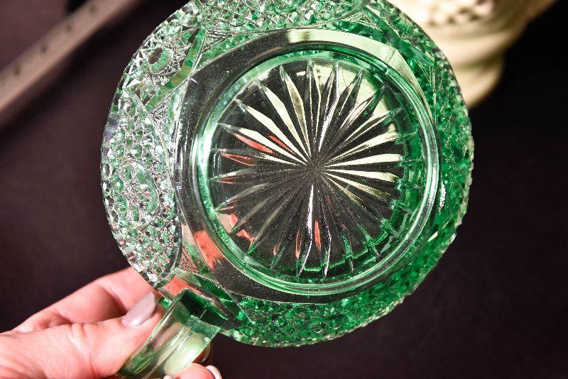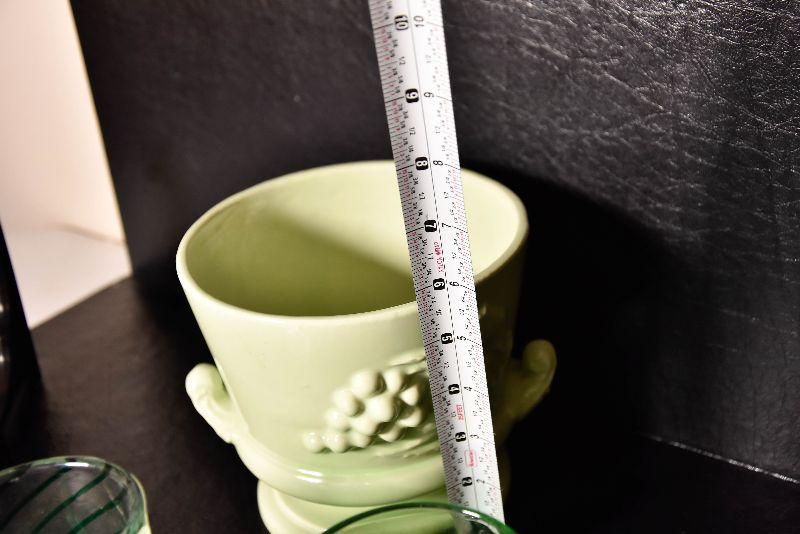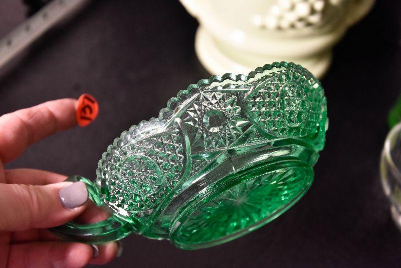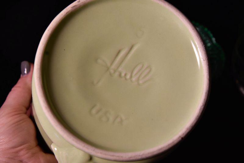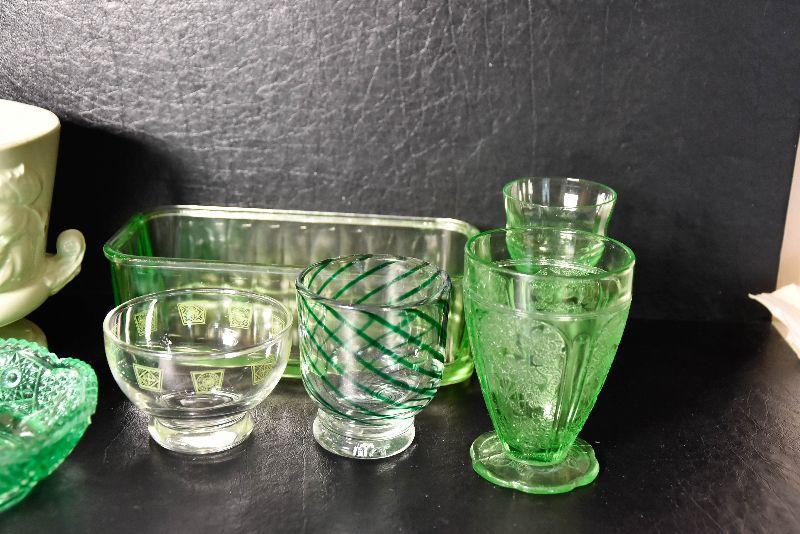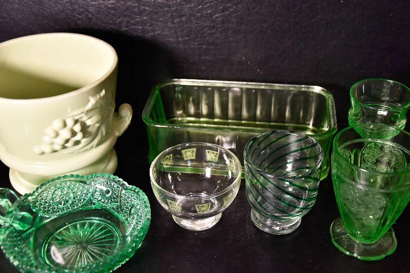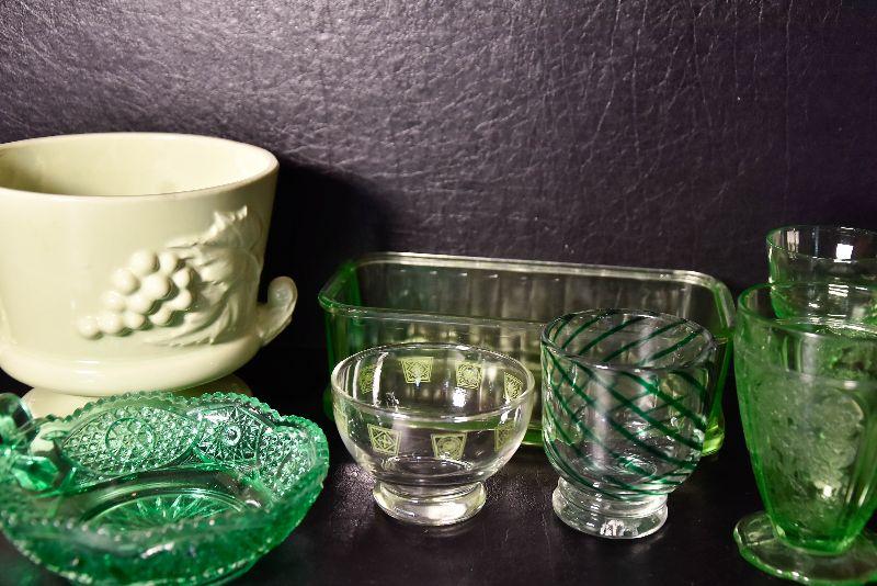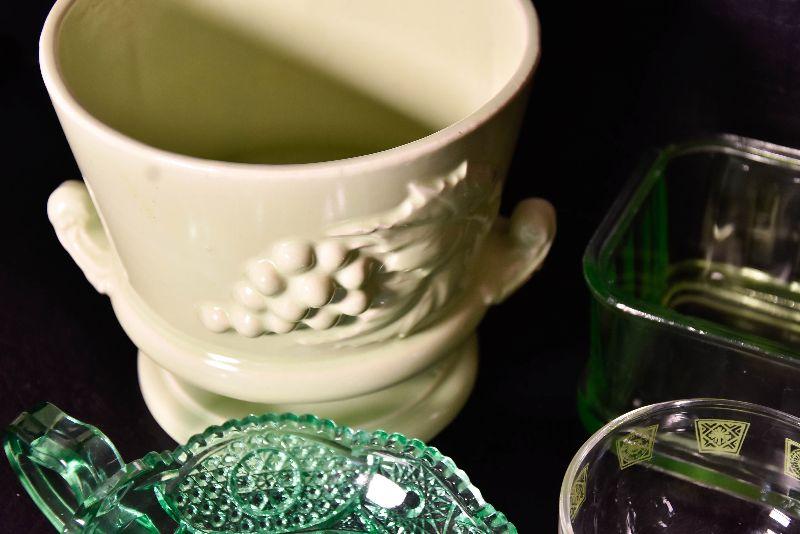 Mix match of green - depression glass, Hull pottery, and more