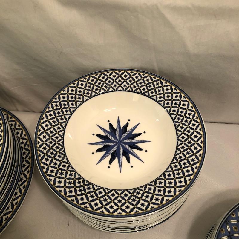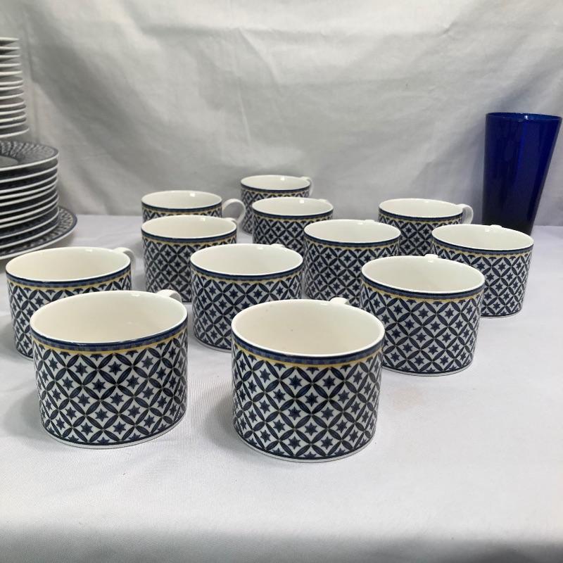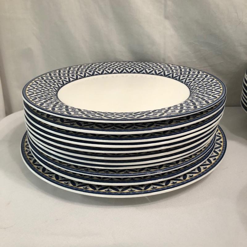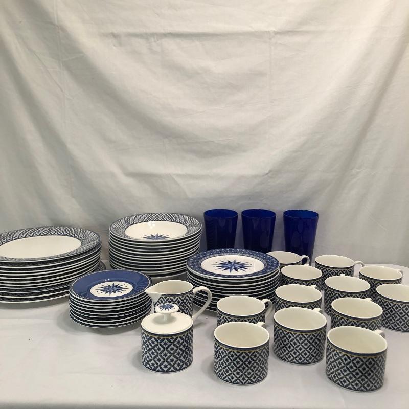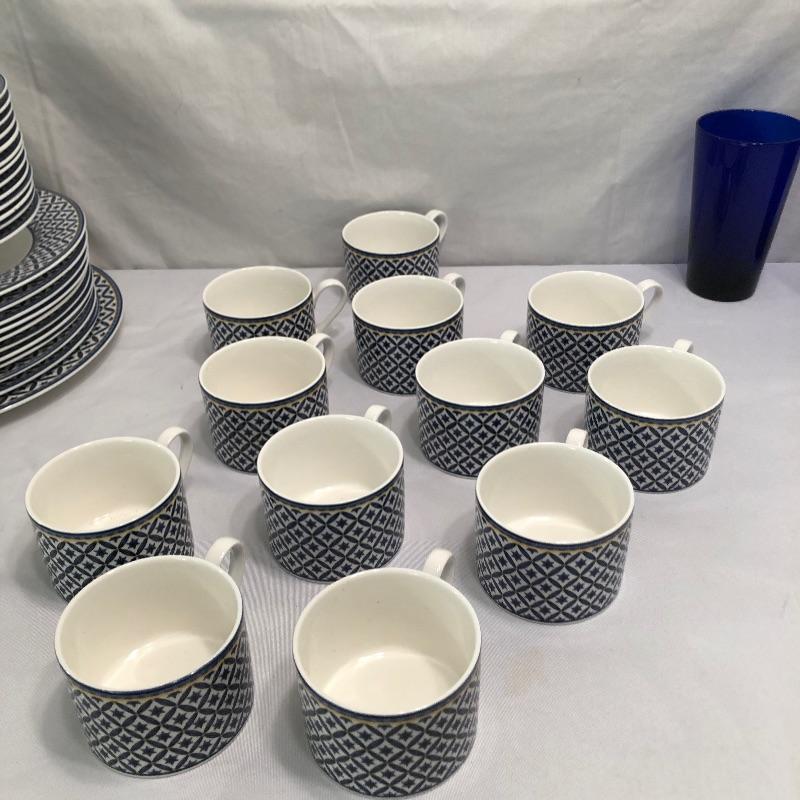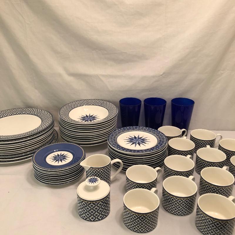 This set has at a minimum of a 9 person setting with 10 dinner plates, 11 side plates, 9 saucers, twelve cups, 13 bowls, a sugar bowl, creamer and serving plate. In addition we have added 3 blue glasses.