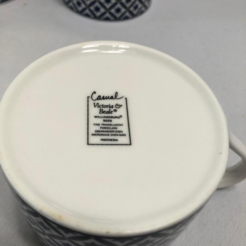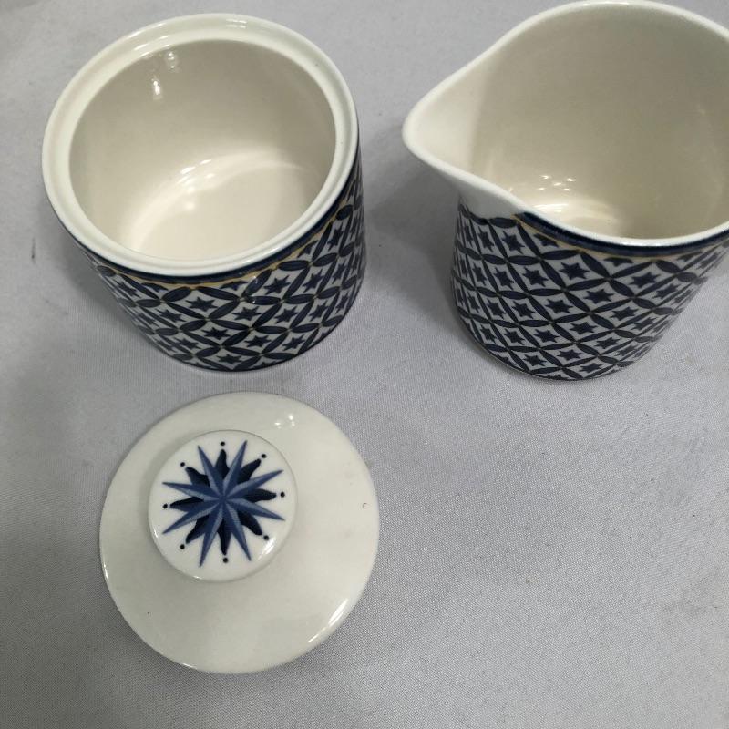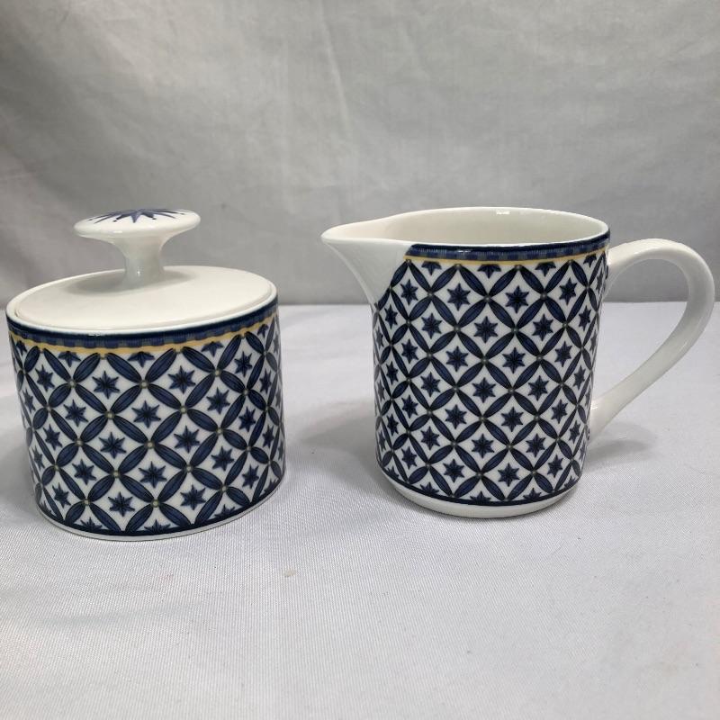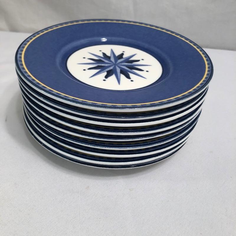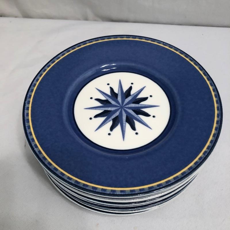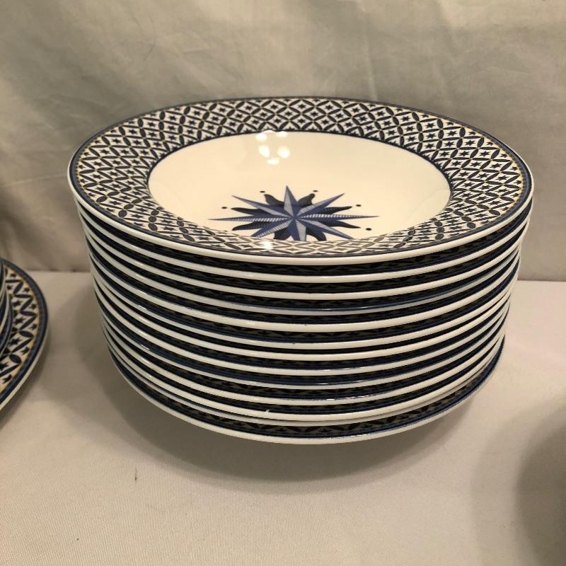 This set has at a minimum of a 9 person setting with 10 dinner plates, 11 side plates, 9 saucers, twelve cups, 13 bowls, a sugar bowl, creamer and serving plate. In addition we have added 3 blue glasses.