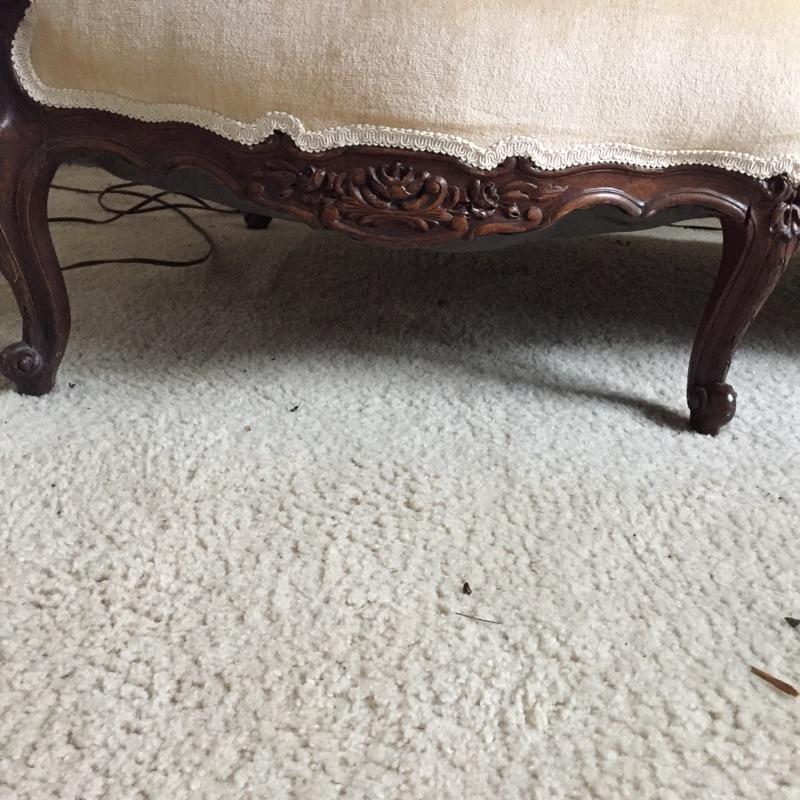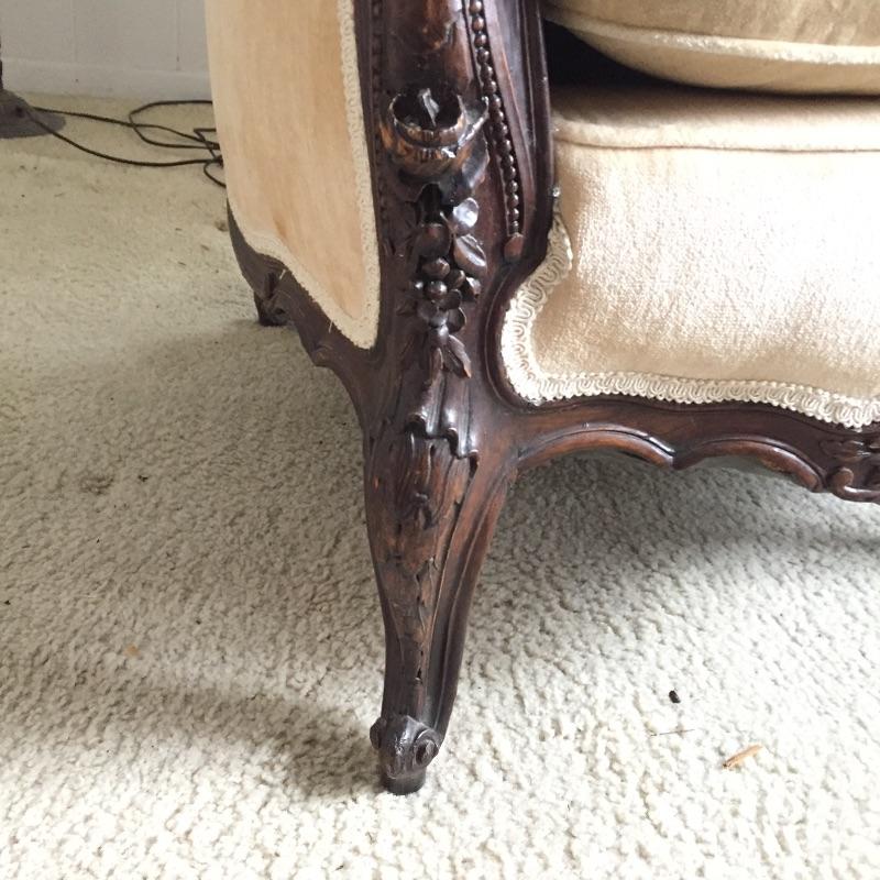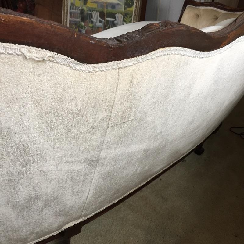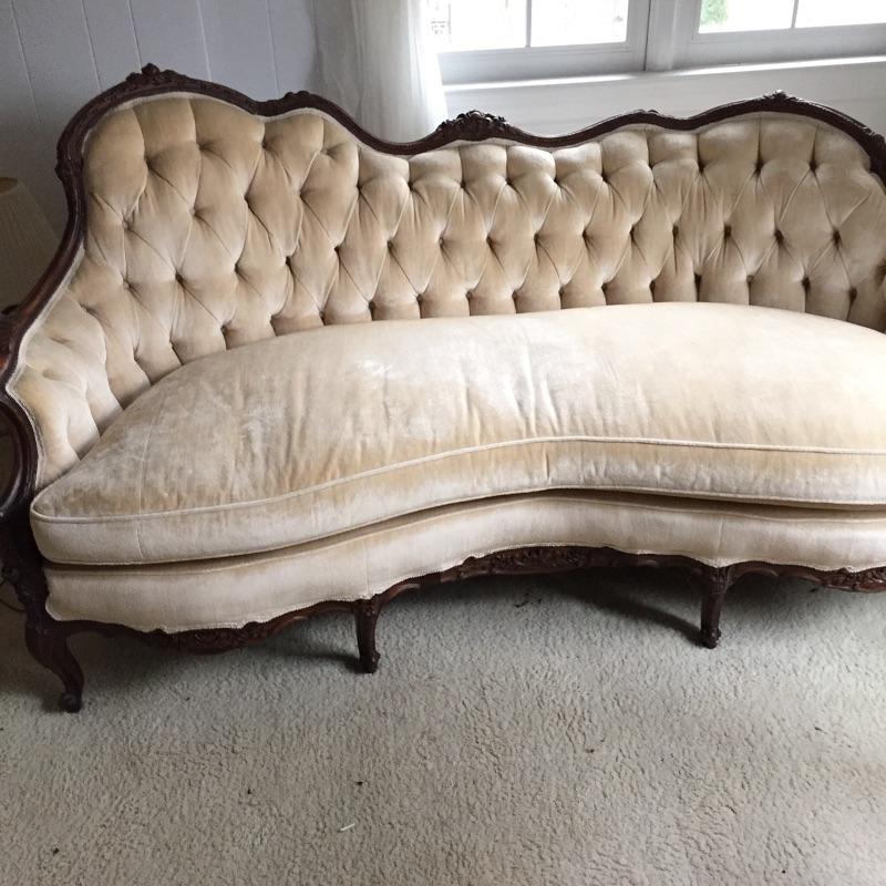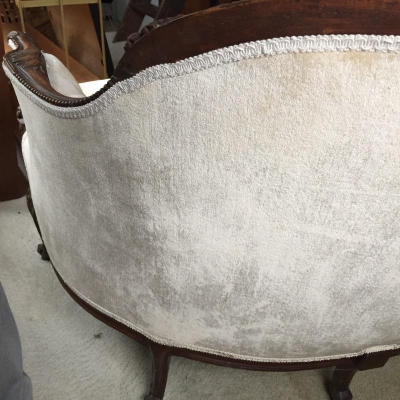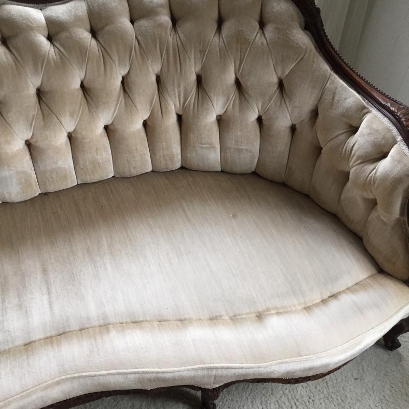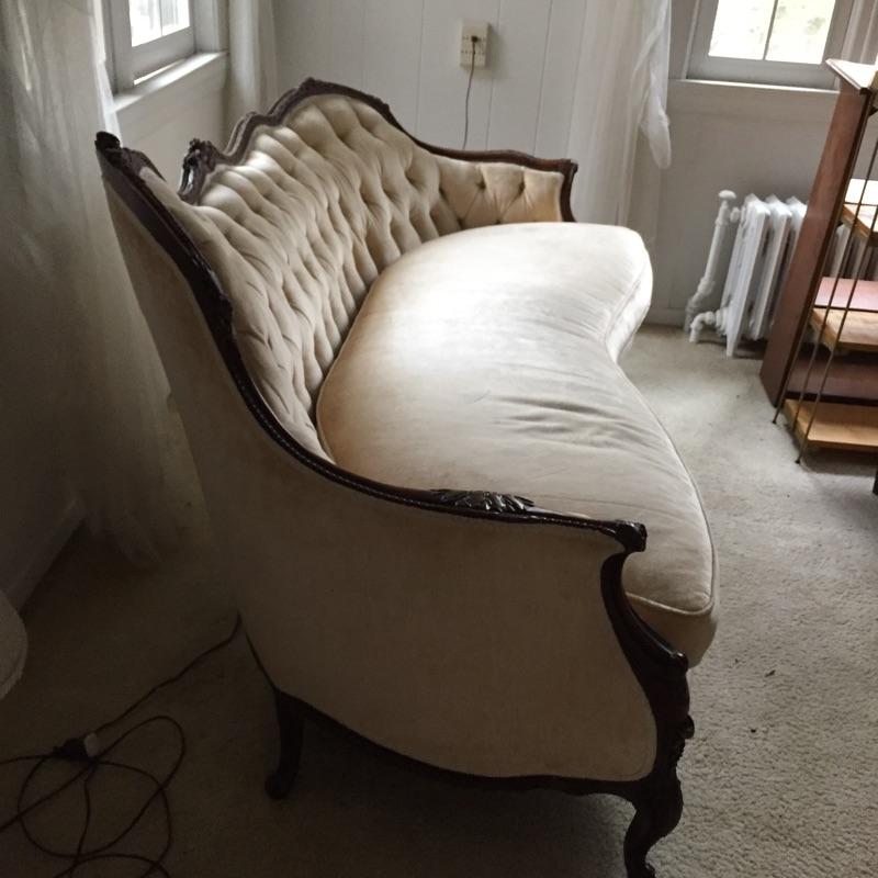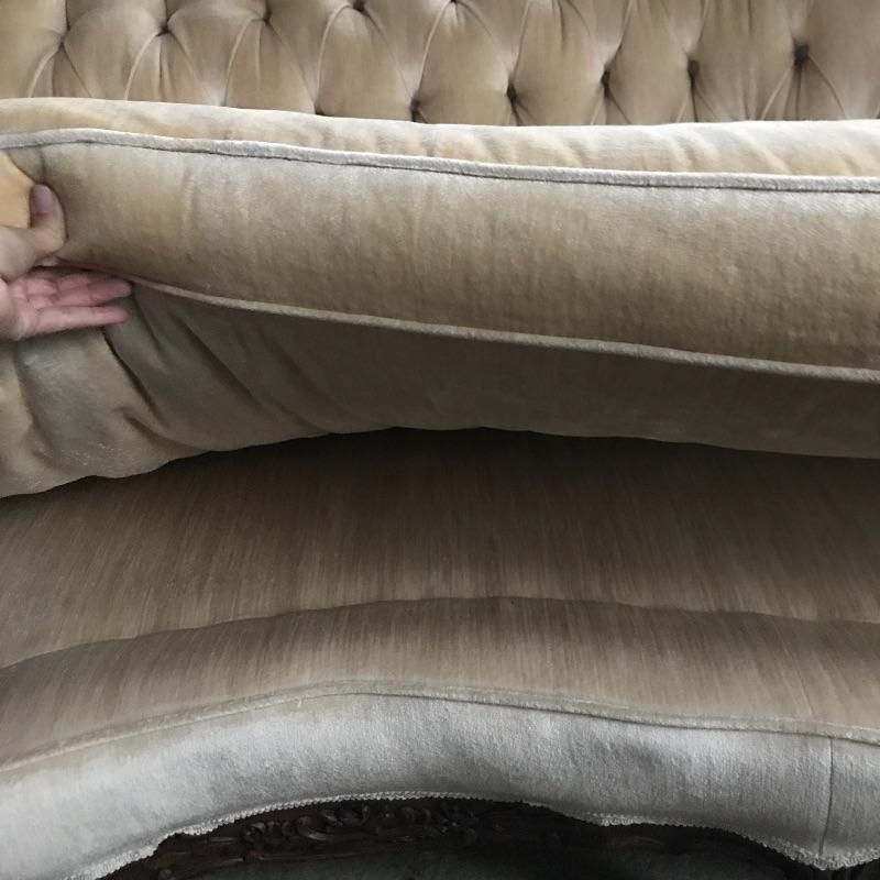 Beautiful Victorian velvet tufted couch with back higher on one side and intricate woodwork on the frame of the couch. Truly a beautiful couch. Couch measures 34” x 74” x 37”. Seat height 19”.