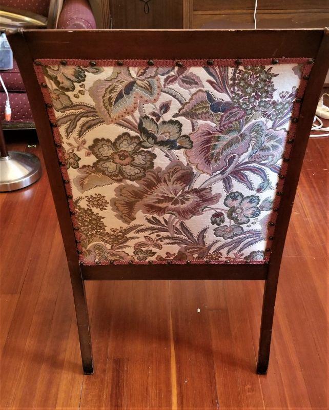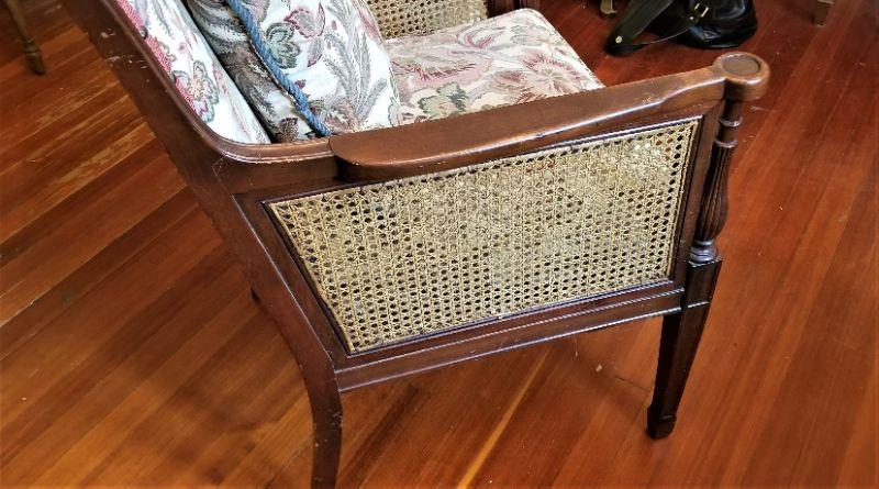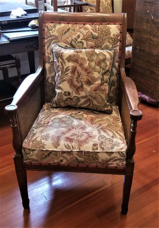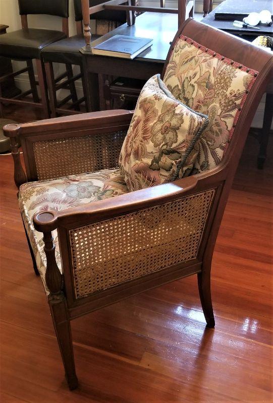 Nice vintage upholstered chair with cane inserts. Gently used condition. Measures 40" tall, 25.5" across, 24" deep.