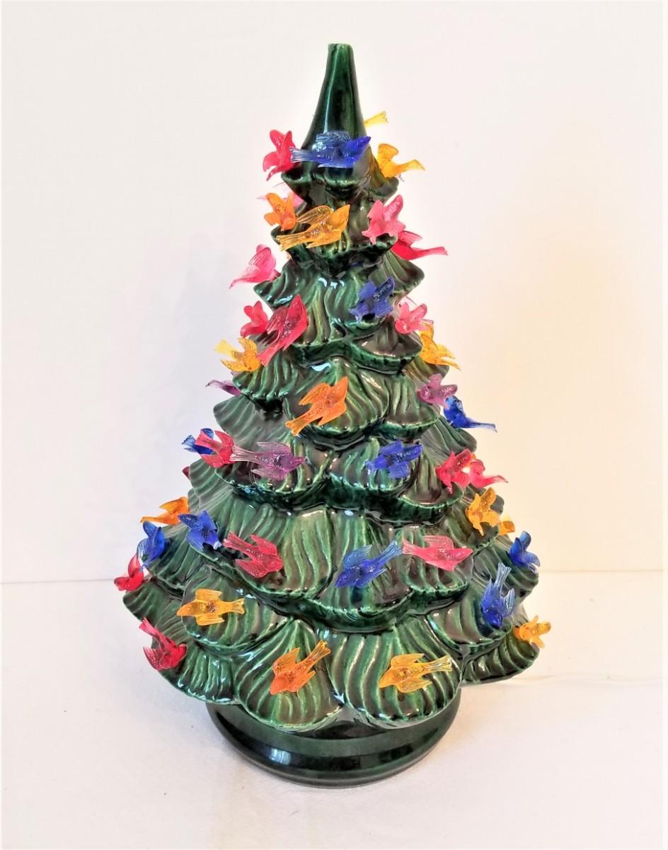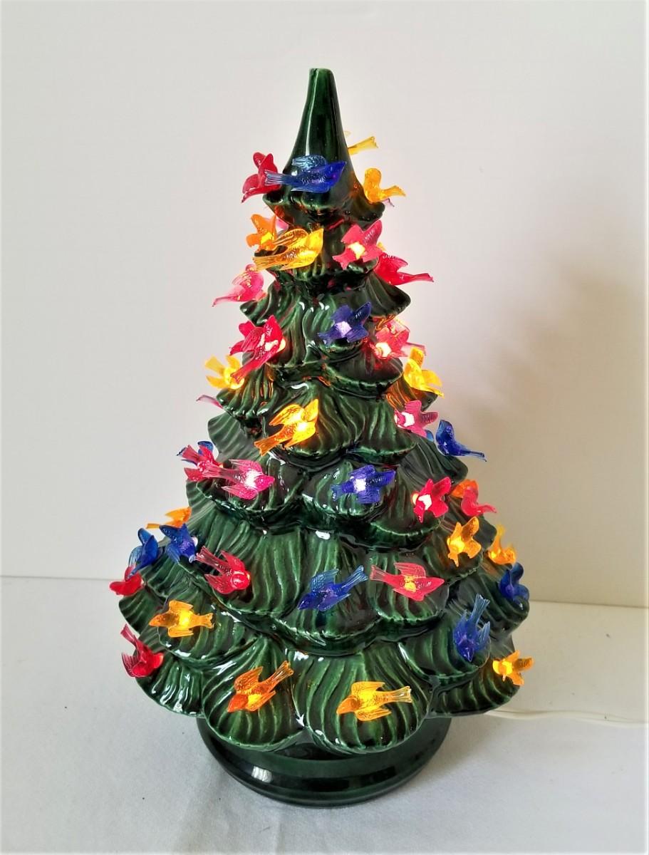 Small vintage ceramic Christmas tree with little bird lights - complete - working condition. No star. Switch on cord. 12" tall