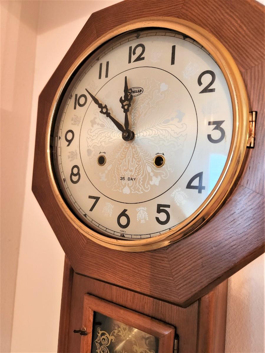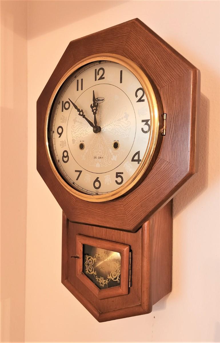 Has key, works, keeps good time, chimes. Vintage STELLA (Korea) wall 35 Day clock - 20" long, 14" across.